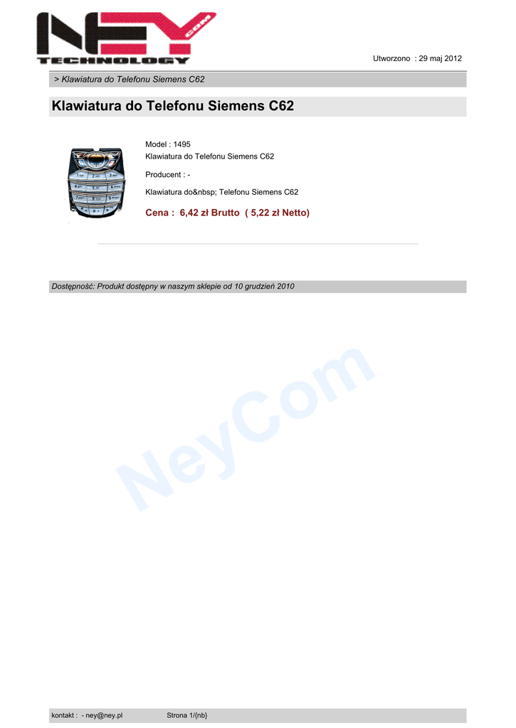 Utworzono : 29 maj 2012 > Klawiatura do Telefonu Siemens C62 Klawiatura do Telefonu Siemens C62 Model : 1495 Klawiatura do Telefonu Siemens C62 Producent : Klawiatura do Telefonu Siemens C62 Cena : 6,42 zł Brutto ( 5,22 zł Netto) Dostępność: Produkt dostępny w naszym sklepie od 10 grudzień 2010 C y m o e N kontakt : - [email protected] Strona 1/{nb}