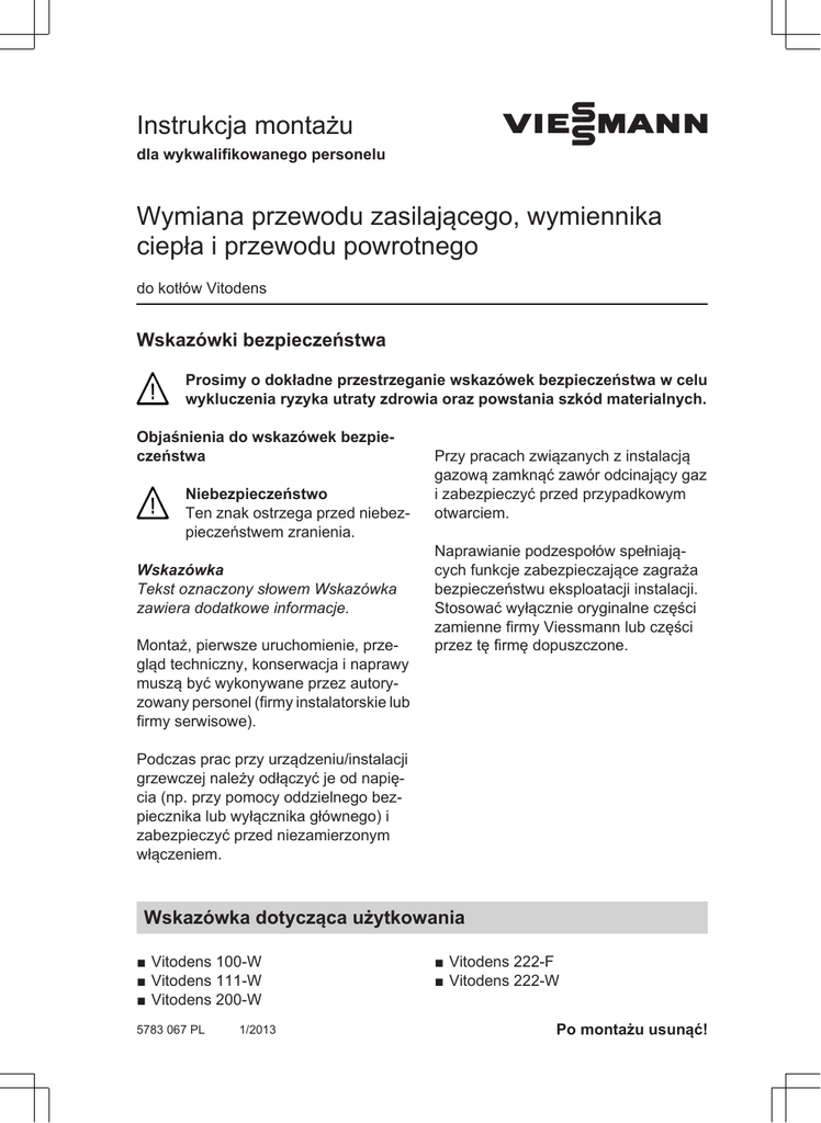 VIESMANN Instrukcja montażu dla wykwalifikowanego personelu Wymiana przewodu zasilającego, wymiennika ciepła i przewodu powrotnego do kotłów Vitodens Wskazówki bezpieczeństwa Prosimy o dokładne przestrzeganie wskazówek bezpieczeństwa w celu wykluczenia ryzyka utraty zdrowia oraz powstania szkód materialnych. Objaśnienia do wskazówek bezpieczeństwa Niebezpieczeństwo Ten znak ostrzega przed niebezpieczeństwem zranienia. Wskazówka Tekst oznaczony słowem Wskazówka zawiera dodatkowe informacje. Montaż, pierwsze uruchomienie, przegląd techniczny, konserwacja i naprawy muszą być wykonywane przez autoryzowany personel (firmy instalatorskie lub firmy serwisowe). Przy pracach związanych z instalacją gazową zamknąć zawór odcinający gaz i zabezpieczyć przed przypadkowym otwarciem. Naprawianie podzespołów spełniających funkcje zabezpieczające zagraża bezpieczeństwu eksploatacji instalacji. Stosować wyłącznie oryginalne części zamienne firmy Viessmann lub części przez tę firmę dopuszczone. Podczas prac przy urządzeniu/instalacji grzewczej należy odłączyć je od napięcia (np. przy pomocy oddzielnego bezpiecznika lub wyłącznika głównego) i zabezpieczyć przed niezamierzonym włączeniem. Wskazówka dotycząca użytkowania ■ Vitodens 100-W ■ Vitodens 111-W ■ Vitodens 200-W 5783 067 PL 1/2013 ■ Vitodens 222-F ■ Vitodens 222-W Po montażu usunąć! Wskazówka dotycząca użytkowania (ciąg dalszy) ■ Vitodens 242-F ■ Vitosolar 200-F Otwarcie i opróżnienie kotła 5783 067 PL Instrukcja montażu i serwisu 2 Wymiana przewodu zasilającego Wskazówka Podczas demontażu może dojść do wycieku pozostałości wody. A B C Na rysunku przedstawiono Vitodens 200-W 1. Zdjąć przewody przyłączeniowe na naczyniu zbiorczym A (jeśli jest) z przewodu zasilającego B. 4. Zdjąć zacisk zabezpieczający i wymontować przewód zasilający B. 2. Zdjąć przewody elektryczne z kolanka przyłączeniowego C. 5. Zamontować przewód zasilający B z nowymi uszczelkami. Nasmarować uszczelki smarem do armatury. Moment dokręcania śruby mocującej: 6 Nm. 5783 067 PL 3. Poluzować śrubę i zdjąć kolanko przyłączeniowe C z wymiennika ciepła. 3 Wymiana przewodu zasilającego (ciąg dalszy) 6. Ponownie zmontować kocioł grzewczy, postępując w odwrotnej kolejności. 7. Napełnić kocioł wodą, przepłukać i sprawdzić szczelność. Instrukcja montażu i serwisu Wymiana wymiennika ciepła Wskazówka Podczas demontażu może dojść do wycieku pozostałości wody. B A C G E F Schemat Vitodens 222-F 4 5783 067 PL D Wymiana wymiennika ciepła (ciąg dalszy) 01. Zdemontować palnik. Instrukcja montażu i serwisu 02. Opróżnić kocioł po stronie wody grzewczej. Instrukcja montażu i serwisu 03. Zdemontować przewód spalin i przewód powietrza dolotowego. 04. Jeżeli jest zainstalowane: Poluzować blachę górną A i zdjąć do przodu. 05. Wyjąć czujnik temperatury spalin B z elementu przyłączeniowego kotła C. 06. Poluzować cztery śruby i wyjąć element przyłączeniowy kotła C. 07. Poluzować bezpiecznik i zdjąć przyłącze kondensatu D z wymiennika ciepła E. 08. Zdjąć przewody elektryczne z przewodu zasilającego F i wymontować przewód zasilający F (patrz strona 3). 11. Poluzować śrubę i zdjąć przewód powrotny G z wymiennika ciepła E. 12. Nałożyć i zamocować nowe kolanko powrotne G z przewodem powrotnym na nowy wymiennik ciepła E. Moment dokręcania śruby mocującej: 6 Nm. 13. Zamontować nowy wymiennik ciepła E. Moment dokręcania nakrętek mocujących 5 Nm. 14. Ponownie zmontować kocioł grzewczy, postępując w odwrotnej kolejności. Zamontować palnik. Momenty dokręcania: ■ Śruby mocujące kolanka przyłączeniowego F: 6 Nm ■ Śruby mocujące palnika: 8,5 Nm ■ Nakrętka kołpakowa przyłącza gazu: 30 Nm Instrukcja montażu i serwisu Wskazówka Na wszystkich przyłączach po stronie gazowej i wodnej założyć nowe uszczelki. 09. Odłączyć przewód powrotny G w odpowiednim miejscu. 5783 067 PL 10. Poluzować trzy nakrętki i wyjąć wymiennik ciepła E z przewodem powrotnym G. 5 Wymiana wymiennika ciepła (ciąg dalszy) 15. Napełnić kocioł wodą, przepłukać (odpowietrzyć) i sprawdzić szczelność. Niebezpieczeństwo Wdychanie spalin może powodować zatrucia zagrażające życiu i zdrowiu. Sprawdzić szczelność elementów prowadzących spaliny. Instrukcja montażu i serwisu Niebezpieczeństwo Ulatnianie się gazu grozi wybuchem. Sprawdzić szczelność elementów, przez które przepływa gaz. Wymiana przewodu powrotnego C 1. Zdemontować palnik, patrz strona 4. A 2. Poluzować obejmy A i wymienić przewód powrotny B. 3. Zamocować nowy przewód powrotny B za pomocą obejm A na kolanku powrotnym C i przyłączu powrotu D. B 4. Zmontować kocioł grzewczy z nowymi uszczelkami, postępując w odwrotnej kolejności (patrz strona 5). A 5783 067 PL D 6 7 5783 067 PL 8 Zmiany techniczne zastrzeżone! 5783 067 PL Viessmann Sp. z o.o. ul. Gen. Ziętka 126 41 - 400 Mysłowice tel.: (0801) 0801 24 (32) 22 20 370 mail: [email protected] www.viessmann.com