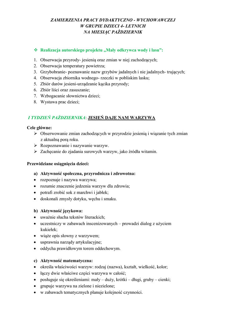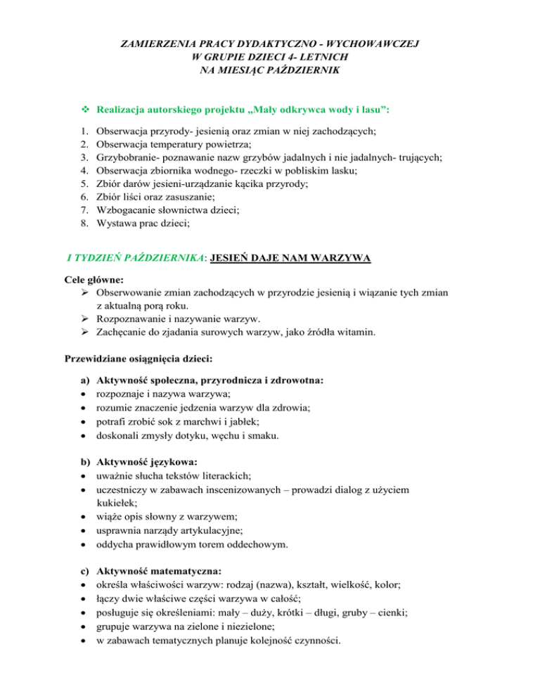 ZAMIERZENIA PRACY DYDAKTYCZNO - WYCHOWAWCZEJ W GRUPIE DZIECI 4- LETNICH NA MIESIĄC PAŹDZIERNIK Realizacja autorskiego projektu „Mały odkrywca wody i lasu”: 1. 2. 3. 4. 5. 6. 7. 8. Obserwacja przyrody- jesienią oraz zmian w niej zachodzących; Obserwacja temperatury powietrza; Grzybobranie- poznawanie nazw grzybów jadalnych i nie jadalnych- trujących; Obserwacja zbiornika wodnego- rzeczki w pobliskim lasku; Zbiór darów jesieni-urządzanie kącika przyrody; Zbiór liści oraz zasuszanie; Wzbogacanie słownictwa dzieci; Wystawa prac dzieci; I TYDZIEŃ PAŹDZIERNIKA: JESIEŃ DAJE NAM WARZYWA Cele główne: Obserwowanie zmian zachodzących w przyrodzie jesienią i wiązanie tych zmian z aktualną porą roku. Rozpoznawanie i nazywanie warzyw. Zachęcanie do zjadania surowych warzyw, jako źródła witamin. Przewidziane osiągnięcia dzieci: a) Aktywność społeczna, przyrodnicza i zdrowotna: rozpoznaje i nazywa warzywa; rozumie znaczenie jedzenia warzyw dla zdrowia; potrafi zrobić sok z marchwi i jabłek; doskonali zmysły dotyku, węchu i smaku. b) Aktywność językowa: uważnie słucha tekstów literackich; uczestniczy w zabawach inscenizowanych – prowadzi dialog z użyciem kukiełek; wiąże opis słowny z warzywem; usprawnia narządy artykulacyjne; oddycha prawidłowym torem oddechowym. c) Aktywność matematyczna: określa właściwości warzyw: rodzaj (nazwa), kształt, wielkość, kolor; łączy dwie właściwe części warzywa w całość; posługuje się określeniami: mały – duży, krótki – długi, gruby – cienki; grupuje warzywa na zielone i niezielone; w zabawach tematycznych planuje kolejność czynności. d) Aktywność plastyczna i techniczna: tworzy kukiełki z warzyw; układa obrazek z części; lepi z masy solnej – odzwierciedla kształt warzyw w formie przestrzennej. e) Aktywność słuchowa i muzyczna: zna i śpiewa piosenkę Urodziny marchewki; ilustruje ruchem treść piosenki; reaguje na sygnały dźwiękowe; odtwarza proste rytmy na instrumencie perkusyjnym – bębenku. f) Aktywność ruchowa: reaguje na sygnały; porusza się w określonym tempie: wolno, szybciej, szybko, i odwrotnie: szybko, wolniej, wolno; porusza się w określonym rytmie: marsz, bieg, podskoki; rozwija ogólną zręczność i zwinność. II TYDZIEŃ PAŹDZIERNIKA: GRZYBY Cele główne: Zwracanie uwagi na zmiany zachodzące w przyrodzie jesienią. Zapoznanie z nowym środowiskiem przyrodniczym - las. Poszerzanie wiedzy przyrodniczej o nazwy grzybów. *Realizacja autorskiego projektu „Mały odkrywca wody i lasu” (realizacja zadań wyznaczonych na porę roku- jesień) Przewidziane osiągnięcia dzieci: a) Aktywność społeczna, przyrodnicza i zdrowotna: zgodnie bawi się wspólnymi zabawkami; po skończonej zabawie odkłada zabawki na miejsce; doskonali zmysł węchu; zna las jako środowisko przyrodnicze – rośliny, zwierzęta; dostrzega zmiany zachodzące w przyrodzie jesienią: zmiana koloru liści, opadanie liści, zmiana temperatury powietrza, grzyby itp.; posługuje się nazwami grzybów: borowik, kurka, muchomor; rozumie określenia: grzyby jadalne, grzyby trujące; zna budowę grzyba – nóżka, kapelusz; uczy się radzić sobie z przegraną. Aktywność językowa: wypowiada się na temat treści obrazków – buduje zdania poprawne gramatycznie; uważnie słucha tekstów literackich; rozwija mięśnie narządów mowy poprzez powtarzanie zgłosek: stuk, puk; auu; uhu; ku, ku; ogląda atlas grzybów, interesuje się książką jako źródłem wiedzy; odgaduje treść obrazka odsłanianego fragmentami; rozumie wieloznaczność wyrazu kurka. b) c) Aktywność matematyczna: liczy w dostępnym zakresie; posługuje się nazwami liczebników głównych i porządkowych; odtwarza liczbę dźwięków za pomocą liczmanów; posługuje się określeniami: mniej, więcej, równo, czyli tyle samo; rozumie określenia: cały, pełny, za mało, brakuje; układa i odwzorowuje rytmiczny układ elementów; odczytuje układy rytmiczne; odwzorowuje układ o powtarzającym się rytmie; stosuje określenia: duży, mały. d) Aktywność plastyczna i techniczna: tworzy obrazek z gotowych elementów; sprawnie posługuje się klejem; maluje farbami; rozprowadza warstwy plasteliny na określonej płaszczyźnie; rysuje krótkie kreski. e) Aktywność słuchowa i muzyczna: reaguje na sygnały dźwiękowe; rozróżnia i liczy dźwięki wygrywane na bębenku; rozpoznaje kolegów po głosie; zna i śpiewa piosenkę Grzybki; rozwija poczucie rytmu; gra na instrumencie perkusyjnym – bębenku; uczestniczy w zabawie ruchowej ze śpiewem. f) Aktywność ruchowa: ilustruje ruchem treść prostych wierszyków; umiejętnie porusza się w gromadce; sprawnie maszeruje, biega, podskakuje; wyczuwa własne ciało i przestrzeń; współdziała w zabawie. III- IV TYDZIEŃ PAŹDZIERNIKA: ZWIERZĘTA SZYKUJĄ SIĘ DO ZIMY Cele główne: Wzbogacanie wiedzy na temat zwierząt żyjących w lesie. Poznanie zwierząt, które zapadają w sen zimowy. Zapoznanie z nazwami ptaków odlatujących do ciepłych krajów. *Realizacja autorskiego projektu „Mały odkrywca wody i lasu” (częściowa realizacja zadań wyznaczonych na porę roku- zima) Przewidziane osiągnięcia dzieci: a) Aktywność społeczna, przyrodnicza i zdrowotna: zna zwierzęta zapadające w sen zimowy: jeż, niedźwiedź, wiewiórka; zna zimowe mieszkania zwierząt: kopczyk z liści, gawra, dziupla; rozumie określenia: zimowy sen zwierząt, gromadzenie zapasów, odlot ptaków; potrafi zadbać o las- sprzątanie lasu; zna ptaki odlatujące do ciepłych krajów: bocian, jaskółka, szpak, skowronek. Aktywność językowa: ogląda albumy przyrodnicze; interesuje się książką jako źródłem wiedzy; uważnie słucha utworów literackich; odgaduje treść obrazka odsłanianego fragmentami; buduje wypowiedź poprawną gramatycznie; poprawnie łączy liczebnik z rzeczownikiem; usprawnia ruchome narządy mowy: wargi, język, policzki oraz podniebieni