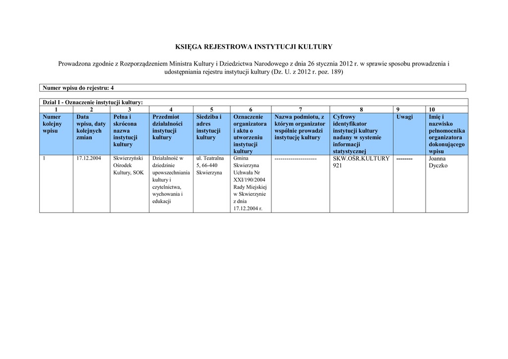 KSIĘGA REJESTROWA INSTYTUCJI KULTURY Prowadzona zgodnie z Rozporządzeniem Ministra Kultury i Dziedzictwa Narodowego z dnia 26 stycznia 2012 r. w sprawie sposobu prowadzenia i udostępniania rejestru instytucji kultury (Dz. U. z 2012 r. poz. 189) Numer wpisu do rejestru: 4 Dział I - Oznaczenie instytucji kultury: 1 2 3 Numer Data Pełna i kolejny wpisu, daty skrócona wpisu kolejnych nazwa zmian instytucji kultury 1 17.12.2004 Skwierzyński Ośrodek Kultury, SOK 4 Przedmiot działalności instytucji kultury 5 Siedziba i adres instytucji kultury 6 Oznaczenie organizatora i aktu o utworzeniu instytucji kultury 7 Nazwa podmiotu, z którym organizator wspólnie prowadzi instytucję kultury Działalność w dziedzinie upowszechniania kultury i czytelnictwa, wychowania i edukacji ul. Teatralna 5, 66-440 Skwierzyna Gmina Skwierzyna Uchwała Nr XXI/190/2004 Rady Miejskiej w Skwierzynie z dnia 17.12.2004 r. --------------------- 8 Cyfrowy identyfikator instytucji kultury nadany w systemie informacji statystycznej SKW.OŚR.KULTURY 921 9 Uwagi -------- 10 Imię i nazwisko pełnomocnika organizatora dokonującego wpisu Joanna Dyczko Dział II - Organizacja instytucji kultury: 1 2 3 Numer Data wpisu, Informacja o kolejny wpisu daty złożeniu do kolejnych rejestru zmian statutu 1 17.12.2004 Uchwała Nr XXI/190/2004 Rady Miejskiej w Skwierzynie z dnia 17.12.2004 r. 4 Imię i nazwisko dyrektora instytucji kultury i jego zastępców lub oznaczenie osoby fizycznej lub prawnej, której powierzono zarządzanie instytucją kultury Maciej Zawidzki 5 Imiona i nazwiska pełnomocników instytucji kultury uprawnionych do dokonywania czynności prawnych w imieniu instytucji oraz zakres ich upoważnień Małgorzata Ptak gł. Księgowa Lilianna Grzebała kierownik biblioteki 6 Nazwa oraz siedziba wyodrębnionych jednostek organizacyjnych instytucji kultury i ich cyfrowe identyfikatory nadane w systemie informacji statystycznej 7 Uwagi 8 Imię i nazwisko pełnomocnika organizatora dokonującego wpisu Joanna Dyczko Dział III – Mienie instytucji kultury: 1 2 Numer kolejny Data wpisu, daty wpisu kolejnych zmian 1 19.03.2007 2 14.03.2008 3 13.03.2009 4 15.03.2010 5 15.03.2011 6. 19.03.2012 7. 21.03.2013 3 Informacja o złożeniu do rejestru rocznego sprawozdania finansowego Złożono sprawozdanie finansowe za 2006 r. Złożono sprawozdanie finansowe za 2007 r. Złożono sprawozdanie finansowe za 2008 r. Złożono sprawozdanie finansowe za 2009 r. Złożono sprawozdanie finansowe za 2010 r. Złożono sprawozdanie finansowe za 2011 r. Złożono sprawozdanie finansowe za 2012 r. 4 Informacja o obciążeniu środków trwałych instytucji kultury ograniczonymi prawami rzeczowymi 5 Uwagi 6 Imię i nazwisko pełnomocnika organizatora dokonującego wpisu Joanna Dyczko Joanna Dyczko Joanna Dyczko Joanna Dyczko Joanna Dyczko Joanna Dyczko Joanna Dyczko Dział IV - Połączenie, podział i likwidacja instytucji kultury: 1 2 3 Numer kolejny wpisu Data wpisu, daty Informacja o połączeniu, kolejnych zmian podziale lub likwidacji instytucji kultury 1 17.12.2004 Od 31.12.2004 r. na podstawie uchwały nr XXI/189/2004 Rady Miejskiej w Skwierzynie z dnia 17.12.2004 r. nastąpiła likwidacja zakładu budżetowego pod nazwą Skwierzyński Ośrodek Kultury, Sportu i Rekreacji w Skwierzynie i utworzenie zakładu budżetowego pod nazwą Ośrodek Sportu i Rekreacji w Skwierzynie 4 Imię i nazwisko likwidatora Ryszard Wilczyński likwidator OSiR w Skwierzynie 5 Uwagi 6 Imię i nazwisko pełnomocnika organizatora dokonującego wpisu Joanna Dyczko