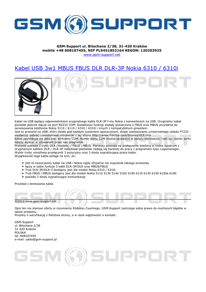 GSM-Support ul. Bitschana 2/38, 31-420 Kraków mobile +48 608107455, NIP PL9451852164 REGON: 120203925 www.gsm-support.net Kabel USB 3w1 MBUS FBUS DLR DLR-3P Nokia 6310 / 6310i Kabel na USB będący odpowiednikiem oryginalnego kabla DLR-3P f-my Nokia z konwerterem na USB. Oryginalny kabel posiadał jedynie złącze na port RS232 COM. Dodatkowo funkcje zostały poszerzone o FBUS oraz MBUS przydatne do serwisowania telefonów Nokia 5110 / 6110 / 6310 / 6310i i innych z kompatybilnym gniazdem. Jest to przewód na USB, który działa pod każdym systemem operacyjnym, dzięki zastosowaniu uniwersalnego układu FT232 wystarczy pobrać i zainstalować sterowniki z tej strony http://www.ftdichip.com/Drivers/VCP.htm Kabel zainstaluje się jako tzw. wirtualny COM. Numer portu COM można sprawdzić w panelu sterowania i taki też numer portu należy wybrać w używanym przez nas programie. Przewód posiada 3 tryby DLR (modem) / FBUS i MBUS. Pierwszy pozwala na podłączenie telefonu w trybie zgodnym z oryginalnym kablem DLR / DLR-3P natomiast pozostałe nadają się bardziej do pracy z programem typu Logomanager. Wybór trybu umożliwia przełącznik 3 pozycyjny oraz 3 diody sygnalizujące pracę kabla. Wyjątkowość tego kabla polega na tym, że: jest to nowoczesny kabel na USB i Nokia nigdy oficjalnie nie wypuściła takiego przewodu łączy w sobie funkcje 3 kabli DLR-3P/DLR oraz MBUS/FBUS Tryb DLR-3P/DLR-3 dostępny jest dla modeli Nokia 6310 / 6310i Tryb FBUS i MBUS dostępny jest dla modeli Nokia 5110 5130 5146 5165 5190 6110 6130 6150 6150e 6190 posiada 3 diody sygnalizujące komunikację Przykład z testowania kabla ©2012 www.gsm-support.net Opis ten nie stanowi oferty w rozumieniu Kodeksu Cywilnego. GSM-Support zastrzega sobie prawo do możliwych błędów w opisie produktu. Prosimy o weryfikację z Państwa strony, a w razie wątpliwości o kontakt. GSM-Support ul. Bitschana 2/38 31-420 Kraków POLSKA tel. 608107455 e-mail: [email protected] Powered by TCPDF (www.tcpdf.org)