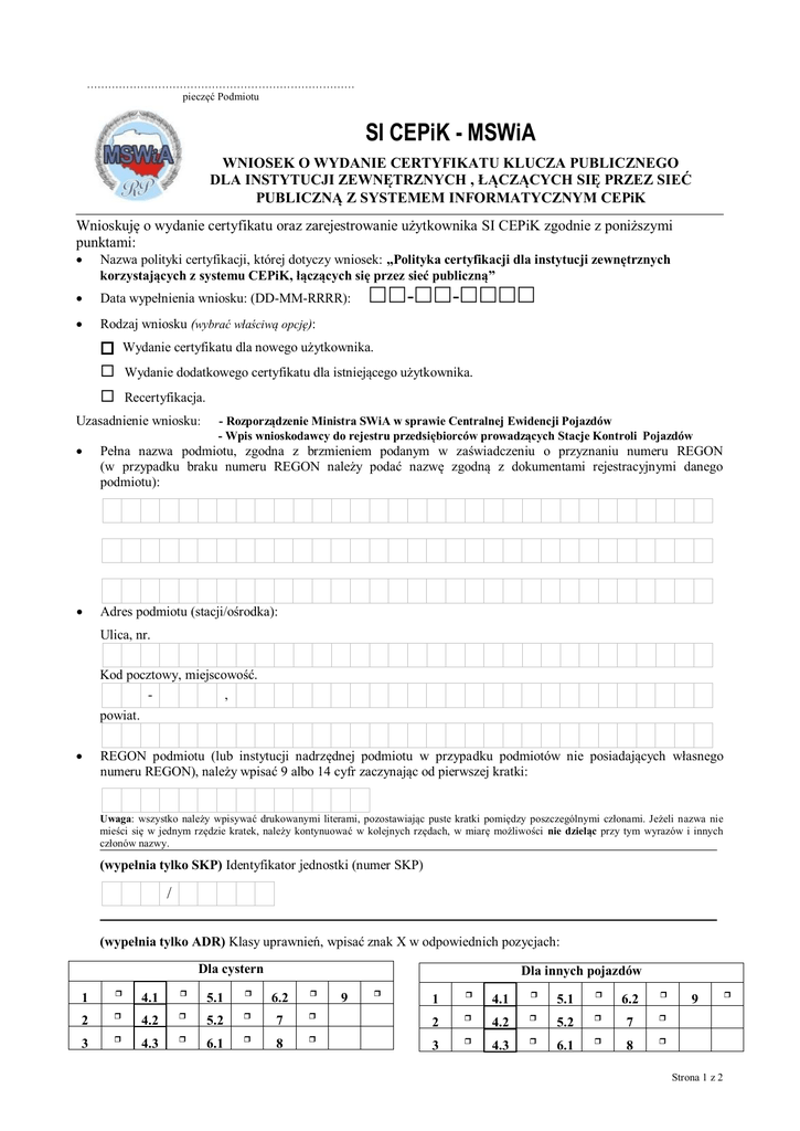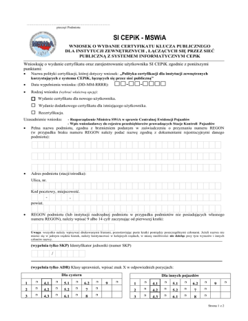 ………………………………………………………………… pieczęć Podmiotu SI CEPiK - MSWiA WNIOSEK O WYDANIE CERTYFIKATU KLUCZA PUBLICZNEGO DLA INSTYTUCJI ZEWNĘTRZNYCH , ŁĄCZĄCYCH SIĘ PRZEZ SIEĆ PUBLICZNĄ Z SYSTEMEM INFORMATYCZNYM CEPiK Wnioskuję o wydanie certyfikatu oraz zarejestrowanie użytkownika SI CEPiK zgodnie z poniższymi punktami: Nazwa polityki certyfikacji, której dotyczy wniosek: „Polityka certyfikacji dla instytucji zewnętrznych korzystających z systemu CEPiK, łączących się przez sieć publiczną” Data wypełnienia wniosku: (DD-MM-RRRR): Rodzaj wniosku (wybrać właściwą opcję): -- Wydanie certyfikatu dla nowego użytkownika. Wydanie dodatkowego certyfikatu dla istniejącego użytkownika. Recertyfikacja. Uzasadnienie wniosku: - Rozporządzenie Ministra SWiA w sprawie Centralnej Ewidencji Pojazdów - Wpis wnioskodawcy do rejestru przedsiębiorców prowadzących Stacje Kontroli Pojazdów Pełna nazwa podmiotu, zgodna z brzmieniem podanym w zaświadczeniu o przyznaniu numeru REGON (w przypadku braku numeru REGON należy podać nazwę zgodną z dokumentami rejestracyjnymi danego podmiotu): Adres podmiotu (stacji/ośrodka): Ulica, nr. Kod pocztowy, miejscowość. , powiat. REGON podmiotu (lub instytucji nadrzędnej podmiotu w przypadku podmiotów nie posiadających własnego numeru REGON), należy wpisać 9 albo 14 cyfr zaczynając od pierwszej kratki: Uwaga: wszystko należy wpisywać drukowanymi literami, pozostawiając puste kratki pomiędzy poszczególnymi członami. Jeżeli nazwa nie mieści się w jednym rzędzie kratek, należy kontynuować w kolejnych rzędach, w miarę możliwości nie dzieląc przy tym wyrazów i innych członów nazwy. (wypełnia tylko SKP) Identyfikator jednostki (numer SKP) / (wypełnia tylko ADR) Klasy uprawnień, wpisać znak X w odpowiednich pozycjach: Dla innych pojazdów Dla cystern 1 4.1 5.1 6.2 2 4.2 5.2 7 3 4.3 6.1 8 9 1 4.1 5.1 6.2 2 4.2 5.2 7 3 4.3 6.1 8 9 Strona 1 z 2 Dane osoby upoważnionej do reprezentowania Podmiotu: Imię, nazwisko ............................................................................................................................... Stanowisko ............................................................................................................................... Tel. kontaktowy ............................................................................................................................... Dane osoby upoważnionej do zarządzania nośnikami kluczy kryptograficznych, kontaktów z CPR w sprawach związanych z certyfikatami, w tym zgłaszania żądań unieważniania, zawieszania i uchylenia zawieszenia certyfikatów: Imię, nazwisko ..................................................................................................................................... Stanowisko ...................................................................................................................................... Tel. kontaktowy ...................................... Adres email: ....................................................................... Dane osoby upoważnionej do odbioru nośników kluczy kryptograficznych lub dostarczenia zgłoszeń certyfikacyjnych i odbioru certyfikatów: Imię, nazwisko ...................................................................................................................................... PESEL: Tel. kontaktowy ...................................... Adres email: ....................................................................... Proszę o wydanie certyfikatu na podstawie (wybrać właściwą opcję): wygenerowanej po stronie CC MSWiA pary kluczy kryptograficznych zgłoszenia certyfikacyjnego w formacie PKCS#10, załączonego na nośniku/ach w liczbie ………… (słownie)………………………… oznaczonych ……..………………………….. Proszę o wydanie 1 certyfikatu/ów: Zakres zastosowania certyfikatu Wnioskowane Podpis cyfrowy Niezaprzeczalność podpisu cyfrowego Szyfrowanie kluczy sesyjnych Uzgadnianie klucza Nadane w certyfikacie (wypełnia CC MSWiA) Przyjmuję do wiadomości uregulowania zawarte w dokumencie „Polityka certyfikacji dla instytucji zewnętrznych korzystających z systemu CEPiK, łączących się przez sieć publiczną”, a z chwilą otrzymania certyfikatów obowiązywać będą zasady w niej zawarte. ………………………dn.………………………. miejscowość data (yyyy-mm-dd) ………………………………………………………. pieczątka i podpis wnioskodawcy lub osoby upoważnionej do reprezentowania wnioskodawcy (zwierzchnik podmiotu) Strona 2 z 2