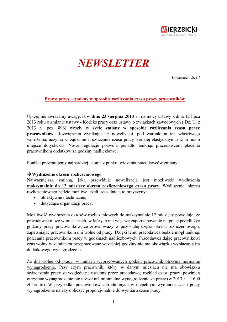 EWSLETTER Wrzesień 2013 Prawo pracy – zmiany w sposobie rozliczania czasu pracy pracowników Uprzejmie zwracamy uwagę, iż w dniu 23 sierpnia 2013 r., na mocy ustawy z dnia 12 lipca 2013 roku o zmianie ustawy - Kodeks pracy oraz ustawy o związkach zawodowych ( Dz. U. z 2013 r., poz. 896) weszły w życie zmiany w sposobie rozliczania czasu pracy pracowników. Rozwiązania wynikające z nowelizacji, pod warunkiem ich właściwego wdrożenia, uczynią zarządzanie i rozliczanie czasu pracy bardziej elastycznym, niż to miało miejsce dotychczas. Nowe regulacje pozwolą ponadto uniknąć pracodawcom płacenia pracownikom dodatków za godziny nadliczbowe. Poniżej prezentujemy najbardziej istotne z punktu widzenia pracodawców zmiany: Wydłużenie okresu rozliczeniowego Najważniejszą zmianą, jaką przewiduje nowelizacja jest możliwość wydłużenia maksymalnie do 12 miesięcy okresu rozliczeniowego czasu pracy. Wydłużenie okresu rozliczeniowego będzie możliwe jeżeli uzasadniają to przyczyny: • obiektywne i techniczne, • dotyczące organizacji pracy. Możliwość wydłużenia okresów rozliczeniowych do maksymalnie 12 miesięcy powoduje, że pracodawca może w miesiącach, w których ma większe zapotrzebowanie na pracę przedłużyć godziny pracy pracowników, co zrównoważy w pozostałej części okresu rozliczeniowego, zapewniając pracownikom dni wolne od pracy. Dzięki temu pracodawca będzie mógł uniknąć polecania pracownikom pracy w godzinach nadliczbowych. Pracodawca dając pracownikowi czas wolny w zamian za przepracowane wcześniej godziny nie ma obowiązku wypłacania im dodatkowego wynagrodzenia. Za dni wolne od pracy, w ramach wypracowanych godzin pracownik otrzyma normalne wynagrodzenie. Przy czym pracownik, który w danym miesiącu nie ma obowiązku świadczenia pracy ze względu na ustalony przez pracodawcę rozkład czasu pracy, powinien otrzymać wynagrodzenie nie niższe niż minimalne wynagrodzenie za pracę (w 2013 r. – 1600 zł brutto). W przypadku pracowników zatrudnionych w niepełnym wymiarze czasu pracy wynagrodzenie należy obliczyć proporcjonalnie do wymiaru czasu pracy. 1 Przykład: Jeżeli okres rozliczeniowy pracownika zatrudnionego w pełnym wymiarze godzin (pełny etat – 8 godzin na dobę, 5 dni roboczych) wynosiłby 2 miesiące, a pracodawca zleciłby pracownikowi pracę po 10 godzin na dobę w pierwszym miesiącu, to w kolejnym musiałby mu tę nadwyżkę zrównoważyć w formie czasu wolnego od pracy np. skracając czas pracy do 6 godzin dziennie. W przypadku przyjęcia 12-miesięcznego okresu rozliczeniowego, możliwe jest ustalenie, że pracownik przez 10 miesięcy będzie pracował po 10 godzin dziennie, a 2 miesiące będzie miał całkowicie wolne od pracy. Takie rozwiązanie jest szczególnie korzystne w przypadku pracodawców, u których w ciągu roku występują sezony wzmożonej pracy oraz miesiące zastoju. Ruchomy czas pracy Nowelizacja wprowadza również możliwość stosowania przez pracodawców ruchomego czasu pracy. W przypadku przyjęcia systemu ruchomego czasu pracy rozkład czasu pracy może przewidywać: • różne godziny rozpoczynania pracy w dniach, które zgodnie z tym rozkładem są dla pracowników dniami pracy (np. we wtorek pracownik rozpoczyna pracę o godz. 9.00, a w środę o godz. 10.30), • przedział czasu, w którym pracownik decyduje o godzinie rozpoczęcia pracy w dniu, który zgodnie z tym rozkładem jest dla pracownika dniem pracy ( np. zostanie określone, że pracownik może według swego uznania przystąpić do pracy w godzinach od 8.00 do 10.00 i skończyć pracę odpowiednio w godzinach 16.00-18.00) Stosując zmodyfikowane regulacje należy pamiętać, że nie mogą one naruszać ustawowego prawa pracownika do odpoczynku zarówno dobowego, jak i tygodniowego (odpowiednio 11 i 35 godzin nieprzerwanego odpoczynku). Ruchomy czas pracy może zostać wprowadzony u pracodawcy na takich samych zasadach jak wydłużone okresy rozliczeniowe. Ponadto może zostać on wprowadzony również na indywidualny pisemny wniosek pracownika. Odpracowywanie zwolnień prywatnych )owelizacja wprowadza również zasadę, że pracą w godzinach nadliczbowych nie będzie odpracowanie przez pracownika zwolnienia od pracy udzielonego mu na jego pisemny wniosek, w celu załatwienia spraw osobistych. Takie odpracowanie nie może jednak naruszać ustawowego prawa pracownika do odpoczynku dobowego i tygodniowego. 2