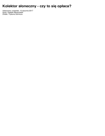 Kolektor słoneczny - czy to się opłaca? Utworzono: czwartek, 12 stycznia 2017 Autor: Kajetan Berezowski Źródło: Trybuna Górnicza Energia słoneczna jest najłatwiej osiągalna spośród odnawialnych źródeł energii. Promieniowanie słoneczne dostępne jest na całej kuli ziemskiej. Czy jednak pod naszą szerokością geograficzną opłaca się inwestować w panele słoneczne? Z tym pytaniem zwróciliśmy się do ekspertów z Wojewódzkiego Funduszu Ochrony Środowiska i Gospodarki Wodnej w Katowicach. W Polsce wykorzystywanie energii promieniowania słonecznego do produkcji ciepłej wody staje się coraz bardziej rozpowszechnione. Urządzeniem, które ma za zadanie przekształcać promienie słoneczne w ciepło, jest kolektor słoneczny. Promienie, przenikając przez przezroczystą szybę kolektora, padają na czarną powłokę absorbera, gdzie zostają zamienione na ciepło. Przy absorberze znajdują się kanaliki, przez które przepływa nośnik ciepła. Pochłania on ciepło i transportuje je w przewodach rurowych do wymiennika ciepła, w którym następuje oddanie ciepła do wewnętrznej instalacji budynku. Płaskie, próżniowe i rurowe - W zależności od konstrukcji rozróżniamy kolektory płaskie, płaskie próżniowe oraz rurowe próżniowe. Kolektor płaski próżniowy różni się od tradycyjnego kolektora płaskiego tym, iż zarówno od góry, jak i od dołu jest zaizolowany przestrzenią z próżnią, co pozwala uzyskać większą sprawność kolektora oraz lepsze wykorzystanie efektu szklarniowego. Kolektor rurowy próżniowy składa się z rur próżniowych, w których element zbierający ciepło, tzw. absorber, znajduje się w próżni, co znacznie poprawia działanie kolektora. Decydując się na określony typ kolektorów, należy być świadomym ich zalet i wad wynikających z konstrukcji. Biorąc pod uwagę wydajność, zdecydowanie korzystniej wypadają tutaj kolektory rurowe próżniowe. Dzięki absorpcji promieniowania rozproszonego i jednocześnie odbitego charakteryzują się stabilną całoroczną pracą, również przy dużym zachmurzeniu oraz niskich temperaturach. Zdecydowanie korzystniej wypada także ewentualny serwis kolektora rurowego próżniowego, w którym możliwa jest wymiana pojedynczych rurek. W przypadku awarii kolektora płaskiego zmuszeni jesteśmy do demontażu i naprawy całego urządzenia – wyjaśnia Szymon Twardoń, doradca energetyczny z Wojewódzkiego Funduszu Ochrony Środowiska i Gospodarki Wodnej w Katowicach. Powyższe zalety kolektorów rurowych próżniowych nad płaskimi okupione są niestety ich wyższą ceną. Koszt zakupu może być wyższy nawet o 100 proc. względem kolektora płaskiego. Również trwałość kolektorów rurowych jest niższa i szacuje się ją na maksymalnie 15 lat. Kolektory płaskie są w stanie pracować średnio o 5 lat dłużej. Ponadto kolektory próżniowe o wydajności energetycznej porównywalnej do płaskich będą zajmowały więcej miejsca na dachu. Istotną zaletą kolektorów płaskich jest możliwość bezproblemowego usuwania z nich śniegu. Najpierw analiza... Wypada zadać pytanie, czy zabudowa instalacji kolektorów słonecznych jest zawsze opłacalna? - Inwestycja w instalację solarną w zależności od typu kolektora zwraca się w okresie od kilku do kilkunastu lat. Decyzja dotycząca zakupu instalacji powinna zostać poprzedzona odpowiednią analizą. Kolektory słoneczne w naszej strefie klimatycznej nie mogą stanowić jedynego systemu grzewczego, a jedynie wspomagać podstawowe źródło ciepłej wody użytkowej. W sytuacji, gdy do przygotowania ciepłej wody użytkowej wykorzystywana jest energia elektryczna, a zużycie wody jest duże, zabudowa instalacji solarnej pozwoli wygenerować widoczne oszczędności energii. Gdy jednak wykorzystujemy do tego celu węgiel kamienny bądź brykiet drzewny, a zużycie ciepłej wody niewielkie, może się okazać, że czas zwrotu inwestycji przekroczy okres trwałości instalacji solarnej. Należy jednak pamiętać, że oprócz aspektów ekonomicznych zabudowa kolektorów słonecznych przynosi również korzyści środowiskowe w postaci redukcji zużycia energii i emisji zanieczyszczeń do atmosfery – wyjaśnia Szymon Twardoń. Wszystkich zainteresowanych tematyką odnawialnych źródeł energii, w tym instalacji solarnych, zachęcamy do skorzystania z bezpłatnych usług doradców energetycznych WFOŚiGW w Katowicach, którzy wykonają dla Państwa analizę opłacalności wykorzystania kolektorów słonecznych jako instalacji wspomagającej pracę głównego źródła ciepła do produkcji ciepłej wody użytkowej oraz przeanalizują dostępne na rynku formy dofinansowania inwestycji związanych z odnawialnymi źródłami energii.