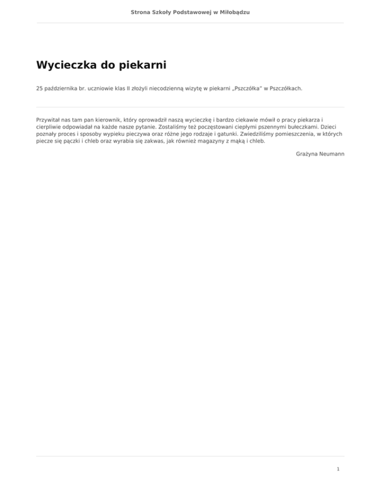 Strona Szkoły Podstawowej w Miłobądzu Wycieczka do piekarni 25 października br. uczniowie klas II złożyli niecodzienną wizytę w piekarni „Pszczółka” w Pszczółkach. Przywitał nas tam pan kierownik, który oprowadził naszą wycieczkę i bardzo ciekawie mówił o pracy piekarza i cierpliwie odpowiadał na każde nasze pytanie. Zostaliśmy też poczęstowani ciepłymi pszennymi bułeczkami. Dzieci poznały proces i sposoby wypieku pieczywa oraz różne jego rodzaje i gatunki. Zwiedziliśmy pomieszczenia, w których piecze się pączki i chleb oraz wyrabia się zakwas, jak również magazyny z mąką i chleb. Grażyna Neumann 1
