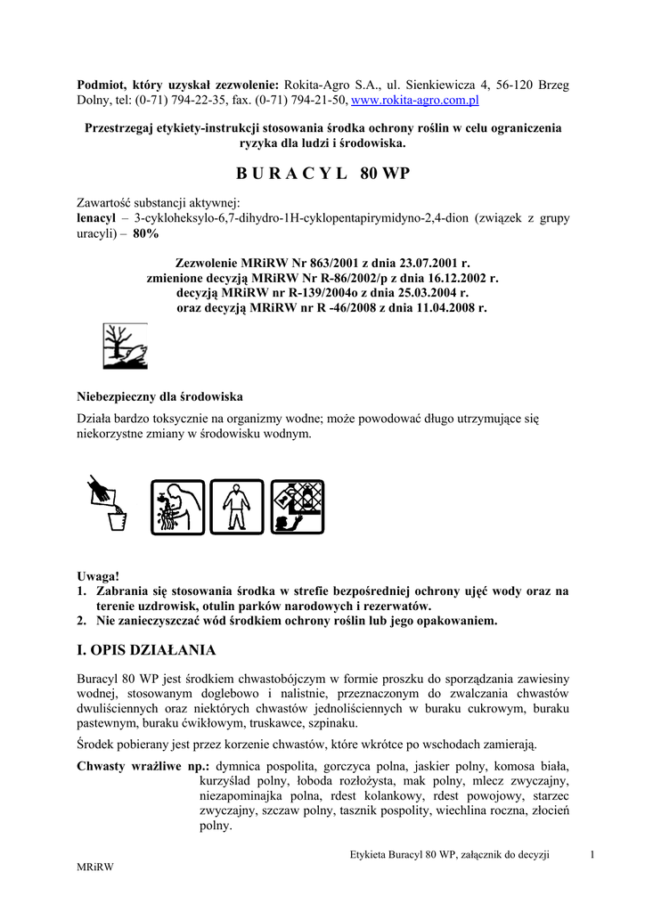 Podmiot, który uzyskał zezwolenie: Rokita-Agro S.A., ul. Sienkiewicza 4, 56-120 Brzeg Dolny, tel: (0-71) 794-22-35, fax. (0-71) 794-21-50, www.rokita-agro.com.pl Przestrzegaj etykiety-instrukcji stosowania środka ochrony roślin w celu ograniczenia ryzyka dla ludzi i środowiska. B U R A C Y L 80 WP Zawartość substancji aktywnej: lenacyl – 3-cykloheksylo-6,7-dihydro-1H-cyklopentapirymidyno-2,4-dion (związek z grupy uracyli) – 80% Zezwolenie MRiRW Nr 863/2001 z dnia 23.07.2001 r. zmienione decyzją MRiRW Nr R-86/2002/p z dnia 16.12.2002 r. decyzją MRiRW nr R-139/2004o z dnia 25.03.2004 r. oraz decyzją MRiRW nr R -46/2008 z dnia 11.04.2008 r. Niebezpieczny dla środowiska Działa bardzo toksycznie na organizmy wodne; może powodować długo utrzymujące się niekorzystne zmiany w środowisku wodnym. Uwaga! 1. Zabrania się stosowania środka w strefie bezpośredniej ochrony ujęć wody oraz na terenie uzdrowisk, otulin parków narodowych i rezerwatów. 2. Nie zanieczyszczać wód środkiem ochrony roślin lub jego opakowaniem. I. OPIS DZIAŁANIA Buracyl 80 WP jest środkiem chwastobójczym w formie proszku do sporządzania zawiesiny wodnej, stosowanym doglebowo i nalistnie, przeznaczonym do zwalczania chwastów dwuliściennych oraz niektórych chwastów jednoliściennych w buraku cukrowym, buraku pastewnym, buraku ćwikłowym, truskawce, szpinaku. Środek pobierany jest przez korzenie chwastów, które wkrótce po wschodach zamierają. Chwasty wrażliwe np.: dymnica pospolita, gorczyca polna, jaskier polny, komosa biała, kurzyślad polny, łoboda rozłożysta, mak polny, mlecz zwyczajny, niezapominajka polna, rdest kolankowy, rdest powojowy, starzec zwyczajny, szczaw polny, tasznik pospolity, wiechlina roczna, złocień polny. Etykieta Buracyl 80 WP, załącznik do decyzji MRiRW 1 Chwasty średnio wrażliwe np.: chwastnica jednostronna, jasnota purpurowa, jasnota różowa, pokrzywa żegawka, przetacznik bluszczykowy, przetacznik perski, wilczomlecze. Chwasty odporne np.: przytulia czepna, szarłat szorstki i inne gatunki chwastów dwuliściennych wieloletnich lub głęboko korzeniących się. II. ZAKRES STOSOWANIA, TERMINY I DAWKI Uwagi: 1. Środka nie stosować na glebach lekkich o niskiej zawartości próchnicy 2. Wyższe z zalecanych dawek stosować na glebach ciężkich. 3. Środek stosowany przedsiewnie bezpośrednio po opryskaniu pola wymieszać z glebą na głębokość 2-3 cm. Jeżeli gleba pod zasiew jest dobrze przygotowana, wystarczy jednorazowe bronowanie pola. Glebę suchą zaleca się bronować dwukrotnie. Działanie środka uzależnione jest od stopnia wilgotności gleby, która sprzyja równomiernemu rozmieszczeniu substancji aktywnej w glebie. 4. Opady deszczu w ciągu dwóch tygodni po zabiegu sprzyjają skutecznemu zwalczaniu chwastów i są pożądane nawet wówczas, gdy gleba w czasie zabiegu była wilgotna. W przypadku obfitych opadów deszczu, przedawkowania środka lub wymieszania go z glebą zbyt głęboko, może wystąpić przejściowe zahamowanie wzrostu roślin. 5. Do 3 miesięcy po wykonaniu zabiegu środkiem Buracyl 80 WP nie stosować innych herbicydów. 1. BURAK CUKROWY, BURAK PASTEWNY. Środek można stosować przedwschodowo: 1. przed wysiewem buraków Zalecana dawka: 0,75 kg/ha. Po opryskaniu glebę wymieszać broną do głębokości 2-3 cm. 2. do 3 dni po wysiewie buraków ale przed ich skiełkowaniem Zalecana dawka: 1 kg/ha. Nasiona buraków wysiewać na jednakową głębokość 2-2,5 cm. Zalecana ilość wody: 200-300 l/ha. Zalecane opryskiwanie: średniokropliste. 2. BURAK ĆWIKŁOWY. Opryskiwać do 3 dni po siewie buraków, ale przed ich skiełkowaniem. Zalecana dawka: 0,75-1,25 kg/ha. Zalecana ilość wody: 200-300 l/ha. Zalecane opryskiwanie: średniokropliste. UWAGA! BURAKÓW ĆWIKŁOWYCH NIE PRZERYWAĆ NA BOTWINĘ. 3. SZPINAK. Etykieta Buracyl 80 WP, załącznik do decyzji MRiRW 2 Opryskiwać przed siewem niezależnie od terminu siewu szpinaku (wiosenny, letni, jesienny). Zalecana dawka: 0,75-1,25 kg/ha. Po zbiorze szpinaku wysiewanego wiosną można uprawiać tylko buraki, natomiast po zbiorze szpinaku z siewu jesiennego - buraki lub warzywa z rozsady. Zalecana ilość wody: 200-300 l/ha. Zalecane opryskiwanie: średniokropliste. 4. TRUSKAWKA. Plantacje nowo założone opryskiwać w 10-12 dni po posadzeniu. Zalecana dawka: 0,5-1 kg/ha. Plantacje jednoroczne i starsze opryskiwać wiosną po rozpoczęciu wegetacji. Zalecana dawka: 1,5-2 kg/ha. Opryskiwać nie później, niż 50 dni przed terminem zbioru pierwszych owoców. Zalecana ilość wody: 200-300 l/ha. Zalecane opryskiwanie: średniokropliste. NASTĘPSTWO ROŚLIN Jeżeli potraktowana środkiem plantacja z jakichkolwiek powodów (nierównomierne wschody, uszkodzenia przez choroby lub szkodniki) musi być powtórnie obsiana, zaleca się wysiew buraka cukrowego lub pastewnego bez ponownego opryskiwania środkiem Buracyl 80 WP. Kukurydzę i ziemniak można uprawiać po wykonaniu głębokiej orki (ponad 20 cm). W roku zastosowania środka Buracyl 80 WP nie wysiewać zbóż ozimych. Jeżeli w okresie wegetacji wystąpiła susza, to przed siewem zbóż jarych wiosną następnego roku wykonać głęboką orkę przedzimową (ponad 20 cm). III. OKRES PREWENCJI DLA LUDZI I PSZCZÓŁ (okres zapobiegający zatruciu): nie dotyczy OKRES PREWENCJI DLA ZWIERZĄT (okres zapobiegający zatruciu): 14 DNI IV. OKRES KARENCJI (okres od dnia ostatniego zabiegu do dnia zbioru roślin przeznaczonych do konsumpcji): burak cukrowy, burak pastewny, burak ćwikłowy, szpinak, truskawka – nie dotyczy V. PRZECIWWSKAZANIA Środka nie stosować na glebach lekkich o niskiej zawartości próchnicy Podczas stosowania środka nie dopuścić do: znoszenia cieczy użytkowej na sąsiednie rośliny uprawne nakładania się cieczy użytkowej na stykach pasów zabiegowych i uwrociach. Etykieta Buracyl 80 WP, załącznik do decyzji MRiRW 3 VI. SPORZĄDZANIE CIECZY UŻYTKOWEJ Przed przystąpieniem do sporządzenia cieczy 