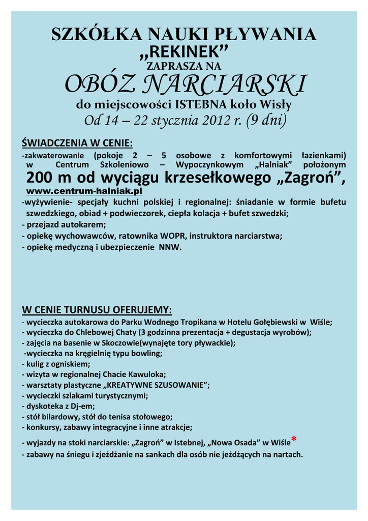 SZKÓŁKA NAUKI PŁYWANIA „REKINEK” ZAPRASZA NA OBÓZ NARCIARSKI do miejscowości ISTEBNA koło Wisły Od 14 – 22 stycznia 2012 r. (9 dni) ŚWIADCZENIA W CENIE: -zakwaterowanie w Centrum (pokoje 2 – 5 Szkoleniowo – osobowe z komfortowymi Wypoczynkowym „Halniak” łazienkami) położonym 200 m od wyciągu krzesełkowego „Zagroń”, www.centrum-halniak.pl -wyżywienie- specjały kuchni polskiej i regionalnej: śniadanie w formie bufetu szwedzkiego, obiad + podwieczorek, ciepła kolacja + bufet szwedzki; - przejazd autokarem; - opiekę wychowawców, ratownika WOPR, instruktora narciarstwa; - opiekę medyczną i ubezpieczenie NNW. W CENIE TURNUSU OFERUJEMY: - wycieczka autokarowa do Parku Wodnego Tropikana w Hotelu Gołębiewski w Wiśle; - wycieczka do Chlebowej Chaty (3 godzinna prezentacja + degustacja wyrobów); - zajęcia na basenie w Skoczowie(wynajęte tory pływackie); -wycieczka na kręgielnię typu bowling; - kulig z ogniskiem; - wizyta w regionalnej Chacie Kawuloka; - warsztaty plastyczne „KREATYWNE SZUSOWANIE”; - wycieczki szlakami turystycznymi; - dyskoteka z Dj-em; - stół bilardowy, stół do tenisa stołowego; - konkursy, zabawy integracyjne i inne atrakcje; - wyjazdy na stoki narciarskie: „Zagroń” w Istebnej, „Nowa Osada” w Wiśle* - zabawy na śniegu i zjeżdżanie na sankach dla osób nie jeżdżących na nartach. * Dla osób zainteresowanych lekcjami nauki jazdy na nartach,, zostaną zorganizowane zajęcia, łączny ich koszt to 150 zł, kwotę tą należy doliczyć do ceny podstawowej zimowiska. Na miejscu istnieje możliwość wypożyczenia sprzętu narciarskiego: Narty + buty + kije + kask (obowiązkowy do lat 15) – 180 zł na cały pobyt. Koszt karnetów zjazdowych – ok. 240 zł na cały pobyt. ZGŁOSZENIA: mailem: Zgłoszenia dzieci przyjmujemy e-mailem: [email protected] lub [email protected] (w treści prosimy wpisać imię i nazwisko dziecka, telefon kontaktowy do Państwa, miejsce i termin wyjazdu) ZGŁOSZENIA I INFORMACJE: Joanna Tarułka nr tel. 502 438 655 Po dokonaniu zgłoszenia i opłacie I raty wysyłamy Państwu ee-mailem mailem karty uczestnika kolonii. Zwrotu kart należy dokonaćć obowiązkowo do dnia 7.01.2012 r. CENA TURNUSU: 1140 ZŁ I WPŁATA 500 ZŁ – przy zapisie dziecka; II WPŁATA 640 ZŁ LUB 790 ZŁ( ZŁ(Z NAUKĄ JAZDY NA NARTACH)– NARTACH DO 05.01.2012r. (DLA DLA STAŁYCH KLIENTÓW I DZIECI ZE SZKÓŁKI „REKINEK” 40 0 ZŁ Z RABATU) KADRA NA OBOZIE: ADAM TARUŁKA (kierownik obozu, instruktor pływania na pływalni przy ul. Conrada 6 w Warszawie) AGNIESZKA MAGIERA (nauczyciel w SP Nr 341 w Warszawie) KATARZYNA MICHALAK (instruktor narciarstwa, nauczyciel w SP Nr 2 w Ożarowie Mazowieckim) WPŁATY NALEŻY DOKONYWAĆ NA KONTO: Nauka Pływania „Rekinek 2” Monika Biała 01 – 494 Warszawa ul. Wolfkego 2 m 45 Nr konta: 36 1160 2202 0000 0000 7934 8775 (w tytule imię i nazwisko uczestnika OBOZU) nasza strona: www.rekinek.com