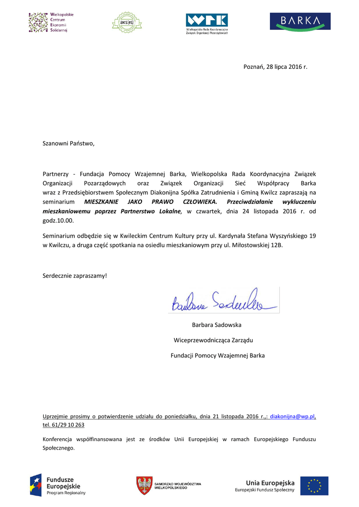 Poznań, 28 lipca 2016 r. Szanowni Państwo, Partnerzy - Fundacja Pomocy Wzajemnej Barka, Wielkopolska Rada Koordynacyjna Związek Organizacji Pozarządowych oraz Związek Organizacji Sieć Współpracy Barka wraz z Przedsiębiorstwem Społecznym Diakonijna Spółka Zatrudnienia i Gminą Kwilcz zapraszają na seminarium MIESZKANIE JAKO PRAWO CZŁOWIEKA. Przeciwdziałanie wykluczeniu mieszkaniowemu poprzez Partnerstwo Lokalne, w czwartek, dnia 24 listopada 2016 r. od godz.10.00. Seminarium odbędzie się w Kwileckim Centrum Kultury przy ul. Kardynała Stefana Wyszyńskiego 19 w Kwilczu, a druga część spotkania na osiedlu mieszkaniowym przy ul. Miłostowskiej 12B. Serdecznie zapraszamy! Barbara Sadowska Wiceprzewodnicząca Zarządu Fundacji Pomocy Wzajemnej Barka Uprzejmie prosimy o potwierdzenie udziału do poniedziałku, dnia 21 listopada 2016 r.,: [email protected], tel. 61/29 10 263 Konferencja współfinansowana jest ze środków Unii Europejskiej w ramach Europejskiego Funduszu Społecznego.