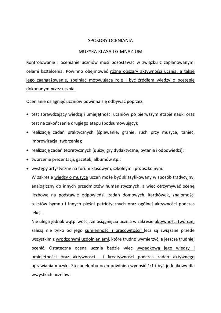 SPOSOBY OCENIANIA MUZYKA KLASA I GIMNAZJUM Kontrolowanie i ocenianie uczniów musi pozostawać w związku z zaplanowanymi celami kształcenia. Powinno obejmować różne obszary aktywności ucznia, a także jego zaangażowanie, spełniać motywującą rolę i być źródłem wiedzy o postępie dokonanym przez ucznia. Ocenianie osiągnięć uczniów powinna się odbywać poprzez: test sprawdzający wiedzę i umiejętności uczniów po pierwszym etapie nauki oraz test na zakończenie drugiego etapu (podsumowujący); realizację zadań praktycznych (śpiewanie, granie, ruch przy muzyce, taniec, improwizacja, tworzenie); realizację zadań teoretycznych (quizy, gry dydaktyczne, pytania i odpowiedzi); tworzenie prezentacji, gazetek, albumów itp.; występy artystyczne na forum klasowym, szkolnym i pozaszkolnym. W zakresie wiedzy o muzyce uczeń może być sklasyfikowany w sposób tradycyjny, analogiczny do innych przedmiotów humanistycznych, a wiec otrzymywać ocenę liczbową na podstawie odpowiedzi, zadań domowych, kartkówek, znajomości tekstów hymnu i innych pieśni patriotycznych oraz ogólnej aktywności podczas lekcji. Nie ulega jednak wątpliwości, że osiągnięcia ucznia w zakresie aktywności twórczej zależą nie tylko od jego sumienności i pracowitości, lecz są związane przede wszystkim z wrodzonymi uzdolnieniami, które trudno wymierzyć, a jeszcze trudniej ocenić. Ostateczna ocena ucznia będzie więc wypadkową jego wiedzy i umiejętności oraz aktywności i kreatywności podczas zadań aktywnego uprawiania muzyki. Stosunek obu ocen powinien wynosić 1:1 i być jednakowy dla wszystkich uczniów. Rzeczywiste sposoby oceniania, stosowane przez konkretnego nauczyciela w danej szkole, należy przygotować w zgodzie z przedmiotowym systemem oceniania obowiązującym w konkretnej placówce, a przede wszystkim z przyjętym w niej wewnątrzszkolnym systemem oceniania, który jest częścią statutu szkoły. Postępy ucznia w przedmiocie muzyka są bardzo trudne do oceny. Nie należy bowiem zapominać, że głównym celem nauczania jest zachęcenie ucznia do odbioru i aktywnego uprawiania muzyki. Ostateczna ocena ucznia będzie więc wypadkową jego wiedzy i umiejętności oraz aktywności i kreatywności podczas uprawiania muzyki. Dopuszcza się stosowanie znaków ,,+” ,,-” w bieżącym ocenianiu. Uczeń ma prawo 3krotnie zgłosić przed lekcją nieprzygotowanie w semestrze bez konsekwencji. Za przewidywaną ocenę semestralną i roczną przyjmuje się ocenę proponowaną przez nauczyciela zgodnie z terminem ustalonym a Statucie Szkoły. Uczeń może ubiegać się o podwyższenie przewidywanej oceny tylko o jeden stopień i tylko w przypadku, gdy co najmniej połowa uzyskanych przez jego ocen cząstkowych jest równa ocenie, o którą się ubiega lub wyższa. Uczeń ubiegający się o podwyższenie oceny zwraca się z pisemna prośbą z formie podania do wychowawcy klasy w ciągu 7 dni od ostatecznego terminu poinformowania uczniów o przewidywanych ocenach rocznych. Wychowawca klasy sprawdza spełnienie wymogu w ust.4 pkt 1i 2, a nauczyciel przedmiotu spełnienie wymogów ust,4 pkt3,4 i 5. W przypadku spełnienia przez ucznia wszystkich wymogów z ust. 4, nauczyciel przedmiotu wyraża zgodę na przystąpienie do poprawy oceny. Uczeń spełniający wszystkie warunki najpóźniej 7 dni przed klasyfikacyjnym posiedzeniem Rady Pedagogicznej przystępuje do przygotowanego przez nauczyciela przedmiotu dodatkowego sprawdzianu pisemnego lub ustnego. Sprawdzian oceniony zgodnie a przedmiotowym systemem oceniania, zostaje dołączony do dokumentacji wychowawcy klasy. Poprawa oceny rocznej może nastąpić jedynie w przypadku, gdy sprawdzian został zaliczony na ocenę, o którą ubiega się uczeń lub wyższą. Ostateczna ocena roczna nie może być niższa od oceny proponowanej, niezależnie od wyników sprawdzianu, do którego przystąpił uczeń w ramach poprawy.