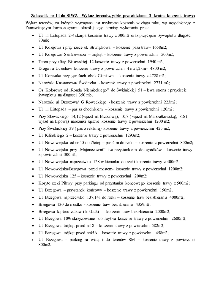 Załącznik nr 14 do SIWZ - Wykaz terenów, gdzie przewidziano 3- krotne koszenie trawy: Wykaz terenów, na których wymagane jest trzykrotne koszenie w ciągu roku, wg uzgodnionego z Zamawiającym harmonogramu określającego terminy wykonania prac: Ul. 11 Listopada 2-4 skarpa koszenie trawy z 300m2 oraz przycięcie żywopłotu długości 70mb; Ul. Kolejowa i przy rzece ul. Strumykowa – koszenie pasa traw– 1658m2; Ul. Kolejowa/ Sienkiewicza – trójkąt – koszenie trawy z powierzchni 500m2; Teren przy ulicy Bielawskiej 12 koszenie trawy z powierzchni 1940 m2; Droga na Uciechów koszenie trawy z powierzchni 4 mx1,2km= 4800 m2; Ul. Korczaka przy garażach obok Ciepłowni - koszenie trawy z 4728 m2; Narożnik Kasztanowa/ Świdnicka - koszenie trawy z powierzchni 2731 m2; Os. Kolorowe od „Ronda Niemieckiego” do Świdnickiej 51 – lewa strona : przycięcie żywopłotu na długości 350 mb; Narożnik ul. Brzozowa/ G. Roweckiego - koszenie trawy z powierzchni 223m2; Ul. 11 Listopada – pas za chodnikiem – koszenie trawy z powierzchni 120m2; Przy Słowackiego 14,12 (wjazd na Brzozową), 10,8 ( wjazd na Marszałkowską), 8,6 ( wjazd na Lipową) narożniki łącznie koszenie trawy z powierzchni 1200 m2; Przy Świdnickiej 39 ( pas z reklamą) koszenie trawy z powierzchni 425 m2; Ul. Kilińskiego 2 – koszenie trawy z powierzchni 1293m2; Ul. Nowowiejska od nr 15 do Złotej – pas 4 m do rzeki – koszenie z powierzchni 800m2; Ul. Nowowiejska przy „Majonezowni” i za przystankiem do ogródków – koszenie trawy z powierzchni 300m2; Ul. Nowowiejska naprzeciwko 128 w kierunku do rzeki koszenie trawy z 400m2; Ul. Nowowiejska/Brzegowa przed mostem- koszenie trawy z powierzchni 1200m2; Ul. Nowowiejska 125 – koszenie trawy z powierzchni 200m2; Koryto rzeki Piławy przy parkingu od przystanku końcowego koszenie trawy z 500m2; Ul. Brzegowa – przystanek końcowy – koszenie trawy z powierzchni 150m2; Ul. Brzegowa naprzeciwko 137,141 do rzeki – koszenie traw bez zbierania 4000m2; Brzegowa 130 do mostku - koszenie traw bez zbierania 4359m2; Brzegowa k.placu zabaw i k.kładki – - koszenie traw bez zbierania 2000m2; Ul. Brzegowa 109/ skrzyżowanie do Taylora koszenie trawy z powierzchni 2600m2; Ul. Brzegowa trójkąt przed nr18 – koszenie trawy z powierzchni 582m2; Ul. Brzegowa trójkąt przed nr45A – koszenie trawy z powierzchni 458m2; Ul. Brzegowa - parking za wiatą i do terenów SM – koszenie trawy z powierzchni 800m2.