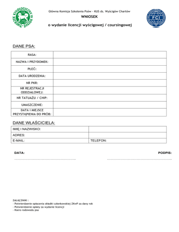 Główna Komisja Szkolenia Psów - KUS ds. Wyścigów Chartów WNIOSEK o wydanie licencji wyścigowej / coursingowej DANE PSA: RASA: NAZWA I PRZYDOMEK: PŁEĆ: DATA URODZENIA: NR PKR: NR REJESTRACJI ODDZIAŁOWEJ: NR TATUAŻU / CHIP: UMASZCZENIE: DATA I MIEJSCE PRZYSTĄPIENIA DO PRÓB: DANE WŁAŚCICIELA: IMIĘ I NAZWISKO: ADRES: E-MAIL: TELEFON: DATA: ……………………………………………….. ZAŁĄCZNIKI : - Potwierdzenie opłacenia składki członkowskiej ZKwP za dany rok - Potwierdzenie opłaty za wydanie licencji - Ksero rodowodu psa PODPIS: …………………………………………………..