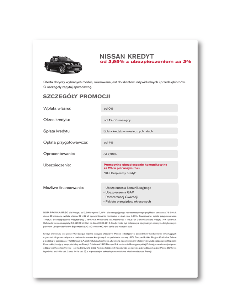 od 2,99% z ubezpieczeniem za 2% Oferta dotyczy wybranych modeli, skierowana jest do klientów indywidualnych i przedsiębiorców. O szczegóły zapytaj sprzedawcę. SZCZEGÓŁY PROMOCJI Wpłata własna: od 0% Okres kredytu: od 12-60 miesięcy Spłata kredytu Spłata kredytu w miesięcznych ratach Opłata przygotowawcza: od 4% Oprocentowanie: od 2,99% Ubezpieczenie: Promocyjne ubezpieczenie komunikacyjne za 2% w pierwszym roku “RCI Bezpieczny Kredyt” Możliwe finansowanie: - Ubezpieczenia komunikacyjnego - Ubezpieczenia GAP - Rozszerzonej Gwaracji - Pakietu przeglądów okresowych NOTA PRAWNA: RRSO dla Kredytu od 2,99% wynosi 7,11% dla następującego reprezentatywnego przykładu: cena auta 73 916 zł, okres 48 miesięcy, wpłata własna 27 497 zł, oprocentowanie nominalne w skali roku 4,99%, finansowane: opłata przygotowawcza 1 856,77 zł i ubezpieczenie kredytobiorcy 2 780,70 zł. Miesięczna rata kredytowa: 1 175,57 zł. Całkowita kwota kredytu : 49 199,95 zł. Całkowita kwota do zapłaty: 56 427,30 zł. Stan na dzień 01.04.2016. Kredyt może być połączony z opcjonalnym, rocznym, dedykowanym pakietem ubezpieczeniowym Ergo Hestia (OC/AC/NNW/HCA) w cenie 2% wartości auta. Kredyt oferowany jest przez RCI Banque Spółka Akcyjna Oddział w Polsce i dostępny u pośredników kredytowych wykonujących czynności faktyczne związane z zawieraniem umów kredytowych na podstawie umowy z RCI Banque Spółka Akcyjna Oddział w Polsce z siedzibą w Warszawie. RCI Banque S.A. jest instytucją kredytową utworzoną za zezwoleniem właściwych władz nadzorczych Republiki Francuskiej i mającą swoją siedzibę we Francji. Działalność RCI Banque S.A. na terenie Rzeczypospolitej Polskiej prowadzona jest przez oddział instytucji kredytowej i jest nadzorowana przez Komisję Nadzoru Finansowego w zakresie przewidzianym przez Prawo Bankowe (zgodnie z art.141c ust. 2 oraz 141a ust. 2), a w pozostałym zakresie przez właściwe władze nadzorcze Francji.