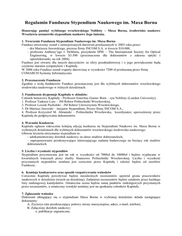 Regulamin Funduszu Stypendium Naukowego im. Maxa Borna Honorując pamięć wybitnego wrocławskiego Noblisty – Maxa Borna, środowisko naukowe Wrocławia ustanowiło stypendium naukowe Jego imienia. 1. Tworzenie Funduszu Stypendium Naukowego im. Maxa Borna Fundusz utworzony został z zainicjowanych darowizn przekazanych w 2003 roku przez: – dra Mariusza Jaworskiego, prezesa firmy INCOM S.A. w kwocie $10.000, – profesora Anthony’ego J. DeMaria, prezydenta SPIE – The International Society for Optical Engineering, w kwocie $3.500 (przeznaczone dla doktorantów z zakresu optyki i optoelektroniki, na rok 2004) Fundusz jest otwarty dla innych darczyńców ze sfery pozabudŜetowej i o jego powiększenie będą czynione starania sympatyków i Kapituły. W 2006 roku Fundusz został wsparty darowizną w wysokości 7200 zł przekazaną przez firmę COMARCH Systemy Informatyczne. 2. Przeznaczenie Funduszu Zgodnie z wolą fundatorów Fundusz przeznaczony jest dla wybitnych doktorantów wrocławskiego środowiska naukowego w róŜnych dziedzinach. 3. Funduszem dysponuje Kapituła w składzie: Członek honorowy Kapituły - Professor Emeritus Gustav Born – syn Noblisty (London University), 1. Profesor Tadeusz Luty – JM Rektor Politechniki Wrocławskiej, 2. Profesor Leszek Pacholski - JM Rektor Uniwersytetu Wrocławskiego, 3. Dr Mariusz Jaworski – inicjator Stypendium, Prezes firmy INCOM S.A., 4. Profesor Krzysztof M. Abramski – Politechnika Wrocławska, koordynator, upowaŜniony przez Kapitułę do podpisywania dokumentów. 4. Warunki Konkursu Kapituła ogłasza rokrocznie kolejną edycję konkursu na Stypendium Naukowe im. Maxa Borna w wybranych dziedzinach dla wybitnych doktorantów wrocławskiego środowiska naukowego. Główne kryteria otrzymania stypendium to: – udokumentowany dorobek naukowy za okres studiów doktoranckich, – zaproponowanie przekonywująco interesującego zadania badawczego na bieŜący rok studiów doktoranckich. 5. Liczba i wysokość stypendiów Stypendium przyznawane jest na rok w wysokości od 7000zł do 10000zł i będzie wypłacane w kwartalnych transzach przez słuŜby finansowe Politechniki Wrocławskiej. Liczba i wysokość przyznanych stypendiów ustalana jest corocznie przez Kapitułę i zaleŜeć będzie od zasobów Funduszu. 6. Komisja konkursowa oraz sposób rozpatrywania wniosków Corocznie Kapituła powoływać będzie niezaleŜnych recenzentów spośród grona pracowników naukowych w dziedzinie (trzech na dziedzinę). Zadaniem recenzentów będzie ustalenie przez kaŜdego listy rankingowej kandydatów. Ostateczna ocena będzie sumą punktów rankingowych przyznanych przez recenzentów, a ostateczny werdykt ustalany jest na spotkaniu członków Kapituły. 7. Zgłaszanie wniosku Doktorant ubiegający się o stypendium Maxa Borna w wybranej dziedzinie składa następujące dokumenty: A. śyciorys (nie przekraczający połowy strony maszynopisu, adres, e-mail, telefon), B. Załączony dorobek naukowy: a. publikacje zagraniczne, b. publikacje krajowe, c. konferencje zagraniczne, d. konferencje krajowe, e. patenty lub zgłoszenia patentowe, f. inne (podręczniki, monografie, druki zwarte, skrypty), C. Krótką, nie przekraczającą 250 słów, opinię promotora D. Krótki, z zaznaczoną dziedziną, zaopatrzony tytułem, nie przekraczający jednej strony maszynopisu, opis zadania naukowego na bieŜący rok studiów doktoranckich. Wniosek naleŜy składać na adres koordynatora: Profesor Krzysztof M. Abramski Instytut Telekomunikacji i Akustyki Politechnika Wrocławska 50-370 Wrocław WybrzeŜe Wyspiańskiego 27 z dopiskiem - Stypendium im. Maxa Borna tel. (71) 320 30 24 fax (71) 320 31 89 e-mail: Krzysztof. [email protected] 8. Termin składania podań - koniec października kaŜdego roku. 10. Sposób publicznego ogłoszenia konkursu ogłaszanie coroczne konkursu dostępne jest na stronie internetowej www.mborn-scholar.wroc.pl Ponadto ogłoszenia o Konkursie umieszczane są w pismach informacyjnych uczelni: - PRYZMAT (Politechnika Wrocławska) - PRZEGLĄD UNIWERSYTECKI (Uniwersytet Wrocławski) NiezaleŜnie zawiadamiani są e-mailowo dyrektorzy stosownych instytutów naukowych (Politechniki Wrocławskiej, Uniwersytetu Wrocławskiego, Instytutu Niskich Temperatur) oraz promotorzy potencjalnych kandydatów. 11. Ogłoszenie wyników Kapituła ogłasza wyniki konkursu w pierwszej połowie stycznia przez umieszczenie list beneficjentów na stronie internetowej www.mborn-scholar.wroc.pl. 12. Po zakończeniu stypendium doktorant-beneficjent powinien złoŜyć sprawozdanie merytoryczne ze swej rocznej działalności – nie przekraczające jednej strony maszynopisu, z załączonymi publikacjami. 13. Na stronach internetowych Stypendium Maxa Borna umieszczona będzie bieŜąca informacja o darczyńcach i wpłaconych przez nich kwotach. Za Kapitułę Krzysztof M. Abramski