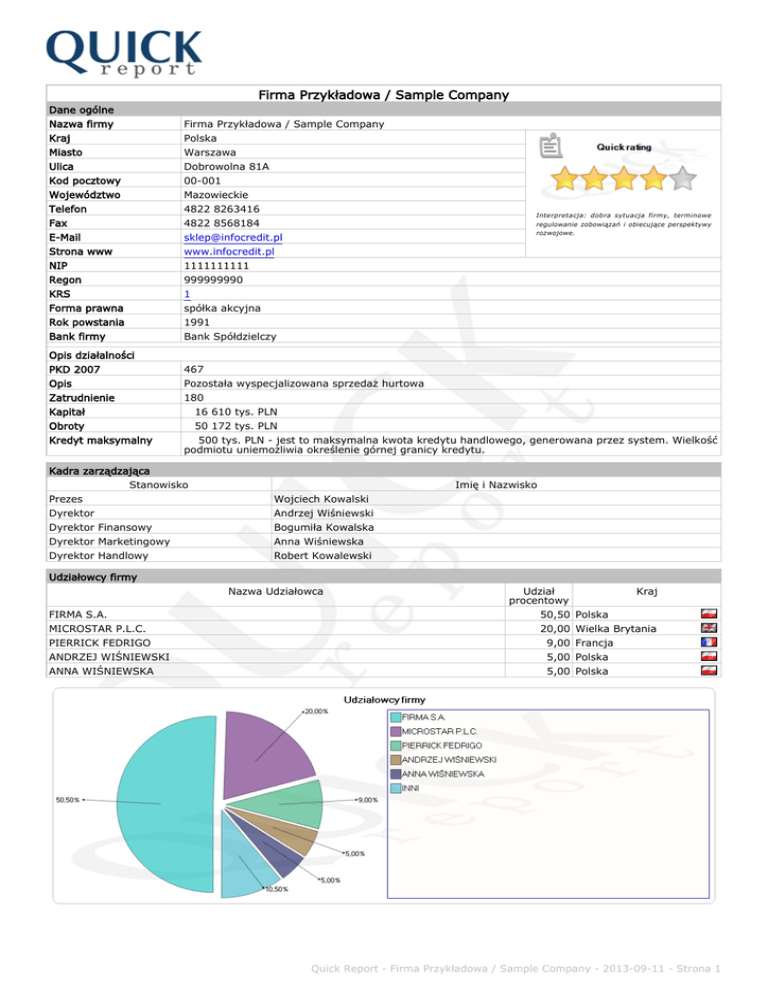 Firma Przykładowa / Sample Company Dane ogólne Nazwa firmy Kraj Miasto Ulica Kod pocztowy Województwo Telefon Fax E-Mail Strona www NIP Regon KRS Forma prawna Rok powstania Bank firmy Opis działalności PKD 2007 Opis Zatrudnienie Kapitał Obroty Kredyt maksymalny Firma Przykładowa / Sample Company Polska Warszawa Dobrowolna 81A 00-001 Mazowieckie 4822 8263416 4822 8568184 [email protected] www.infocredit.pl 1111111111 999999990 1 spółka akcyjna 1991 Bank Spółdzielczy Interpretacja: dobra sytuacja firmy, terminowe regulowanie zobowiązań i obiecujące perspektywy rozwojowe. 467 Pozostała wyspecjalizowana sprzedaż hurtowa 180 16 610 tys. PLN 50 172 tys. PLN 500 tys. PLN - jest to maksymalna kwota kredytu handlowego, generowana przez system. Wielkość podmiotu uniemożliwia określenie górnej granicy kredytu. Kadra zarządzająca Stanowisko Prezes Dyrektor Dyrektor Finansowy Dyrektor Marketingowy Dyrektor Handlowy Imię i Nazwisko Wojciech Kowalski Andrzej Wiśniewski Bogumiła Kowalska Anna Wiśniewska Robert Kowalewski Udziałowcy firmy Nazwa Udziałowca FIRMA S.A. MICROSTAR P.L.C. PIERRICK FEDRIGO ANDRZEJ WIŚNIEWSKI ANNA WIŚNIEWSKA Udział procentowy 50,50 20,00 9,00 5,00 5,00 Kraj Polska Wielka Brytania Francja Polska Polska Quick Report - Firma Przykładowa / Sample Company - 2013-09-11 - Strona 1 Struktura udziałowców ANDRZEJ WIŚNIEWSKI Udział procentowy 5% ANNA WIŚNIEWSKA Udział procentowy KORPORACJA S.A. FIRMA 2 S.A. Udział procentowy 100 % Zatrudnienie 500 Obroty 8 126 650 tys. PLN Suma aktywów 151 900 tys. PLN Udział procentowy 5% 54,5 % JAN KOWALSKI Udział procentowy 10 % FIRMA S.A. Udział procentowy 50,5 % FIRMA PRZYKŁADOWA / SAMPLE COMPANY ANNA WIŚNIEWSKA Udział procentowy 13,5 % TFI BANK S.A. Udział procentowy 22 % MICROSTAR P.L.C. Udział procentowy 20 % PIERRICK FEDRIGO Udział procentowy Firmy zależne ABC Sp. z o.o. Udział procentowy Zatrudnienie Suma aktywów 9% Firma 1 Sp. z o.o. 100 % Udział procentowy 45 8 735 tys. PLN 51 % XYZ Sp. z o.o. Udział procentowy 31 % Quick Report - Firma Przykładowa / Sample Company - 2013-09-11 - Strona 2 Profil finansowy Rok sprawozdawczy Okres sprawozdawczy [miesiące] Jednostka Przychody netto ze sprzedaży Koszty działalności operacyjnej Zysk/strata na działalności operacyjnej Zysk/strata netto Kapitał (fundusz) własny Suma aktywów 2006 tys. 22 21 17 23 2007 12 PLN 195 569 652 168 854 888 tys. 27 26 1 18 25 2008 12 PLN 228 604 017 646 434 869 tys. 35 34 1 19 28 2009 12 PLN 438 306 862 177 380 574 tys. 37 35 1 1 19 34 2010 12 PLN 216 724 538 082 873 107 tys. 41 39 2 1 20 34 2011 12 PLN 784 038 564 485 927 028 tys. 50 44 3 1 22 38 12 PLN 172 920 068 920 285 113 Quick Report - Firma Przykładowa / Sample Company - 2013-09-11 - Strona 3 Wskaźniki finansowe Wskaźnik bieżącej płynności Wskaźnik szybkiej płynności Wskaźnik poziomu zadłużenia Wskaźnik wypłacalności Wskaźnik rotacji należności [dni] Wskaźnik rotacji zobowiązań [dni] Wskaźnik szybkości obrotu zapasów [dni] Zwrot z aktywów [%] Zwrot z kapitału własnego [%] Rentowność sprzedaży [%] Wskaźnik rentowności działalności gospodarczej [%] Wskaźnik pokrycia aktywów stałych przez kapitał stały [%] Wskaźnik pokrycia aktywów obrotowych zobowiązaniami krótkoterminowymi [%] 2006 2,32 1,27 0,20 0,75 88,00 71,00 72,54 0,70 0,94 0,76 1,27 2007 1,91 1,02 0,25 0,71 81,00 84,00 74,44 2,50 3,50 2,37 1,98 2008 1,95 1,06 0,28 0,68 71,00 74,00 65,82 4,12 6,07 3,32 4,10 2009 1,67 0,91 0,38 0,58 74,00 87,00 65,11 3,17 5,44 2,91 3,30 2010 1,94 1,23 0,36 0,61 77,00 68,00 47,64 4,36 7,10 3,55 4,64 2011 1,52 0,94 0,40 0,58 61,00 81,00 47,01 5,04 8,62 3,83 5,12 142,58 142,79 148,95 130,07 139,02 128,04 43,08 52,37 51,19 59,97 51,56 65,64 Quick Report - Firma Przykładowa / Sample Company - 2013-09-11 - Strona 4 Firma na tle branży - wskaźniki sektorowe za rok 2011 Branża - Handel hurtowy, z wyłączeniem handlu pojazdami samochodowymi A B C D E F G H I J K L Rentowność sprzedaży [%] Zwrot z kapitału własnego [%] Zwrot z aktywów [%] Wskaźnik rentowności działalności gospodarczej [%] Wskaźnik bieżącej płynności Wskaźnik szybkiej płynności Wskaźnik poziomu zadłużenia Wskaźnik wypłacalności Wskaźnik rotacji należności [dni] Wskaźnik rotacji zobowiązań [dni] Wskaźnik szybkości obrotu zapasów [dni] Wskaźnik pokrycia aktywów obrotowych zobowiązaniami krótkoterminowymi [%] M Wskaźnik pokrycia aktywów stałych przez kapitał stały [%] minimum -995,40 -990,71 -968,42 -995,40 0,94 0,36 0,07 0,12 7,00 8,00 0,00 8,10 Branża maksimum 936,91 986,40 836,20 936,91 8,62 5,89 0,87 0,91 140,00 184,00 122,97 99,98 średnia 2,84 15,61 6,24 3,27 1,88 1,18 0,50 0,48 53,46 66,58 43,18 57,56 Firma 3,83 8,62 5,04 5,12 1,52 0,94 0,40 0,58 61,00 81,00 47,01 65,64 0,04 2655,50 362,66 128,04 • - wynik firmy - średnia branży - zakres branży Wyliczenia na podstawie sprawozdań 15646 firm z branży. Wzory i objaśnienia wskaźników finansowych dostępne są w dokumencie dołączonym do raportu. Quick Report - Firma Przykładowa / Sample Company - 2013-09-11 - Strona 5 Zatrudnienie Rok sprawozdawczy Liczba pracowników Bilans Rok sprawozdawczy Sprawozdanie na Okres sprawozdawczy [miesiące] Jednostka Skonsolidowane MSSF Aktywa Aktywa trwałe Wartości niematerialne i prawne Rzeczowe aktywa trwałe Środki trwałe Grunty Budynki Urządzenia techniczne Środki transportu Pozostałe aktywa trwałe (w tym fin.) Aktywa obrotowe Zapasy Należności i roszczenia Pozostałe aktywa obrotowe Środki pieniężne Suma aktywów Pasywa Kapitał (fundusz) własny Kapitał podstawowy Pozostałe kapitały Zobowiązania długoterminowe Kredyty i pożyczki Pozostałe zobowiązania długoterminowe Zobowiązania krótkoterminowe Pożyczki bankowe Zobowiązania wobec dostawców Pozostałe zobowiązania krótkoterminowe Suma Pasywów 2011 2009 2008 2007 2006 2005 180 180 178 158 120 83 2011 31-12-2011 12 tys. PLN NIE NIE 2010 31-12-201