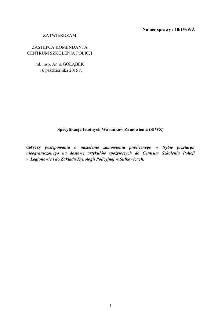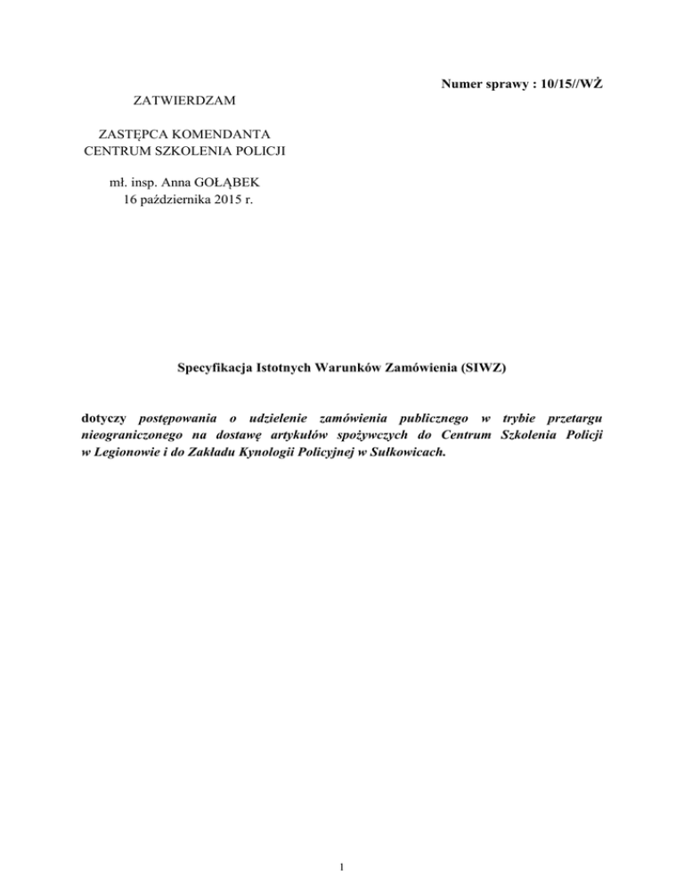 Numer sprawy : 10/15//WŻ ZATWIERDZAM ZASTĘPCA KOMENDANTA CENTRUM SZKOLENIA POLICJI mł. insp. Anna GOŁĄBEK 16 października 2015 r. Specyfikacja Istotnych Warunków Zamówienia (SIWZ) dotyczy postępowania o udzielenie zamówienia publicznego w trybie przetargu nieograniczonego na dostawę artykułów spożywczych do Centrum Szkolenia Policji w Legionowie i do Zakładu Kynologii Policyjnej w Sułkowicach. 1 INSTRUKCJA DLA WYKONAWCÓW 1. Informacja o Zamawiającym Centrum Szkolenia Policji w Legionowie Adres: ul. Zegrzyńska 121, 05-119 Legionowo tel.: (22) 605-32-57; fax: (22) 605-35-85 e-mail: [email protected] godziny pracy: poniedziałek – piątek 745 do 1545 (z wyjątkiem świąt i dni ustawowo wolnych od pracy). 2. Tryb postępowania Postępowanie o udzielenie zamówienia prowadzone jest w trybie przetargu nieograniczonego z zachowaniem zasad określonych ustawą z dnia 29 stycznia 2004 r. Prawo zamówień publicznych (Dz. U. z 2013 r., poz. 907, z późn. zm.). 3. Informacje uzupełniające 1. Wszelkie informacje przedstawione w niniejszej SIWZ przeznaczone są wyłącznie do przygotowania oferty. 2. Na potrzeby SIWZ ustawa z dnia 29 stycznia 2004 r. Prawo zamówień publicznych zwana będzie dalej „ustawą”. 3. Wszelkie koszty związane z przygotowaniem oraz złożeniem oferty ponosi Wykonawca. W przypadku unieważnienia postępowania o udzielenie zamówienia z przyczyn leżących po stronie Zamawiającego, Wykonawcom, którzy złożyli oferty niepodlegające odrzuceniu, przysługuje roszczenie o zwrot uzasadnionych kosztów uczestnictwa w postępowaniu, w szczególności kosztów przygotowania oferty. 4. Postępowanie o udzielenie zamówienia publicznego może zostać unieważnione w przypadkach określonych w art. 93 ust. 1 albo 2 ustawy. O fakcie unieważnienia postępowania, Zamawiający zawiadomi równocześnie wszystkich Wykonawców, którzy ubiegali się o udzielenie zamówienia publicznego. 5. W uzasadnionych przypadkach Zamawiający może przed upływem terminu składania ofert zmienić treść SIWZ. Dokonaną w ten sposób zmianę Zamawiający przekaże niezwłocznie wszystkim Wykonawcom, którym przekazano SIWZ oraz zamieści ją na stronie internetowej Zamawiającego. 6. Zamawiający nie przewiduje udzielenia zamówień uzupełniających. 7. Zamawiający przewiduje przeprowadzenie aukcji elektronicznej w celu wyboru oferty najkorzystniejszej na stronie https://aukcje.uzp.gov.pl/index.php. 8. Zamawiający nie przewiduje zawarcia umowy ramowej. 9. Rozliczenia między Zamawiającym a Wykonawcą prowadzone będą w walucie polskiej. 4. Sposób porozumiewania się pomiędzy Zamawiającym a Wykonawcami 1. SIWZ zostanie umieszczona na stronie internetowej Zamawiającego pod adresem www.csp.edu.pl. 2. Zgodnie z obowiązującymi przepisami ustawy wszelkie ewentualne wyjaśnienia treści SIWZ, jej zmiany, przesunięcia terminów składania i otwarcia ofert, zawiadomienie o wyniku postępowania będą publikowane na w/w stronie internetowej i będą wiążące dla Wykonawców. Data publikacji powyższych informacji pod podanym adresem jest datą rozpoczynającą bieg terminów na składanie odwołań. 2 3. Pytania dotyczące SIWZ, informacje i zawiadomienia należy kierować do Zamawiającego drogą pisemną w formie faksu bądź drogą elektroniczną, z zastrzeżeniem, że jedynym adresem poczty elektronicznej służącym do korespondencji w sprawie prowadzonego postępowania jest [email protected] 4. Oferty można składać wyłącznie w formie pisemnej. W przypadku udzielania Zamawiającemu wyjaśnień dotyczących treści złożonej oferty oraz uzupełniania dokumentów lub oświadczeń brakujących w ofercie, Zamawiający zgodnie z ustawą, celem przyspieszenia procedury przetargowej, dopuszcza porozumiewanie się z Wykonawcami w tym zakresie faksem bądź drogą elektroniczną z zastrzeżeniem, że jeśli dokumenty i wyjaśnienia, o których mowa powyżej (będące elementem oferty) zostaną dostarczone faksem lub drogą elektroniczną i będą budziły jakiekolwiek wątpliwości Zamawiającego, zażąda on przedstawienia do wglądu oryginału w terminie nie dłuższym niż 2 dni robocze od upływu terminu wyznaczonego na ich przekazanie. 5. W zakresie środków ochrony prawnej Zamawiający przewiduje porozumiewanie się pomiędzy stronami pisemnie, faksem i drogą elektroniczną. Odwołanie wnosi się w sposób określony w pkt 25 SIWZ. Odwołanie wniesione faksem wymaga potwierdzenia Zamawiającego. 6. Osobą uprawnioną do bezpośredniego kontaktowania się z Wykonawcami jest Kierownik Zespołu Zamówień Publicznych i Funduszy Pomocowych Pani Anna Baranowska telefon (22) 605-32-57. 5. Przedmiot zamówienia 1. Przedmiotem zamówienia jest dostawa artykułów spożywczych do Centrum Szkolenia Policji w Legionowie i do Zakładu Kynologii Policyjnej w Sułkowicach. 2. Przedmiot zamówienia został podzielony na dwanaście części: 1) Część I – artykuły różne – dostawa do Centrum Szkolenia Policji w Legionowie; 2) Część II – przyprawy do potraw, sosy i zupy w proszku – dostawa do Centrum Szkolenia Policji w Legionowie; 3) Część III – słodycze – dostawa do Centrum Szkolenia Policji w Legionowie; 4) Część IV – owoce i warzywa mrożone – dostawa do Centrum Szkolenia Policji w Legionowie; 5) Część V – owoce i warzywa mrożone – dostawa do Zakładu Kynologii Policyjnej CSP w Sułkowicach; 6) Część VI – owoce i warzywa konserwowe – dostawa do Centrum Szkolenia Policji w Legionowie; 7) Część VII – woda mineralna i soki owocowe – dostawa do Centrum Szkolenia Policji w Legionowie; 8) Część VIII – wyroby kulinarne świeże i mrożone – dostawa do Centrum Szkolenia Policji w Legionowie; 9) Część IX – wyroby kulinarne świeże i mrożone – dostawa do Zakładu Kynologii Policyjnej CSP w Sułkowicach; 10) Część X – mleko i jego przetwory – dostawa do Centrum Szkolenia Policji w Legionowie; 11) Część XI