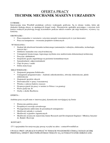 OFERTA PRACY TECHNIK MECHANIK MASZYN I URZADZEN O FIRMIE : Innowacyjna irma Wordfall produkuje cyfrowe wodospady graficzne. Są to ekrany wodne, które jak drukarka drukują obrazy ze spadających kropel wody. Niesamowite spektakle powstające z użyciem tych kurtyn wodnych przykuwają uwagę uczestników podczas takich eventów jak targi branżowe, wystawy czy koncerty. OBOWIAZKI : • Praca manualna w warsztacie z użyciem narzędzi warsztatowych (w tym lutowanie) • Praca na komputerze – tworzenie projektów technicznych WYMAGANIA : • Student lub absolwent kierunku technicznego (automatyka i robotyka, elektronika, technologia maszyn itp.) • Zdolności manualne oraz zmysł techniczny • Umiejętność kreatywnego, logicznego myślenia oraz analizowania dokumentacji technicznej • Precyzja i dokładność • Znajomość języka angielskiego na poziomie komunikatywnym • Samodzielność, odpowiedzialność • Chęć do pracy i nauki • Dobra motywacja MILE WIDZIANE : • Znajomość programu Solidworks • Umiejętność programowania – Android, mikrokontrolery, obwody elektroniczne, płytki elektroniczne • Znajomość języków obcych • Doświadczenie w pracy warsztatowej • Wiedza z zakresu budowy maszyn • Dyspozycyjność do pracy w terenie (w Polsce i za granicą) • Prawo jazdy kat. B • Osoby z okolic Raciborza OFERTA : Ambitna praca na pół etatu w innowacyjnej, dynamicznie rozwijającej się firmie • • • • • • Elastyczne godziny pracy Perspektywa rozwoju zawodowego Wynagrodzenie adekwatne do posiadanych umiejętności Możliwość udziału w zyskach Możliwość wyjazdów zagranicznych Możliwość awansu do stanowiska Junior Research and Development Engineer / Młodszy Inżynier ds. Badań i Rozwoju KONTAKT : CV i opcjonalnie list motywacyjny proszę wysyłać na adres : [email protected] UWAGA! PRZY APLIKACJI NAPISAĆ W TEMACIE WIADOMOŚCI ÓSMĄ Z KOLEI LICZBĘ PIERWSZĄ. OFERTY BEZ POPRAWNEGO TEMATU SĄ AUTOMATYCZNIE ODRZUCANE.