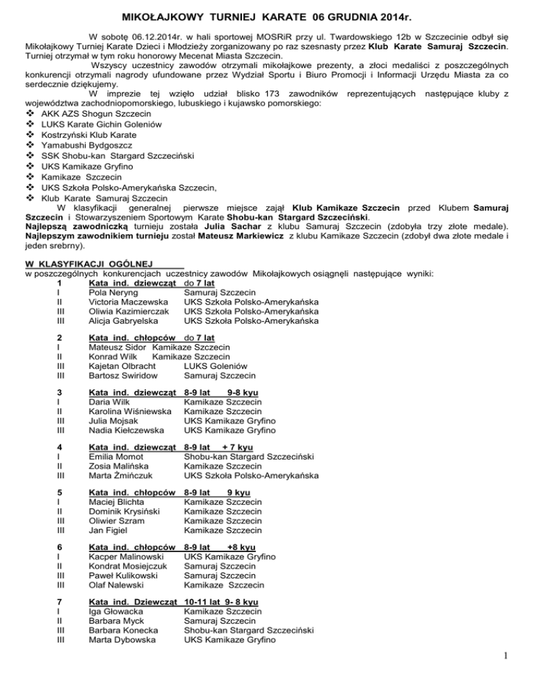 MIKOŁAJKOWY TURNIEJ KARATE 06 GRUDNIA 2014r. W sobotę 06.12.2014r. w hali sportowej MOSRiR przy ul. Twardowskiego 12b w Szczecinie odbył się Mikołajkowy Turniej Karate Dzieci i Młodzieży zorganizowany po raz szesnasty przez Klub Karate Samuraj Szczecin. Turniej otrzymał w tym roku honorowy Mecenat Miasta Szczecin. Wszyscy uczestnicy zawodów otrzymali mikołajkowe prezenty, a złoci medaliści z poszczególnych konkurencji otrzymali nagrody ufundowane przez Wydział Sportu i Biuro Promocji i Informacji Urzędu Miasta za co serdecznie dziękujemy. W imprezie tej wzięło udział blisko 173 zawodników reprezentujących następujące kluby z województwa zachodniopomorskiego, lubuskiego i kujawsko pomorskiego: AKK AZS Shogun Szczecin LUKS Karate Gichin Goleniów Kostrzyński Klub Karate Yamabushi Bydgoszcz SSK Shobu-kan Stargard Szczeciński UKS Kamikaze Gryfino Kamikaze Szczecin UKS Szkoła Polsko-Amerykańska Szczecin, Klub Karate Samuraj Szczecin W klasyfikacji generalnej pierwsze miejsce zajął Klub Kamikaze Szczecin przed Klubem Samuraj Szczecin i Stowarzyszeniem Sportowym Karate Shobu-kan Stargard Szczeciński. Najlepszą zawodniczką turnieju została Julia Sachar z klubu Samuraj Szczecin (zdobyła trzy złote medale). Najlepszym zawodnikiem turnieju został Mateusz Markiewicz z klubu Kamikaze Szczecin (zdobył dwa złote medale i jeden srebrny). W KLASYFIKACJI OGÓLNEJ w poszczególnych konkurencjach uczestnicy zawodów Mikołajkowych osiągnęli następujące wyniki: 1 Kata ind. dziewcząt do 7 lat I Pola Neryng Samuraj Szczecin II Victoria Maczewska UKS Szkoła Polsko-Amerykańska III Oliwia Kazimierczak UKS Szkoła Polsko-Amerykańska III Alicja Gabryelska UKS Szkoła Polsko-Amerykańska 2 I II III III Kata ind. chłopców do 7 lat Mateusz Sidor Kamikaze Szczecin Konrad Wilk Kamikaze Szczecin Kajetan Olbracht LUKS Goleniów Bartosz Swiridow Samuraj Szczecin 3 I II III III Kata ind. dziewcząt Daria Wilk Karolina Wiśniewska Julia Mojsak Nadia Kiełczewska 8-9 lat 9-8 kyu Kamikaze Szczecin Kamikaze Szczecin UKS Kamikaze Gryfino UKS Kamikaze Gryfino 4 I II III Kata ind. dziewcząt Emilia Momot Zosia Malińska Marta Żmińczuk 8-9 lat + 7 kyu Shobu-kan Stargard Szczeciński Kamikaze Szczecin UKS Szkoła Polsko-Amerykańska 5 I II III III Kata ind. chłopców Maciej Blichta Dominik Krysiński Oliwier Szram Jan Figiel 8-9 lat 9 kyu Kamikaze Szczecin Kamikaze Szczecin Kamikaze Szczecin Kamikaze Szczecin 6 I II III III Kata ind. chłopców Kacper Malinowski Kondrat Mosiejczuk Paweł Kulikowski Olaf Nalewski 8-9 lat +8 kyu UKS Kamikaze Gryfino Samuraj Szczecin Samuraj Szczecin Kamikaze Szczecin 7 I II III III Kata ind. Dziewcząt Iga Głowacka Barbara Myck Barbara Konecka Marta Dybowska 10-11 lat 9- 8 kyu Kamikaze Szczecin Samuraj Szczecin Shobu-kan Stargard Szczeciński UKS Kamikaze Gryfino 1 8 I II III III Kata ind. dziewcząt Olga Żmińczuk Kinga Fedorowicz Zofia Malińska Wiktoria Sawicka 10-11 lat + 7 kyu Samuraj Szczecin Kamikaze Szczecin Kamikaze Szczecin LUKS Goleniów 9 I II III III Kata ind. chłopców Mikke Sebastian Jan Tarasiuk Oskar Nawrocki Kacper Brodowski 10-11 lat 9-8 kyu Kamikaze Szczecin Kamikaze Szczecin Kamikaze Szczecin Samuraj Szczecin 10 I II III III Kata ind. chłopców Cezary Wilk Mateusz Markiewicz Patryk Śmieciński Marcin Momot 10-11 lat + 7 kyu Kamikaze Szczecin Kamikaze Szczecin Samuraj Szczecin Shobu-kan Stargard Szczeciński 11 I II III III Kata ind. młodziczek 12-13 lat 9- 7 kyu Julia Fedorowicz Kamikaze Szczecin Inga Ksiądz Samuraj Szczecin Julia Długosz Samuraj Szczecin Alina Kisielewicz Kostrzyński Klub Karate 12 I II III III Kata ind. młodziczek 12-13 lat + 6 kyu Julia Sachar Samuraj Szczecin Julia Pakuła Shobu-kan Stargard Szczeciński Natalia Ślusarz Kostrzyński Klub Karate Izabela Borowska Kostrzyński Klub Karate 13 I II III III Kata ind. młodzików Dawid Erdmann Dominik Domżalski Paweł Bekalarczuk Konrad Golec 14 I II III III Kata ind. młodzików 12-13 lat +7 kyu Mateusz Wiśniewski Kamikaze Szczecin Wiktor Wyszomirski Samuraj Szczecin Kamil Ziółkowski Shobu-kan Stargard Szczeciński Szymon Wojciechowski Shobu-kan Stargard Szczeciński 15 I II Kata ind. Kadetek Justyna Momot Alicja Biskowska 14-15 lat Shobu-kan Stargard Szczeciński Kostrzyński Klub Karate 16 I II III III Kata ind. Kadetów Szymon Harwat Grzegorz Sulima Dominik Kida Oliwer Zarębski 14-15 lat Kamikaze Szczecin Kamikaze Szczecin Kamikaze Szczecin Samuraj Szczecin 17 I II III Kumite ind. dziewcząt 10-11 lat - 37kg Kinga Fedorowicz Kamikaze Szczecin Iga Głowacka Kamikaze Szczecin Emilia Borysiek Kamikaze Szczecin 18 I II III III Kumite ind. dziewcząt 10-11 lat + 37kg Amelia Gackowska Kamikaze Szczecin Olga Żmińczuk Samuraj Szczecin Anna Prus Kamikaze Szczecin Ewelina Psonak Kamikaze Szczecin 19 I II Kumite ind. chłopców 10-11 lat -37 kg Patryk Śmieciński Samuraj Szczecin Adam Adamczyk Kamikaze Szczecin 12-13 lat 9- 7 kyu Kamikaze Szczecin Kamikaze Szczecin Kamikaze Szczecin Kamikaze Szczecin 2 III III Jan Ciszewski Adam Korpalski Kamikaze Szczecin LUKS Goleniów 20 I II III III Kumite ind. chłopców 10-11 lat +37 kg Mateusz Markiewicz Kamikaze Szczecin Marcin Momot Shobu-kan Stargard Szczeciński Kacper Lipski LUKS Goleniów Łukasz Grabow Kamikaze Szczecin 22 I II III III 23 I II III III Kumite ind. Młodziczek 12-13 lat + 43kg Julia Sachar Samuraj Szczecin Inga Ksiądz Samuraj Szczecin Julia Fedorowicz Kamikaze Szczecin Julia Pakuła Shobu-kan Stargard Szczeciński Kumite ind. Młodzików 12-13 lat - 45 kg Mateusz Wiśniewski Kamikaze Szczecin Michał Gdaniec Samuraj Szczecin Szymon Wojciechowski Shobu-kan Stargard Szczeciński Dawid Erdmann Kamikaze Szczecin 24 I II III III Kumite ind. Młodzików 12-13 lat + 45 kg Łukasz Koźlarek Samuraj Szczecin Dominik Domżalski Kamikaze Szczecin Erwin Byczkowski LUKS Goleniów Wiktor Wyszomirski Samuraj Szczecin 26 I II Kumite ind. Kadetek 14-15 lat + 52kg Justyna Momot Shobu-kan Stargard Szczeciński