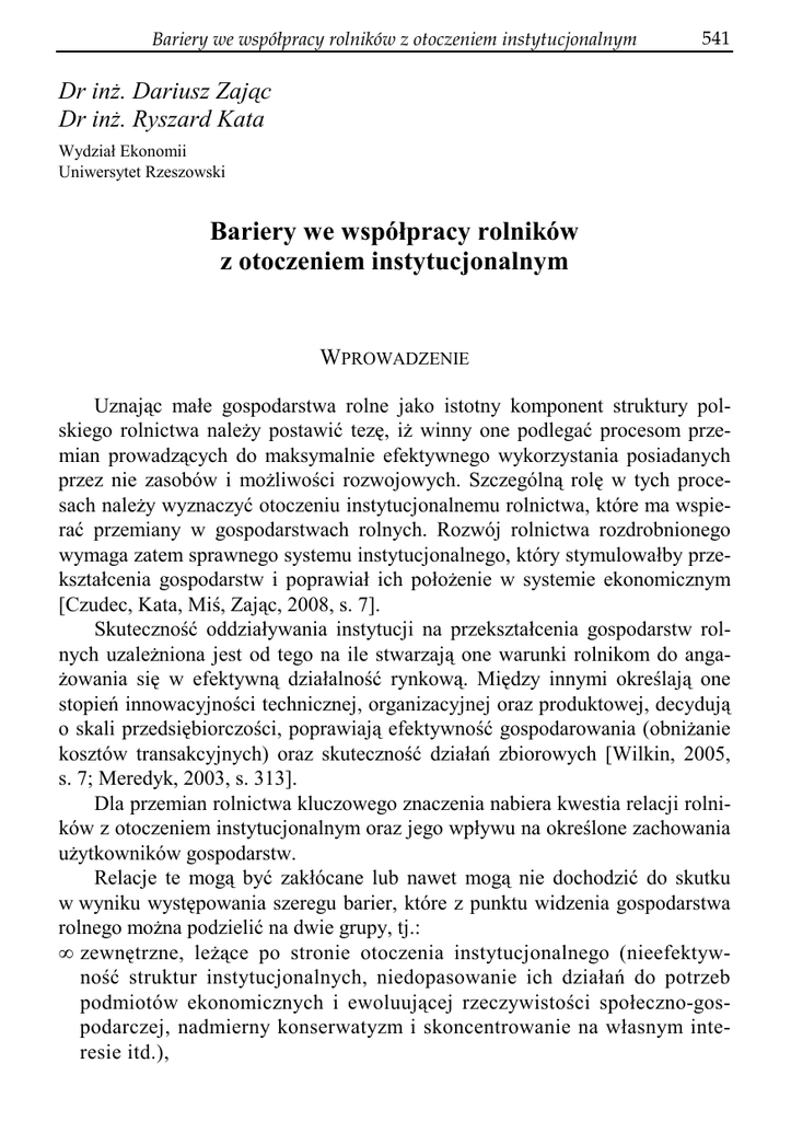 Bariery we współpracy rolników z otoczeniem instytucjonalnym 541 Dr inż. Dariusz Zając Dr inż. Ryszard Kata Wydział Ekonomii Uniwersytet Rzeszowski Bariery we współpracy rolników z otoczeniem instytucjonalnym WPROWADZENIE Uznając małe gospodarstwa rolne jako istotny komponent struktury polskiego rolnictwa należy postawić tezę, iż winny one podlegać procesom przemian prowadzących do maksymalnie efektywnego wykorzystania posiadanych przez nie zasobów i możliwości rozwojowych. Szczególną rolę w tych procesach należy wyznaczyć otoczeniu instytucjonalnemu rolnictwa, które ma wspierać przemiany w gospodarstwach rolnych. Rozwój rolnictwa rozdrobnionego wymaga zatem sprawnego systemu instytucjonalnego, który stymulowałby przekształcenia gospodarstw i poprawiał ich położenie w systemie ekonomicznym [Czudec, Kata, Miś, Zając, 2008, s. 7]. Skuteczność oddziaływania instytucji na przekształcenia gospodarstw rolnych uzależniona jest od tego na ile stwarzają one warunki rolnikom do angażowania się w efektywną działalność rynkową. Między innymi określają one stopień innowacyjności technicznej, organizacyjnej oraz produktowej, decydują o skali przedsiębiorczości, poprawiają efektywność gospodarowania (obniżanie kosztów transakcyjnych) oraz skuteczność działań zbiorowych [Wilkin, 2005, s. 7; Meredyk, 2003, s. 313]. Dla przemian rolnictwa kluczowego znaczenia nabiera kwestia relacji rolników z otoczeniem instytucjonalnym oraz jego wpływu na określone zachowania użytkowników gospodarstw. Relacje te mogą być zakłócane lub nawet mogą nie dochodzić do skutku w wyniku występowania szeregu barier, które z punktu widzenia gospodarstwa rolnego można podzielić na dwie grupy, tj.: • zewnętrzne, leżące po stronie otoczenia instytucjonalnego (nieefektywność struktur instytucjonalnych, niedopasowanie ich działań do potrzeb podmiotów ekonomicznych i ewoluującej rzeczywistości społeczno-gospodarczej, nadmierny konserwatyzm i skoncentrowanie na własnym interesie itd.), 542 DARIUSZ ZAJĄC, RYSZARD KATA • wewnętrzne, leżące po stronie rolników, czyli odbiorców impulsów i usług płynących ze strony otoczenia instytucjonalnego. Część z tych ograniczeń wynika z cech psychospołecznych użytkowników gospodarstw (skłonność do zmian, otwartość na współpracę, oportunizm, zaufanie do innych itd.). Pozostałe są pochodną określonej sytuacji ekonomicznej i etapu rozwoju gospodarstwa (struktura produkcji, elastyczność zasobów produkcyjnych, struktura organizacyjna, kwestia następcy itd.). Nałożenie się tych różnych ograniczeń może powodować, że wzajemne interakcje między otoczeniem instytucjonalnym a gospodarstwem rolnym będą „jałowe” w aspekcie ich wpływu na przekształcenia i rozwój gospodarstwa bądź też w ogóle nie będą dochodzić do skutku [Czudec, Kata, Miś, Zając, 2008, s. 215–216]. Celem artykułu jest identyfikacja barier we współpracy rolników z otoczeniem instytucjonalnym w regionie o rozdrobnionej strukturze gospodarstw, a także ustalenie, czy występuje zróżnicowanie pod tym względem w zależności od takich cech, jak: powierzchnia UR i siła ekonomiczna gospodarstwa oraz wiek i wykształcenie jego właściciela. Materiał źródłowy artykułu stanowią wyniki badań przeprowadzonych w 2007 roku1. Badania ankietowe miały charakter badań częściowych − reprezentatywnych (metoda losowania warstwowego). Sondażem diagnostycznym przy użyciu kwestionariusza wywiadu objęto rolników, właścicieli gospodarstw rolnych z regionu rozdrobnionego rolnictwa, tj. z trzech województw: świętokrzyskiego, małopolskiego i podkarpackiego. Jednostką próby były gospodarstwa rolne. Tak określona populacja generalna składała się z 541,1 tys. gospodarstw. Z populacji generalnej pobrano próbę na zasadzie doboru losowego uwzględniającego liczebność i wewnętrzne zróżnicowanie jednostek (pod względem cechy, jaką jest obszar UR gospodarstw), tak aby wyniki uzyskane z badań były reprezentatywne dla całej populacji gospodarstw rolnych badanego regionu. Przy doborze jednostek do próby, uwzględniono także rozkład przestrzenny badanych jednostek, tj. proporcję liczebności gospodarstw rolnych w poszczególnych województwach − w ustalonych przekrojach badawczych. Łącznie wywiadem kwestionariuszowym objętych zostało 856 rolników2. 1 Badania przeprowadzono w ramach realizacji Projektu Badawczego pt. „Rola lokalnych instytucji w przekształceniach rolnictwa o rozdrobnionej strukturze gospodarstw (po przystąpieniu Polski do Unii Europejskiej)”, nr N114 009 31/2320, finansowanego ze środków Ministerstwa Nauki i Szkolnictwa Wyższego, pod kierownictwem dra hab. Adama Czudeca, prof. UR. 2 Szerzej na temat metody doboru próby gospodarstw do badań w: [Czudec, Kata, Miś, Zając, 2008, s. 15–17]. Bariery we współpracy rolników z otoczeniem instytucjonalnym 543 WYNIKI BADAŃ I DYSKUSJA W przeprowadzonych badaniach ankietowych podjęto kwestię dotyczącą barier we współpracy rolników z otoczeniem instytucjonalnym. Rolnicy mieli przy tym pełną swobodę w wypowiedziach, co do liczby i charakteru wskazywanych barier. Większość rolników w regionie rozdrobnionego rolnictwa wskazuje na występowanie barier we współpracy z otoczeniem instytucjonalnym i nie ma pod tym względem większych różnic w zależności od powierzchni UR w gospodarstwie (tab. 1). Rolnicy najczęściej wskazują na brak doświadczenia we współpracy z instytucjami oraz na utrudniony dostęp do instytucji, na który to składa się zarówno duża odległość do instytucji, jak również takie kwestie jak: godziny otwarcia niedopasowane do potrzeb rolników, dostęp ograniczony tylko do kilku godzin tygodniowo, czy też brak dostępu do instytucji przez Internet (tab. 1). Pierwsza z wymienionych barier leży po stronie rolników. Jednakże brak doświadczenia, a tym samy