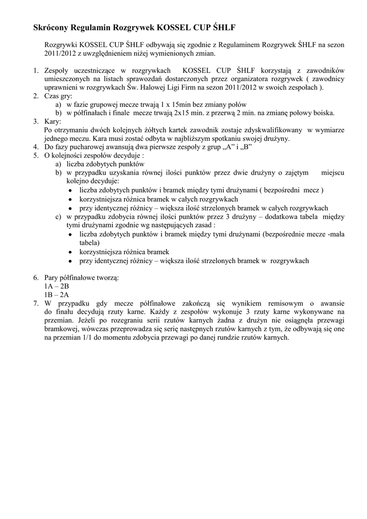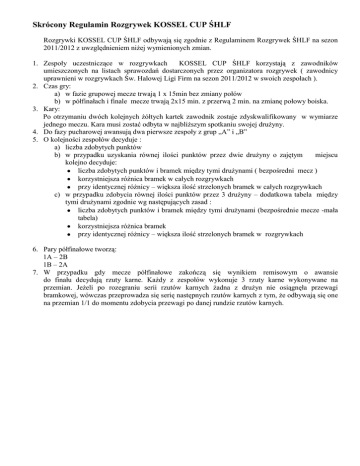 Skrócony Regulamin Rozgrywek KOSSEL CUP ŚHLF Rozgrywki KOSSEL CUP ŚHLF odbywają się zgodnie z Regulaminem Rozgrywek ŚHLF na sezon 2011/2012 z uwzględnieniem niżej wymienionych zmian. 1. Zespoły uczestniczące w rozgrywkach KOSSEL CUP ŚHLF korzystają z zawodników umieszczonych na listach sprawozdań dostarczonych przez organizatora rozgrywek ( zawodnicy uprawnieni w rozgrywkach Św. Halowej Ligi Firm na sezon 2011/2012 w swoich zespołach ). 2. Czas gry: a) w fazie grupowej mecze trwają 1 x 15min bez zmiany połów b) w półfinałach i finale mecze trwają 2x15 min. z przerwą 2 min. na zmianę połowy boiska. 3. Kary: Po otrzymaniu dwóch kolejnych żółtych kartek zawodnik zostaje zdyskwalifikowany w wymiarze jednego meczu. Kara musi zostać odbyta w najbliższym spotkaniu swojej drużyny. 4. Do fazy pucharowej awansują dwa pierwsze zespoły z grup „A” i „B” 5. O kolejności zespołów decyduje : a) liczba zdobytych punktów b) w przypadku uzyskania równej ilości punktów przez dwie drużyny o zajętym miejscu kolejno decyduje: liczba zdobytych punktów i bramek między tymi drużynami ( bezpośredni mecz ) korzystniejsza różnica bramek w całych rozgrywkach przy identycznej różnicy – większa ilość strzelonych bramek w całych rozgrywkach c) w przypadku zdobycia równej ilości punktów przez 3 drużyny – dodatkowa tabela między tymi drużynami zgodnie wg następujących zasad : liczba zdobytych punktów i bramek między tymi drużynami (bezpośrednie mecze -mała tabela) korzystniejsza różnica bramek przy identycznej różnicy – większa ilość strzelonych bramek w rozgrywkach 6. Pary półfinałowe tworzą: 1A – 2B 1B – 2A 7. W przypadku gdy mecze półfinałowe zakończą się wynikiem remisowym o awansie do finału decydują rzuty karne. Każdy z zespołów wykonuje 3 rzuty karne wykonywane na przemian. Jeżeli po rozegraniu serii rzutów karnych żadna z drużyn nie osiągnęła przewagi bramkowej, wówczas przeprowadza się serię następnych rzutów karnych z tym, że odbywają się one na przemian 1/1 do momentu zdobycia przewagi po danej rundzie rzutów karnych.