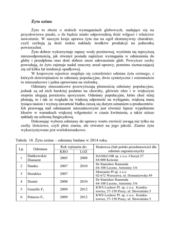 Żyto ozime Żyto to zboże o niskich wymaganiach glebowych, nadające się na przysłowiowe piaski, o ile będzie miało odpowiednią ilość wilgoci i właściwe nawożenie. W naszym kraju uprawa żyta ma na ogół ekstensywny charakter, czyli cechują ją dość niskie nakłady środków produkcji na jednostkę powierzchni. Żyto dobrze wykorzystuje zapasy wody pozimowej, wyróżnia się najwyższą mrozoodpornością, jak również posiada najniższe wymagania w odniesieniu do gleby i przedplonu oraz dość dobrze znosi zakwaszenie gleb. Powyższe cechy powodują, że żyto zajmuje nadal znaczny areał uprawy, pomimo zaznaczającej się od kilku lat tendencji spadkowej. W krajowym rejestrze znajduje się czterdzieści odmian żyta ozimego, z których dziewiętnaście to odmiany populacyjne, dwie syntetyczne i osiemnaście to mieszańcowe i jedna uprawiana na zielonkę. Odmiany mieszańcowe przewyższają plennością odmiany populacyjne, jednak są od nich bardziej podatne na choroby, głównie rdze i w większym stopniu ulegają porażeniu sporyszem. Odmiany populacyjne, które choć niżej plonują, to i tak ze względu na większą odporność na wyleganie, większą masę tysiąca nasion i wyższą zawartość białka cieszą się dużym uznaniem u producentów. Ich przewagą nad odmianami mieszańcowymi jest również lepsze wypełnienie kłosów w warunkach większej wilgotności w czasie kwitnienia, a także niższe nakłady na ochronę fungicydową. Dokonując wyboru odmiany do uprawy warto zwrócić uwagę nie tylko na cechy ilościowe, czyli plon ziarna, ale również na jego jakość. Ziarno żyta wykorzystywane jest wielokierunkowo. Tabela 18. Żyto ozime – odmiany badane w 2014 roku. Lp. Odmiana Rok wpisania do: KRO LOZ 1 Dańkowskie Diament 2005 2008 2 Stanko 2007 2010 3 Herakles 2007 4 Domir 2008 2010 5 Gonello F1 2009 2012 6 Palazzo F1 2009 2012 Hodowca (lub polski przedstawiciel dla odmian zagranicznych) DANKO HR sp. z o.o. Choryń 27 64-000 Kościan Dr Stanisław Ramenda 64-100 Leszno, Antoniny 3/6 Monsanto Pl sp. z o.o 02-672 Warszawa, ul. Domaniewska 49 Dr Stanisław Ramenda 64-100 Leszno, Antoniny 3/6 KWS Lochow Pl. sp. z o.o. Kondratowice, 57-150 Prusy, ul. Słowiańska 5 KWS Lochow Pl. sp. z o.o. Kondratowice, 57-150 Prusy, ul. Słowiańska 5 7 Brasetto F1 2009 8 Dańkowskie Amber 2010 9 Armand 2011 10 Horyzo 2011 11 SU Allawi F1 2012 12 SU Stakkato F1 2012 13 Antonińskie 2013 14 SU Satelit F1 2013 15 SU Spektrum F1 2013 16 Tur F1 2013 17 Dańkowskie Rubin 2013 2013 KWS Lochow Pl. sp. z o.o. Kondratowice, 57-150 Prusy, ul. Słowiańska 5 DANKO HR sp. z o.o. Choryń 27 64-000 Kościan Dr Stanisław Ramenda 64-100 Leszno, Antoniny 3/6 HR Smolice sp. z o.o. 63-740 Kobylin, Smolice 146 Saaten Union Pl. sp. z o.o. 62-100 Wągrowiec, ul. Straszewska 70 Saaten Union Pl. sp. z o.o. 62-100 Wągrowiec, ul. Straszewska 70 Poznańska Hodowla Roślin 63-004 Tulce, ul. Kasztanowa 5 Saaten Union Pl. sp. z o.o. 62-100 Wągrowiec, ul. Straszewska 70 Saaten Union Pl. sp. z o.o. 62-100 Wągrowiec, ul. Straszewska 70 HR Smolice sp. z o.o. 63-740 Kobylin, Smolice 146 DANKO HR sp. z o.o. Choryń 27 64-000 Kościan Tabela 19. Agrotechniczne i polowe warunki prowadzenia doświadczeń w 2014 r. Wyszczególnienie Kompleks glebowy Klasa bonitacyjna gleby pH gleby Zasobność gleby mg/100 g P205 K2 0 Mg Przedplon Data siewu Data zbioru Nawożenie mineralne N na poziomie a1 kg/ha N na poziomie a2 kg/ha P205 kg/ha K20 kg/ha Krzyżewo Marianowo Janów Rzepiski 2 III b 6,7 5 VI b 5,2 5 IV b 4,9 4 IV b 7,1 27,0 17,9 7,1 Groch pastewny 01.10 30.07 17,3 5,5 1,9 Żyto 26.09 04.08 11,0 13,9 3,4 Gorczyca + poplon 30.09 22.08 16,9 12,5 9,4 Pszenica jara 08.10 29.07 60 100 50 75 Herbicydy dawka ADOB Mn 2,5 l. ADOB Cu 1,5 l. Bi 58 EC – 0,5 l. Komplet 560 S.C. – 0,5 l. Tomigan 250 EC – 0,8 l. Fungicydy dawka Topsin 500 M SC – 1,4 l. Artea 0 EC – 0,5 l. Nawożenie dolistne l/ha Insektycydy Antywylegacz poziom a2 Moddus 250 EC 0,3 l. 92 132 40 60 Basfoliar 36 – 2 x 6 l. Komplet 560 SC – 0,5 l. Reveller 280 SC – 1l. Falcon 460 EC – 0,6 l. Stabilan 750 SL – 1,5 l. 80 120 60 90 70 110 60 90 Basfoliar 36 – 3 x12 l. . Komplet 560 SC – 0,5 l. Huzar Activ 387 OD – 1 l. Basfoliar 36 – 2 x 6,0 l. Komplet 560 SC – 0,5 l. Input 460 EC – 1 l. Falcon 460 EC – 0,5 l. Prosaro 250 EC – 0,8 l. Cerone 480 SL – 1 l. Marianowo Janów Rzepiski Średnia % wzorca (dt) A2 – A1 (dt) Wzorzec dt z ha 87,9 69,2 65,8 56,3 69,8 x x 22,3 1 Dańkowskie Diament 80,7 60,6 60,3 49,2 62,7 - 7,1 90 20,3 2 Antonińskie 79,0 59,1 61,9 49,6 62,4 - 7,4 89 20,6 3 Brasetto F1 92,7 75,2 77,0 65,7 77,7 7,9 111 22,7 4 SU Stakkato F1 99,4 82,0 63,9 60,7 76,5 6,7 110 25,5 5 Herakles S 79,2 64,8 61,5 48,2 63,4 - 6,4 91 24,2 6 Stanko 79,5 62,5 66,3 64,9 - 4,9 93 15,5 7 Domir 81,8 60,1 66,3 64,9 - 4,9 93 13,8 8 Gonello F1 92,1 78,0 67,1 77,7 7,9 111 16,5 9 Palazzo F1 94,2 73,3 58,7 74,1 4,2 106 23,1 10 Dańkowskie Amber 83,1 62,5 71,9 68,0 - 1,8 97 12,0 11 Armand 78,8 59,6 71,0 65,3 - 4,5 94 12,0 12 Horyzo 81,7 61,2 69,1 66,1 - 3,7 95 17,9 13 SU Allawi F1 97,9 77,4 78,9 9,1 113 19,2 14 Dańkowskie Rubin 81,3 58,1 48,5 62,1 - 7,7 89 17,9 15 SU Satellit 90,0 77,6 60,7 74,8 5,0 107 23,2 16 SU Spektrum F1 92,3 79,1 63,0 76,8 7,0 110 17,8 17 Tur F1 92,7 74,4 58,0 73,7 3,9 106 23,6 Lp. Odmiana F1 – Odmiany wzorcowe zaznaczono pogrubioną czcionką. 60,4 Odchylenie od wzorca (dt) Krzyżewo Tabela 20. Plon ziarna odmian żyta ozimego w 2014 r. (dt z ha) na poziomie a1. Rzepiski Średnia % wzorca Janów Wzorzec dt z ha Marianowo Odmiana Krzyżewo Lp. Odchylenie od wzorca (dt) Tabela 21. Plon ziarna odmian żyta ozimego w 2014 r. (dt z ha) na poziomie a2. 108,4 86,4 96,0 77,4 92,1 x x 1 Dańkowskie Diament 100,2 78,6 85,2 67,9 83,0 - 9,1 90 2 Antonińskie 101,6 75,8 88,3 66,2 83,0 - 9,1 90 3 Brasetto F1 113,3 94,3 105,4 88,5 100,4 8,3 109 4 SU Stakkato F1 118,6 96,9 105,3 87,2 102,0 9,9 111 5 Herakles S 105,6 80,3 91,9 