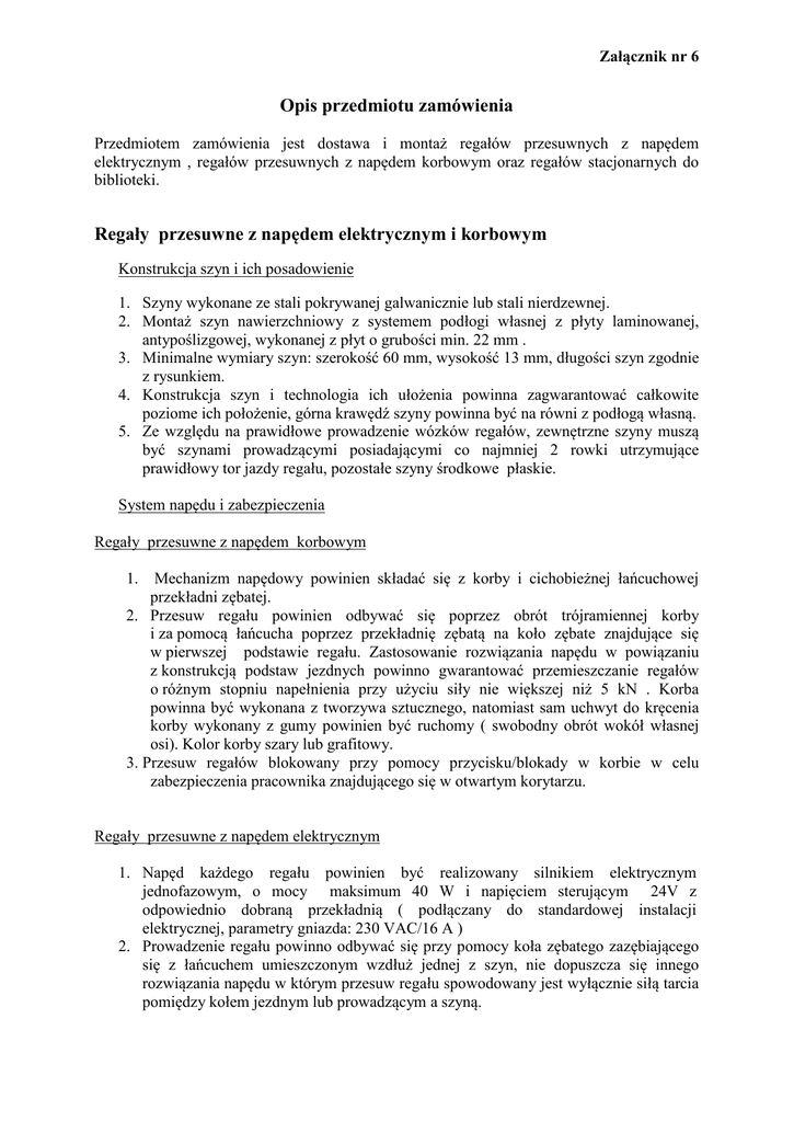 Załącznik nr 6 Opis przedmiotu zamówienia Przedmiotem zamówienia jest dostawa i montaż regałów przesuwnych z napędem elektrycznym , regałów przesuwnych z napędem korbowym oraz regałów stacjonarnych do biblioteki. Regały przesuwne z napędem elektrycznym i korbowym Konstrukcja szyn i ich posadowienie 1. Szyny wykonane ze stali pokrywanej galwanicznie lub stali nierdzewnej. 2. Montaż szyn nawierzchniowy z systemem podłogi własnej z płyty laminowanej, antypoślizgowej, wykonanej z płyt o grubości min. 22 mm . 3. Minimalne wymiary szyn: szerokość 60 mm, wysokość 13 mm, długości szyn zgodnie z rysunkiem. 4. Konstrukcja szyn i technologia ich ułożenia powinna zagwarantować całkowite poziome ich położenie, górna krawędź szyny powinna być na równi z podłogą własną. 5. Ze względu na prawidłowe prowadzenie wózków regałów, zewnętrzne szyny muszą być szynami prowadzącymi posiadającymi co najmniej 2 rowki utrzymujące prawidłowy tor jazdy regału, pozostałe szyny środkowe płaskie. System napędu i zabezpieczenia Regały przesuwne z napędem korbowym Mechanizm napędowy powinien składać się z korby i cichobieżnej łańcuchowej przekładni zębatej. 2. Przesuw regału powinien odbywać się poprzez obrót trójramiennej korby i za pomocą łańcucha poprzez przekładnię zębatą na koło zębate znajdujące się w pierwszej podstawie regału. Zastosowanie rozwiązania napędu w powiązaniu z konstrukcją podstaw jezdnych powinno gwarantować przemieszczanie regałów o różnym stopniu napełnienia przy użyciu siły nie większej niż 5 kN . Korba powinna być wykonana z tworzywa sztucznego, natomiast sam uchwyt do kręcenia korby wykonany z gumy powinien być ruchomy ( swobodny obrót wokół własnej osi). Kolor korby szary lub grafitowy. 3. Przesuw regałów blokowany przy pomocy przycisku/blokady w korbie w celu zabezpieczenia pracownika znajdującego się w otwartym korytarzu. 1. Regały przesuwne z napędem elektrycznym 1. Napęd każdego regału powinien być realizowany silnikiem elektrycznym jednofazowym, o mocy maksimum 40 W i napięciem sterującym 24V z odpowiednio dobraną przekładnią ( podłączany do standardowej instalacji elektrycznej, parametry gniazda: 230 VAC/16 A ) 2. Prowadzenie regału powinno odbywać się przy pomocy koła zębatego zazębiającego się z łańcuchem umieszczonym wzdłuż jednej z szyn, nie dopuszcza się innego rozwiązania napędu w którym przesuw regału spowodowany jest wyłącznie siłą tarcia pomiędzy kołem jezdnym lub prowadzącym a szyną. Załącznik nr 6 3. Sterowanie regałem powinno odbywać się poprzez panel sterujący znajdujący się na ścianie frontowej każdego regału . Panel powinien posiadać łatwe w obsłudze przyciski zapewniające intuicyjną obsługę systemu regałów. 4. Przesuw równoczesny kilku lub wszystkich regałów w jednym bloku powinien odbywać się po dotknięciu panelu sterującego tylko w jednym regale sąsiadującym z wybranym korytarzem . 5. Regały powinny przesuwać się w sposób płynny, w szczególności powinny charakteryzować się łagodnym startem i zatrzymaniem , aby uniemożliwić przesuwanie się książek podczas ruchu ( maksymalna prędkość przesuwu 8 m/min ). Każdy regał powinien być wyposażony w czujnik odległości montowany w podwoziu, który zapewniałby łagodne zwalnianie regalu podczas dojeżdżania do następnego. 6. Regały powinny być wyposażone w system przeciążeniowy (elektroniczny, rozłączający napęd regałów), reagujący na wzrost prądu w obwodzie elektrycznym przy natrafieniu na przeszkodę między rozsuniętymi regałami ( ochrona pracowników obsługujących regały). 7. Ze względu na bezpieczeństwo użytkowników instalacja doprowadzająca zasilanie do regałów oraz przewody sterujące powinny być poprowadzone w plastikowych osłonach znajdujących się nad najwyższą półką w każdym regale. Konstrukcja regałów 1. Podstawy (podwozia regałów) mają być wykonane z wygiętej do odpowiedniego kształtu blachy stalowej o grubości minimum 2 mm . Podstawy muszą być polakierowane proszkowo na kolor ciemny - np. grafitowy RAL7016. 2. Wysokość podstaw jezdnych: minimum 150 mm . 3. Podstawy regałów muszą być wyposażone w otwory dopasowane do osi kół. Ze względu na prawidłowe rozłożenie nacisków kół na szynę, minimalna szerokość kół w podstawach jezdnych powinna wynosić 30 mm, minimalna średnica kół 150 mm. 4. Ze względu na bezpieczeństwo obsługi podstawy jezdne muszą posiadać elementy zapobiegające wywróceniu się regałów i odboje dystansowe o szer. minimum 25 mm. 5. Odstęp pomiędzy dolną krawędzią podstawy, a górną powierzchnią torowiska powinien wynosić 10-12 mm. 6. Ściana boczna regału powinna być wykonana z blachy stalowej, malowanej proszkowo na kolor jasno-szary np.RAL 9002. Lakierowanie ściany powinno odbywać się po wykonaniu wszystkich otworów. W celu lepszego zabezpieczenia antykorozyjnego blacha stalowa powinna być przed lakierowaniem zabezpieczona powłoką fosforanową o gr. min 500 mg/m2. 7. Ściana boczna musi być wykonana jako pełna , w celu zapewnienia dużej sztywności, usztywnienie ścian powinno stanowić odpowiednie jej wyprofilowanie z jednego elementu (zagięcie na brzegach stanowiące profil zamknięty tzw. słupek ściany o wymiarach nie mniejszych niż 25x25mm. W słupkach ściany bocznej muszą znajdować się otwory do umieszczenia zaczepów półek. Zaczepy należy montować bez użycia jakichkolwiek narzędzi ( prosty montaż w celu swobodnej zmiany położenia półki ). 8. Szerokość ściany bocznej 250 mm, 300 mm lub 350 mm( zgodnie ze schematycznym rozmieszczeniem regałów). 9. W celu dostosowania wysokości światła półek do przechowywanych materiałów, otwory do zamieszczenia zaczepów półek w ścianie bocznej powinny być rozmieszczone co 15-20 mm. Załącznik nr 6 10. Półki powinny być wykonane z b