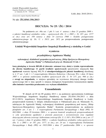 Łódzki Wojewódzki Inspektor Inspekcji Handlowej z siedzibą w Łodzi ul. Gdańska 38, 90 – 730 Łódź Łódź, dnia 20.03.2014 r. ..................................................... (oznaczenie organu Inspekcji Handlowej) Nr akt: ŻG.8361.356.2013 DECYZJA Nr 25 / ŻG / 2014 Na podstawie art. 40a ust. 1 pkt 3 i ust. 4 ustawy z dnia 21 grudnia 2000 r. o jakości handlowej artykułów rolno – spożywczych (Dz. U. z 2005 r. Nr 187, poz. 1577 ze zm.) oraz art. 104 ustawy z dnia 14 czerwca 1960 r. Kodeks postępowania administracyjnego (tj. Dz. U. z 2013, poz. 267) po przeprowadzeniu postępowania administracyjnego Łódzki Wojewódzki Inspektor Inspekcji Handlowej z siedzibą w Łodzi wymierza przedsiębiorcy Agnieszce Madaj wykonującej działalność gospodarczą pod nazwą „Sklep Spożywczo-Monopolowy Agnieszka Madaj” w Pabianicach przy ul. Moniuszki 51 lok. 1 karę pieniężną w kwocie 803,00 zł (słownie: osiemset trzy złote) z tytułu wprowadzenia do obrotu handlowego 11 partii środków spożywczych (przetworów mięsnych) bez opakowań wartości łącznej 802,70 zł nieodpowiadających jakości handlowej określonej w § 17 ust. 1 pkt 1 i 2 rozporządzenia Ministra Rolnictwa i Rozwoju Wsi z dnia 10 lipca 2007 r. w sprawie znakowania środków spożywczych (Dz. U. Nr 137, poz. 966 ze zm.) z uwagi na niepodanie, w miejscu sprzedaży na wywieszce dotyczącej danego środka spożywczego lub w inny sposób w miejscu dostępnym bezpośrednio konsumentom nazwy albo imienia i nazwiska producenta oraz wykazu składników. Uzasadnienie W dniach od 05 do 09 grudnia 2013 r. na podstawie upoważnienia Łódzkiego Wojewódzkiego Inspektora Inspekcji Handlowej numer ŻG.8361.356.2013 z dnia 05.12.2013r. inspektorzy Wojewódzkiego Inspektoratu Inspekcji Handlowej w Łodzi, przeprowadzili kontrolę w sklepie zlokalizowanym w Pabianicach przy ul. Moniuszki 51, należącym do Agnieszki Madaj, wykonującej działalność gospodarczą pod nazwą „Sklep Spożywczo-Monopolowy Agnieszka Madaj”. Kontrolę przeprowadzono na podstawie przepisów art. 3 ust. 1 - 3 rozporządzenia Parlamentu Europejskiego i Rady (WE) Nr 882/2004 z dnia 29 kwietnia 2004 r. w sprawie kontroli urzędowych przeprowadzanych w celu sprawdzenia zgodności z prawem paszowym i żywnościowym oraz regułami dotyczącymi zdrowia zwierząt i dobrostanu zwierząt (Dz. U. L 165 z 30.4.2004 ze zm.), art. 17 ust. 3 ustawy z dnia 21 grudnia 2000 r. o jakości handlowej artykułów rolno-spożywczych (Dz. U. z 2005 r. nr 187, poz. 1577, ze zm.), art. 24 ust. 1 rozporządzenia Parlamentu Europejskiego i Rady (WE) nr 1935/2004 z dnia 27 października 2004 r. w sprawie 1 materiałów i wyrobów przeznaczonych do kontaktu z żywnością oraz uchylającego dyrektywy 80/590/EWG (Dz. U. z 27.10.2004 s. 4 ze zm.), art. 3 ust. 1 pkt 1, 2 i 6 ustawy z dnia 15 grudnia 2000 r. o Inspekcji Handlowej (Dz. U. z 2009 r. Nr 151, poz. 1219 ze zm.) w obecności właścicielki Agnieszki Madaj. W trakcie prowadzonych działań kontrolnych stwierdzono, że w obrocie handlowym znajdowało się 11 partii przetworów mięsnych bez opakowań: kiełbasa wiejska w ilości 8,00 kg w cenie 19,90 zł za 1 kilogram, polędwica sopocka w ilości 4,00 kg w cenie 32,00 zł za 1 kilogram, szynka wiejska w ilości 3,90 kg w cenie 31,00 zł za 1 kilogram, rolada wieprzowa w ilości 1,80 kg w cenie 25,00 zł za 1 kilogram, baleron w ilości 2,00 kg w cenie 28,00 zł za 1 kilogram, boczek parzony w ilości 1,70 kg w cenie 22,00 zł za 1 kilogram, salceson podrobowy w ilości 1,50 kg w cenie 14,00 zł za 1 kilogram, salceson ozorowy w ilości 4,80 kg w cenie 16,00 zł za 1 kilogram, kaszanka w ilości 9,40 kg w cenie 11,00 zł za 1 kilogram, czarne w ilości 2,80 kg w cenie 10,00 zł za 1 kilogram, pasztetowa w ilości 2,70 kg w cenie 10,00 zł za 1 kilogram, wartości łącznej 802,70 zł, dla których, wbrew obowiązkowi wynikającemu z § 17 ust. 1 pkt 1 i 2 rozporządzenia Ministra Rolnictwa i Rozwoju Wsi z dnia 10 lipca 2007 r. w sprawie znakowania środków spożywczych (Dz. U. Nr 137, poz. 966 ze zm.) zwanego dalej „rozporządzeniem w sprawie znakowania środków spożywczych” nie podano wykazu składników oraz nazwy albo imienia i nazwiska producenta. Informacje te, zgodnie z § 17 ust. 2 rozporządzenia w sprawie znakowania środków spożywczych winny być podane w miejscu sprzedaży na wywieszce dotyczącej danego środka spożywczego lub w inny sposób w miejscu dostępnym bezpośrednio konsumentom. Należy tu podkreślić, iż kontrolowany przedsiębiorca nie posiadał w miejscu sprzedaży żadnych informacji (np. etykiet) dotyczących składu oferowanych do sprzedaży wędlin. Przedmiotowe wędliny strona zakupiła w Zakładzie Masarskim – Wyrób i Sprzedaż Andrzej Piątkowski, Żytowice 16, 95-200 Pabianice za fakturami VAT nr 1296/2013 i 1300/2013 z dnia 05.12.2013 r. oraz PPH Zakład Garmażeryjno-Masarski, Barbara Dobros, ul. Orzechowa 6, 95-200 Pabianice za fakturami VAT nr 1060/12/2013 i 1075/12/2013 z dnia 04.12.2013 r. Powyższe nieprawidłowości zostały udokumentowane w protokole kontroli z dnia 05 grudnia 2013 r. (numer akt ŻG.8361.356.2013), zestawieniu artykułów żywnościowych skontrolowanych pod względem oznakowania oraz na zdjęciach zrobionych w toku kontroli. W dniu 21 lutego 2014 r. zostało wszczęte z urzędu postępowanie administracyjne w przedmiocie wymierzenia kary pieniężnej wynikającej z art. 40 a ust. 1 pkt 3 ustawy z dnia 21 grudnia 2000 r. o jakości handlowej artykułów rolno – spożywczych (Dz. U. z 2005 r. nr 187, poz. 1577 ze zm.) zwanej dalej „ustawą o jakości” w związku z wprowadzeniem do obrotu przetworów mięsnych nieodpowiadających jakości handlowej. Strona została poinformowana o wszczęciu postępowania z urzędu oraz o przysługującym prawie do zapoznania się z aktami sprawy, wypowiedzenia się co do zebranych dowodów i materiałów, lecz z tego prawa nie skorzystała. Jednocześ