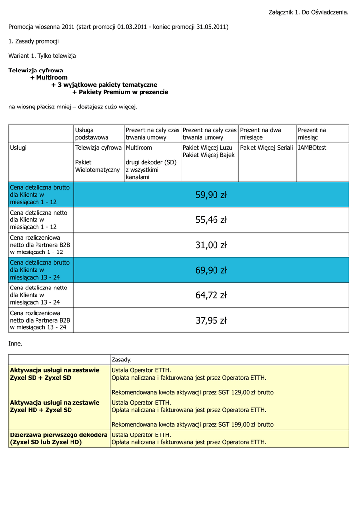 Załącznik 1. Do Oświadczenia. Promocja wiosenna 2011 (start promocji 01.03.2011 - koniec promocji 31.05.2011) 1. Zasady promocji Wariant 1. Tylko telewizja Telewizja cyfrowa + Multiroom + 3 wyjątkowe pakiety tematyczne + Pakiety Premium w prezencie na wiosnę płacisz mniej – dostajesz dużo więcej. Usługa podstawowa Usługi Prezent na cały czas Prezent na cały czas Prezent na dwa trwania umowy trwania umowy miesiące Telewizja cyfrowa Multiroom Pakiet Więcej Luzu Pakiet Więcej Seriali JAMBOtest Pakiet Więcej Bajek Pakiet drugi dekoder (SD) Wielotematyczny z wszystkimi kanałami Cena detaliczna brutto dla Klienta w miesiącach 1 - 12 59,90 zł Cena detaliczna netto dla Klienta w miesiącach 1 - 12 55,46 zł Cena rozliczeniowa netto dla Partnera B2B w miesiącach 1 - 12 31,00 zł Cena detaliczna brutto dla Klienta w miesiącach 13 - 24 69,90 zł Cena detaliczna netto dla Klienta w miesiącach 13 - 24 64,72 zł Cena rozliczeniowa netto dla Partnera B2B w miesiącach 13 - 24 37,95 zł Inne. Zasady. Aktywacja usługi na zestawie Zyxel SD + Zyxel SD Ustala Operator ETTH. Opłata naliczana i fakturowana jest przez Operatora ETTH. Rekomendowana kwota aktywacji przez SGT 129,00 zł brutto Aktywacja usługi na zestawie Zyxel HD + Zyxel SD Prezent na miesiąc Ustala Operator ETTH. Opłata naliczana i fakturowana jest przez Operatora ETTH. Rekomendowana kwota aktywacji przez SGT 199,00 zł brutto Dzierżawa pierwszego dekodera Ustala Operator ETTH. (Zyxel SD lub Zyxel HD) Opłata naliczana i fakturowana jest przez Operatora ETTH. Wariant 2. Telewizja z INTERNETEM Telewizja cyfrowa + Multiroom + 3 wyjątkowe pakiety tematyczne + Pakiety Premium w prezencie + SZYBKI ŚWIATŁOWODOWY INTERNET na wiosnę płacisz mniej – dostajesz dużo, dużo więcej. Usługa podstawowa Usługi INTERNET Telewizja cyfrowa Prezent na cały czas trwania umowy Prezent na cały czas trwania umowy Multiroom Pakiet Więcej Luzu Super szybki drugi dekoder Pakiet Więcej Stabilny Pakiet (SD) z wszystkimi Bajek Światłowodowy Wielotematyczny kanałami Cena detaliczna brutto dla Klienta w miesiącach 1 - 12 99,90 zł Cena detaliczna netto dla Klienta w miesiącach 1 - 12 92,50 zł Cena rozliczeniowa netto dla Partnera B2B w miesiącach 1 - 12 35,00 zł Cena detaliczna brutto dla Klienta w miesiącach 13 - 24 109,90 zł Cena detaliczna netto dla Klienta w miesiącach 13 - 24 101,76 zł Cena rozliczeniowa netto dla Partnera B2B w miesiącach 13 - 24 41,95 zł Prezent na dwa Prezent na miesiące miesiąc Pakiet Więcej Seriali Inne. Zasady. Aktywacja usługi na zestawie Zyxel SD + Zyxel SD + INTERNET Ustala Operator ETTH. Opłata naliczana i fakturowana jest przez Operatora ETTH. Rekomendowana kwota aktywacji przez SGT 129,00 zł brutto Aktywacja usługi na zestawie Zyxel HD + Zyxel SD + INTERNET Ustala Operator ETTH. Opłata naliczana i fakturowana jest przez Operatora ETTH. Rekomendowana kwota aktywacji przez SGT 199,00 zł brutto Dzierżawa pierwszego dekodera Ustala Operator ETTH. (Zyxel SD lub Zyxel HD) Opłata naliczana i fakturowana jest przez Operatora ETTH. JAMBOtest 2. Zasady sprzedaży usług w promocji Pakiety w Systemie Informatycznym (SMS). − do Systemu Informatycznego SGT (SMS) wprowadzone zostaną powyższe produkty (Tylko telewizja, Telewizja z INTERNETEM)), − produkty będą posiadały zdefiniowane „na sztywno” ceny detaliczne (dla Klienta) oraz Ceny Rozliczeniowe (dla Partnera B2B) – związane jest to z jednolitą kampanią promocyjną prowadzoną na całym obszarze obowiązywania promocji, − promocja będzie obowiązywała od 01.03.2011 do 31.05.2011, niezależnie od tego czy w tym samym okresie będą prowadzone inne działania promocyjne (np. promocja PAKIETY 2011 itp.), − usługa sprzedana w ramach promocji Promocji wiosennej 2011 objęta będzie 24 miesięcznym okresem zobowiązania lojalnościowego. 3. Informacje dodatkowe a) Pakiet JAMBOtest – 30 dniowy okres testowy dla wybranych Pakietów Premium, Pakietów Tematycznych i kanałów HD. Wykaz Pakietów Premium w zestawie JAMBOtest. 1. Pakiet Premium CANAL+ 2. Pakiet Premium CANAL+ HD 3. Pakiet Premium Filmbox 4. Pakiet Premium CINEMAX 5. Pakiet Premium HBO + Kanał Premium HBO HD Wykaz Pakietów Tematycznych w zestawie JAMBOtest: 1. Pakiet Więcej Discovery 2. Pakiet Więcej Muzyki Wykaz Kanałów Tematycznych HD w zestawie JAMBOtest: 1. Discovery HD Showcase 2. Animal Planet HD 3. National Geographic HD 4. Nat Geo Wild HD 5. MTVN HD 6. FOX LIFE HD 7. POLSAT SPORT HD 8. FOX HD Wykaz Kanałów Tematycznych SD w zestawie JAMBOtest: 1. Nat Geo Wild 2. Polsat Cafe 3. Polsat Film 4. Polsat News 5. Extreme Sport 6. Polsat Play 7. Zone Romantica 8. Zone Europa 9. The History Channel 10. Travel Channel