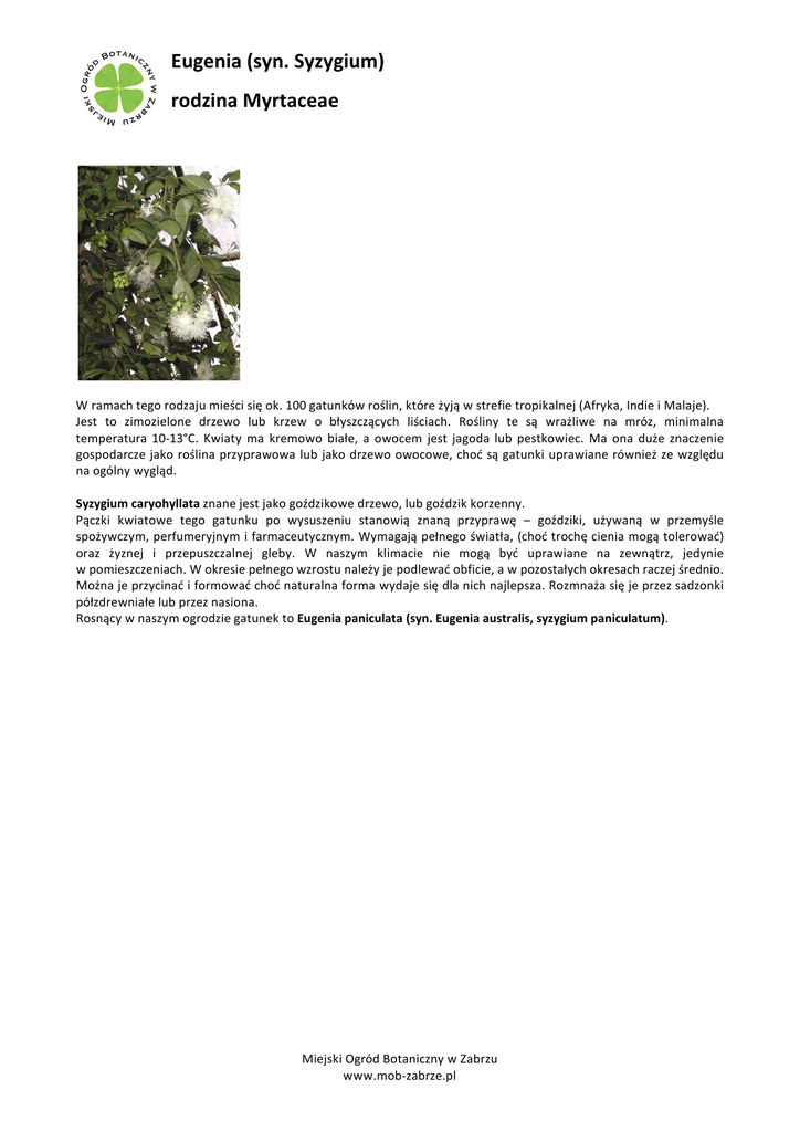 Eugenia (syn. Syzygium) rodzina Myrtaceae W ramach tego rodzaju mieści się ok. 100 gatunków roślin, które żyją w strefie tropikalnej (Afryka, Indie i Malaje). Jest to zimozielone drzewo lub krzew o błyszczących liściach. Rośliny te są wrażliwe na mróz, minimalna temperatura 10-13°C. Kwiaty ma kremowo białe, a owocem jest jagoda lub pestkowiec. Ma ona duże znaczenie gospodarcze jako roślina przyprawowa lub jako drzewo owocowe, choć są gatunki uprawiane również ze względu na ogólny wygląd. Syzygium caryohyllata znane jest jako goździkowe drzewo, lub goździk korzenny. Pączki kwiatowe tego gatunku po wysuszeniu stanowią znaną przyprawę – goździki, używaną w przemyśle spożywczym, perfumeryjnym i farmaceutycznym. Wymagają pełnego światła, (choć trochę cienia mogą tolerować) oraz żyznej i przepuszczalnej gleby. W naszym klimacie nie mogą być uprawiane na zewnątrz, jedynie w pomieszczeniach. W okresie pełnego wzrostu należy je podlewać obficie, a w pozostałych okresach raczej średnio. Można je przycinać i formować choć naturalna forma wydaje się dla nich najlepsza. Rozmnaża się je przez sadzonki półzdrewniałe lub przez nasiona. Rosnący w naszym ogrodzie gatunek to Eugenia paniculata (syn. Eugenia australis, syzygium paniculatum). Miejski Ogród Botaniczny w Zabrzu www.mob-zabrze.pl
