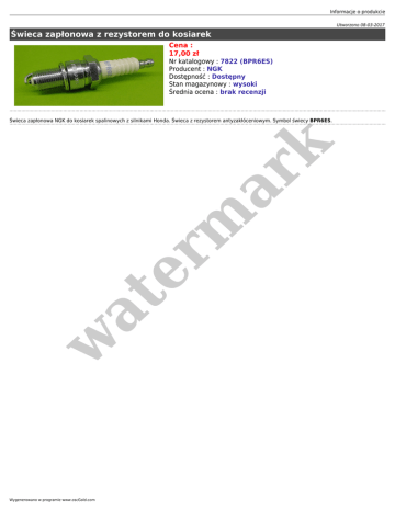 Informacje o produkcie Utworzono 08-03-2017 Świeca zapłonowa z rezystorem do kosiarek Cena : 17,00 zł Nr katalogowy : 7822 (BPR6ES) Producent : NGK Dostępność : Dostępny Stan magazynowy : wysoki Średnia ocena : brak recenzji w at er m ar k Świeca zapłonowa NGK do kosiarek spalinowych z silnikami Honda. Świeca z rezystorem antyzakłóceniowym. Symbol świecy BPR6ES. Wygenerowano w programie www.oscGold.com