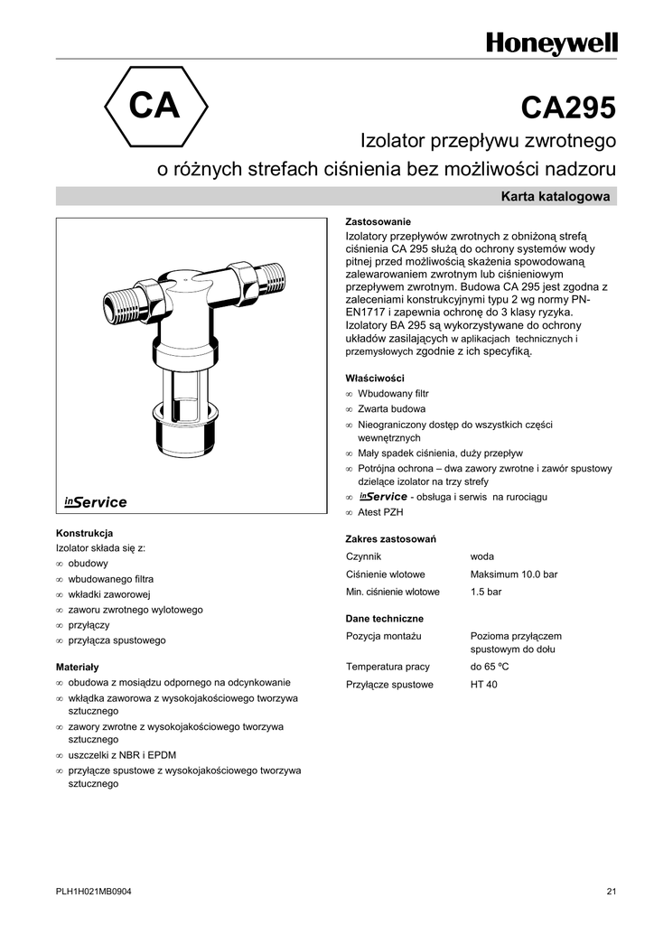 CA CA295 Izolator przepływu zwrotnego o róŜnych strefach ciśnienia bez moŜliwości nadzoru Karta katalogowa Zastosowanie Izolatory przepływów zwrotnych z obniŜoną strefą ciśnienia CA 295 słuŜą do ochrony systemów wody pitnej przed moŜliwością skaŜenia spowodowaną zalewarowaniem zwrotnym lub ciśnieniowym przepływem zwrotnym. Budowa CA 295 jest zgodna z zaleceniami konstrukcyjnymi typu 2 wg normy PNEN1717 i zapewnia ochronę do 3 klasy ryzyka. Izolatory BA 295 są wykorzystywane do ochrony układów zasilających w aplikacjach technicznych i przemysłowych zgodnie z ich specyfiką. Właściwości • Wbudowany filtr • Zwarta budowa • Nieograniczony dostęp do wszystkich części wewnętrznych • Mały spadek ciśnienia, duŜy przepływ • Potrójna ochrona – dwa zawory zwrotne i zawór spustowy dzielące izolator na trzy strefy • - obsługa i serwis na rurociągu • Atest PZH Konstrukcja Izolator składa się z: Zakres zastosowań • obudowy Czynnik woda • wbudowanego filtra Ciśnienie wlotowe Maksimum 10.0 bar • wkładki zaworowej Min. ciśnienie wlotowe 1.5 bar • zaworu zwrotnego wylotowego • przyłączy Dane techniczne • przyłącza spustowego Pozycja montaŜu Pozioma przyłączem spustowym do dołu Materiały Temperatura pracy do 65 ºC • obudowa z mosiądzu odpornego na odcynkowanie Przyłącze spustowe HT 40 • wkłądka zaworowa z wysokojakościowego tworzywa sztucznego • zawory zwrotne z wysokojakościowego tworzywa sztucznego • uszczelki z NBR i EPDM • przyłącze spustowe z wysokojakościowego tworzywa sztucznego PLH1H021MB0904 21 Izolator przepływów zwrotnych CA 295 Zasada działania Izolator przepływu zwrotnego typu CA podzielony jest na trzy strefy: wlotową, środkową i wylotową. Jeśli róŜnica ciśnienia pomiędzy strefą wlotową I środkową spadnie poniŜej 10% ciśnienia wlotowego, zawór spustowy otwiera się do atmosfery. Woda ze strefy środkowej wypływa na zewnątrz. Pomiar skuteczności ochrony jest niemoŜliwy.. Wykonania CA295 - ... A = Wersja standardowa, przyłącza ½“ i ¾“ Wielkość przyłącza Wielkość przyłącza R CięŜar (w przybliŜeniu) [kg] Wymiary [mm] L I H h Przepływ przy ∆p = 1.0 bar 22 3 [m /h] 1 /2" 3 /4" 0,50 0,70 155 84 138 121 0,7 155 87 142 121 0,7 PLH1H021MB0904 Izolator przepływów zwrotnych CA 295 Przykład instalacji Zasady instalacji zamontować zawory odcinające umoŜliwiają konserwację i obsługę bez demontaŜu izolatora, tzw. instalować poziomo, zaworem wypływowym ku dołowi zapewnić łatwy dostęp do urządzenia ułatwia konserwację i kontrolę Izolator BA295 posiada wbudowany filtr, nie ma więc konieczności montowania go (chyba, Ŝe zanieczyszczenie wody wymaga gęstszej siatki). Filtr wewnętrzny powinien być czyszczony co najmniej raz na pół roku, lub częściej jeŜeli jest to wymagane ze względu na duŜy stopień zanieczyszczenia wody. Czyszczenie filtra naleŜy do standardowych czynności eksploatacyjnych i nie podlega czynnościom wykonywanych w ramach gwarancji. filtr chroni urządzenie przed zanieczyszczeniami nie montować w miejscu naraŜonym na zalanie Typowe zastosowania Izolatory przepływu zwrotnego CA zalecane są do zastosowań w układach zasilania w aplikacjach technicznych i przemysłowych. Instaluje się w instalacjach wody pitnej w miejscach naraŜonych na kontakt z płynem zaliczanym do 3 kategorii. Powinny być instalowane w układach zasilania m.in.: instalacji grzewczych (bez inhibitorów) nadziemnych systemów zraszania systemów chłodzenia urządzeń radiologicznych urządzeń myjących w zakładach fryzjerskich urządzeń do wytwarzania wody gazowanej instalować w wentylowanych i chronionych przed zamarzaniem pomieszczeniach podłączyć do kanalizacji z odpowiednią przepustowością Za izolatorem nie moŜe być podłączone do instalacji Ŝadne inne niechronione zasilanie! Zasady eksploatacji Skuteczność działania izolatorów typu CA powinna być co 12 miesięcy badana przez osoby odpowiednio przeszkolone a wyniki badań ewidencjonowane. PLH1H021MB0904 23 Izolator przepływów zwrotnych CA 295 Izolator przepływu zwrotnego CA musi mieć odpowiednie odwodnienie z moŜliwością odprowadzenia wody. Zastrzega się prawo wprowadzenia zmian bez powiadomienia Honeywell Sp. z o.o. ul. Domaniewska 39 B 02-672 Warszawa tel.: (+48) (22) 606 09 00 fax .: (+48) (22) 606 09 01 http://www.honeywell.com.pl 24 PLH1H021MB0904