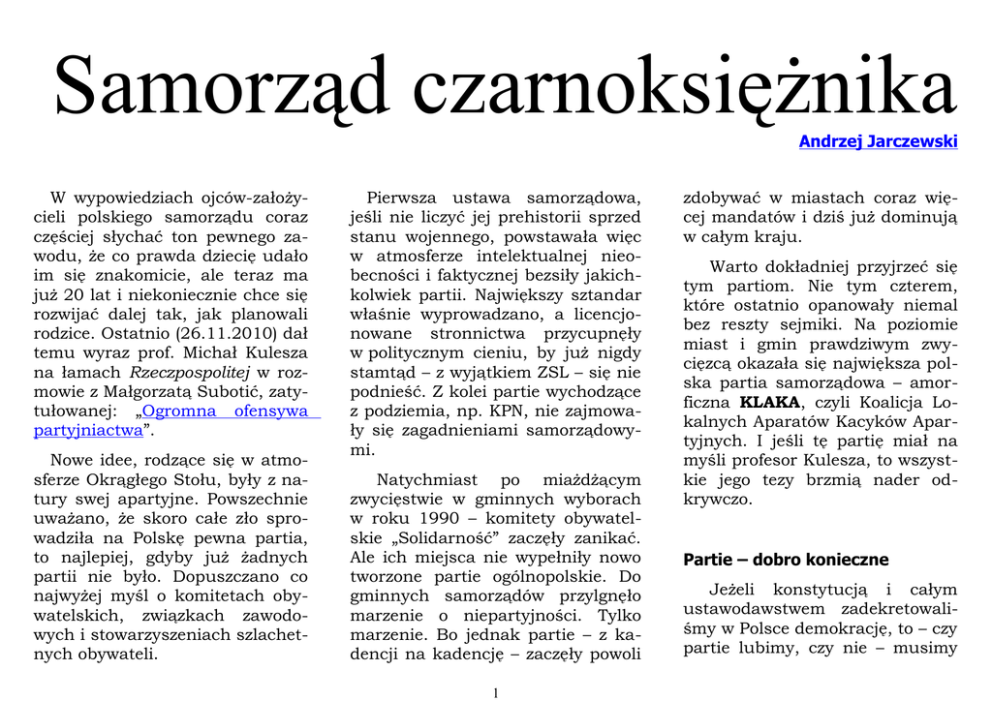 Samorząd czarnoksiężnika Andrzej Jarczewski W wypowiedziach ojców-założycieli polskiego samorządu coraz częściej słychać ton pewnego zawodu, że co prawda dziecię udało im się znakomicie, ale teraz ma już 20 lat i niekoniecznie chce się rozwijać dalej tak, jak planowali rodzice. Ostatnio (26.11.2010) dał temu wyraz prof. Michał Kulesza na łamach Rzeczpospolitej w rozmowie z Małgorzatą Subotić, zatytułowanej: „Ogromna ofensywa partyjniactwa”. Nowe idee, rodzące się w atmosferze Okrągłego Stołu, były z natury swej apartyjne. Powszechnie uważano, że skoro całe zło sprowadziła na Polskę pewna partia, to najlepiej, gdyby już żadnych partii nie było. Dopuszczano co najwyżej myśl o komitetach obywatelskich, związkach zawodowych i stowarzyszeniach szlachetnych obywateli. Pierwsza ustawa samorządowa, jeśli nie liczyć jej prehistorii sprzed stanu wojennego, powstawała więc w atmosferze intelektualnej nieobecności i faktycznej bezsiły jakichkolwiek partii. Największy sztandar właśnie wyprowadzano, a licencjonowane stronnictwa przycupnęły w politycznym cieniu, by już nigdy stamtąd – z wyjątkiem ZSL – się nie podnieść. Z kolei partie wychodzące z podziemia, np. KPN, nie zajmowały się zagadnieniami samorządowymi. Natychmiast po miażdżącym zwycięstwie w gminnych wyborach w roku 1990 – komitety obywatelskie „Solidarność” zaczęły zanikać. Ale ich miejsca nie wypełniły nowo tworzone partie ogólnopolskie. Do gminnych samorządów przylgnęło marzenie o niepartyjności. Tylko marzenie. Bo jednak partie – z kadencji na kadencję – zaczęły powoli 1 zdobywać w miastach coraz więcej mandatów i dziś już dominują w całym kraju. Warto dokładniej przyjrzeć się tym partiom. Nie tym czterem, które ostatnio opanowały niemal bez reszty sejmiki. Na poziomie miast i gmin prawdziwym zwycięzcą okazała się największa polska partia samorządowa – amorficzna KLAKA, czyli Koalicja Lokalnych Aparatów Kacyków Apartyjnych. I jeśli tę partię miał na myśli profesor Kulesza, to wszystkie jego tezy brzmią nader odkrywczo. Partie – dobro konieczne Jeżeli konstytucją i całym ustawodawstwem zadekretowaliśmy w Polsce demokrację, to – czy partie lubimy, czy nie – musimy się z ich istnieniem pogodzić. Bo polityczna natura próżni nie znosi. Miejsce na partie i tak się wypełni. Możemy tylko zastanawiać się nad smakiem i jakością farszu. A tu niestety ogólnopolskie partie popełniły katastrofalne błędy, wytwarzając sztuczną próżnię, podtrzymując puste marzenia o idealnej samorządności i całkowicie lekceważąc praktykę władz miejskich. Z kolei publicystyka wypełniona jest odpowiedziami na pytanie „jaki powinien być samorząd, żeby pasował do mojej definicji”. Nie widzę syntez pokazujących, jak dzisiejszy samorząd działa i co naprawdę napina ukryte sprężyny. Są, owszem, opisy skrajnych przypadków, ale nie ma wciąż refleksji scalającej, docierającej do istoty rzeczy, wskazującej, że nie są to patologie, lecz nieuniknione następstwa polskiego ustroju samorządowego. Nie błędy, lecz rezultaty! W zalewie tekstów, wychwalających „dobrych gospodarzy”, nie dostrzega się, że ustawą o bezpośrednim wyborze wójta, burmi- strza i prezydenta sejm ustanowił władzę absolutną szefa gminy, a same miasta już wcześniej wyposażono w rewelacyjne wręcz gwarancje bogatego finansowania. Wielka za to chwała ojcom-założycielom, bo teraz w gminach decyzje są podejmowane sprawnie, a pieniędzy starcza na ważne inwestycje, którymi tak chwalą się wójtowie przed wyborami. Szefowie gmin stali się faktycznymi suwerenami. I choć dla zachowania pozorów utrzymano istnienie okrojonych rad miejskich, to faktyczne znaczenie radnych sprowadzono niemal do zera, czyli na poziom dobry w systemach kadencyjnych i groźny – w dożywotnich. Upragnione dożywocie Te ustrojowe zasady i mechanizmy są doraźnie korzystne dla gminy, ale dla samorządności i ogólniej – dla demokracji – już nie. Ustawodawca żąda tylko przestrzegania prawa, zwłaszcza finansowego. Natomiast cała sfera decyzji merytorycznych i – co ważne – personalnych należy teraz w gminie do tylko 2 jednego człowieka. O czym więc ten człowiek myśli każdego dnia? Ano o tym, żeby już nikt nigdy nie ograniczał jego wszechwładzy. Dożywotnio! Manewruje między wielkimi partiami, ale do żadnej nie chce się zapisać, bo to by mogło w cudze ręce oddać decyzję o wyborze kandydata na wójta w następnej kadencji. Niewykluczone też, że koledzy partyjni chcieliby jakoś wpływać na decyzje kadrowe czy inwestycyjne, a przecież na to prezydent nie może się zgodzić, bo wnet prysłaby cała jego władza. Niejeden szef gminy należał już do jakiejś partii lub z jej ramienia zdobył swój mandat, a to rodzi zobowiązania, również finansowe. By się od nich uwolnić – rozsądny prezydent najpierw stara się tę partię zdominować w regionie, a gdy to okaże się niemożliwe – generuje dowolne konflikty lub po prostu ze starej partii występuje i tworzy wokół siebie parapartię, oczywiście nierejestrowaną. Jest to grupa ludzi „z dostępem do ucha”, którym powierza się pewien zakres lokalnej władzy, nieinteresujący zbytnio szefa gminy, ale opłacany z budżetu. Jedynym obowiązkiem członków partii wewnętrznej jest działać tak, żeby wójt był zadowolony. Mają nie zawracać głowy problemami i chwalić szefa w mediach, a poza tym – mogą w swojej działce robić, co chcą. Skład tej grupy to przede wszystkim aparat wykonawczy: wiceprezydenci, szefowie gminnych spółek i instytucji, wyselekcjonowani radni tudzież różni krewni i znajomi królika, wyróżniający się posłuszeństwem i nieskażoną jednomyślnością. Wielokadencyjność na stanowisku burmistrza jest praktykowana w różnych krajach z różnym skutkiem. W Kanadzie z dobrym, na Białorusi – z n