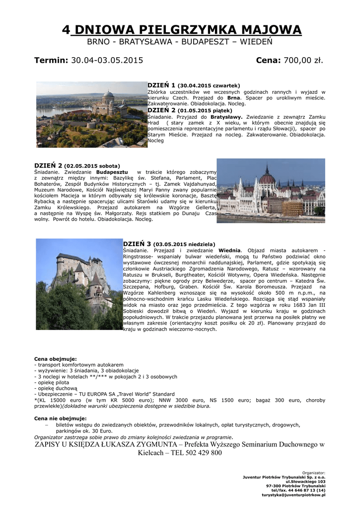 4 DNIOWA PIELGRZYMKA MAJOWA BRNO - BRATYSŁAWA - BUDAPESZT – WIEDEŃ Termin: 30.04-03.05.2015 Cena: 700,00 zł. DZIEŃ 1 (30.04.2015 czwartek) Zbiórka uczestników we wczesnych godzinach rannych i wyjazd w kierunku Czech. Przejazd do Brna. Spacer po urokliwym mieście. Zakwaterowanie. Obiadokolacja. Nocleg. DZIEŃ 2 (01.05.2015 piątek) Śniadanie. Przyjazd do Bratysławy. Zwiedzanie z zewnątrz Zamku Hrad ( stary zamek z X wieku, w którym obecnie znajdują się pomieszczenia reprezentacyjne parlamentu i rządu Słowacji), spacer po Starym Mieście. Przejazd na nocleg. Zakwaterowanie. Obiadokolacja. Nocleg DZIEŃ 2 (02.05.2015 sobota) Śniadanie. Zwiedzanie Budapesztu w trakcie którego zobaczymy z zewnątrz między innymi: Bazylikę św. Stefana, Parlament, Plac Bohaterów, Zespół Budynków Historycznych – tj. Zamek Vajdahunyad, Muzeum Narodowe, Kościół Najświętszej Maryi Panny zwany popularnie kościołem Macieja w którym odbywały się królewskie koronacje, Basztę Rybacką a następnie spacerując ulicami Starówki udamy się w kierunku Zamku Królewskiego. Przejazd autokarem na Wzgórze Gellerta, a następnie na Wyspę św. Małgorzaty. Rejs statkiem po Dunaju Czas wolny. Powrót do hotelu. Obiadokolacja. Nocleg. DZIEŃ 3 (03.05.2015 niedziela) Śniadanie. Przejazd i zwiedzanie Wiednia. Objazd miasta autokarem Ringstrasse- wspaniały bulwar wiedeński, mogą tu Państwo podziwiać okno wystawowe ówczesnej monarchii naddunajskiej, Parlament, gdzie spotykają się członkowie Austriackiego Zgromadzenia Narodowego, Ratusz – wzorowany na Ratuszu w Brukseli, Burgtheater, Kościół Wotywny, Opera Wiedeńska. Następnie zobaczymy: piękne ogrody przy Belwederze, spacer po centrum – Katedra Św. Szczepana, Hofburg, Graben. Kościół Św. Karola Boromeusza. Przejazd na Wzgórze Kahlenberg wznoszące się na wysokość około 500 m n.p.m., na północno-wschodnim krańcu Lasku Wiedeńskiego. Rozciąga się stąd wspaniały widok na miasto oraz jego przedmieścia. Z tego wzgórza w roku 1683 Jan III Sobieski dowodził bitwą o Wiedeń. Wyjazd w kierunku kraju w godzinach popołudniowych. W trakcie przejazdu planowana jest przerwa na posiłek płatny we własnym zakresie (orientacyjny koszt posiłku ok 20 zł). Planowany przyjazd do kraju w godzinach wieczorno-nocnych. Cena obejmuje: - transport komfortowym autokarem - wyżywienie: 3 śniadania, 3 obiadokolacje - 3 noclegi w hotelach **/*** w pokojach 2 i 3 osobowych - opiekę pilota - opiekę duchową - Ubezpieczenie – TU EUROPA SA „Travel World” Standard *(KL 15000 euro (w tym KR 5000 euro); NNW 3000 euro, NS 1500 euro; bagaż 300 euro, choroby przewlekłe)(dokładne warunki ubezpieczenia dostępne w siedzibie biura. Cena nie obejmuje: biletów wstępu do zwiedzanych obiektów, przewodników lokalnych, opłat turystycznych, drogowych, parkingów ok. 30 Euro. Organizator zastrzega sobie prawo do zmiany kolejności zwiedzania w programie . ZAPISY U KSIĘDZA ŁUKASZA ZYGMUNTA – Prefekta Wyższego Seminarium Duchownego w Kielcach – TEL 502 429 800 Organizator: Juventur Piotrków Trybunalski Sp. z o.o. ul.Słowackiego 103 97-300 Piotrków Trybunalski tel/fax. 44 646 87 13 (14) [email protected]