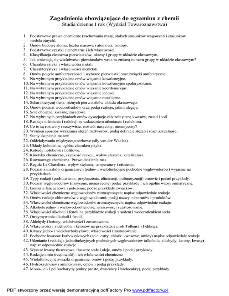 Zagadnienia obowiązujące do egzaminu z chemii Studia dzienne I rok (Wydział Towaroznawstwa) 1. Podstawowe prawa chemiczne (zachowania masy, stałych stosunków wagowych i stosunków wielokrotnych). 2. Omów budowę atomu, liczba masowa i atomowa, izotopy. 3. Podstawowe cząstki elementarne i ich właściwości. 4. Klasyfikacja okresowa pierwiastków, okresy i grupy w układzie okresowym. 5. Jak zmieniają się właściwości pierwiastków wraz ze zmianą numeru grupy w układzie okresowym? 6. Charakterystyka i właściwości metali. 7. Charakterystyka i właściwości niemetali. 8. Omów pojęcie amfoteryczności i wybrane pierwiastki oraz związki amfoteryczne. 9. Na wybranym przykładzie omów wiązanie kowalencyjne. 10. Na wybranym przykładzie omów wiązanie kowalencyjne spolaryzowane. 11. Na wybranym przykładzie omów wiązanie koordynacyjne. 12. Na wybranym przykładzie omów wiązanie jonowe. 13. Na wybranym przykładzie omów wiązanie metaliczne. 14. Scharakteryzuj tlenki różnych pierwiastków układu okresowego. 15. Omów podział wodorotlenków oraz podaj reakcje, jakim ulegają. 16. Sole obojętne, kwaśne, zasadowe. 17. Na wybranych przykładach omów dysocjacje elektrolityczną kwasów, zasad i soli. 18. Reakcje utleniania i redukcji ze wskazaniem utleniacza i reduktora. 19. Co to są roztwory rzeczywiste, roztwór nasycony, nienasycony? 20. Wymień sposoby wyrażania stężeń roztworów, podaj definicje stężeń i rozpuszczalności. 21. Stany skupienia materii. 22. Oddziaływania międzycząsteczkowe (siły van der Waalsa). 23. Układy koloidalne, ogólna charakterystyka. 24. Koloidy liofobowe i liofilowe. 25. Kinetyka chemiczna, szybkość reakcji, wpływ stężenia, katalizatora. 26. Równowaga chemiczna. Prawo działania mas. 27. Reguła Le Chateliera, wpływ stężenia, temperatury i ciśnienia. 28. Podział związków organicznych (jedno- i wielofunkcyjne pochodne węglowodorów) wyjaśnić na przykładach. 29. Typy reakcji (podstawienia, przyłączenia, eliminacji, polimeryzacji) omówić i podać przykłady. 30. Podział węglowodorów (nasycone, nienasycone) podać przykłady i ich ogólne wzory sumaryczne. 31. Izomeria łańcuchowa i położenia; podać przykłady związków. 32. Właściwości chemiczne węglowodorów nienasyconych; napisz odpowiednie reakcje. 33. Omów reakcje chlorowców z węglowodorami; podaj nazwy substratów i produktów. 34. Właściwości chemiczne węglowodorów aromatycznych; napisz odpowiednie reakcje. 35. Alkohole jedno- i wielowodorotlenowe; właściwości i zastosowanie. 36. Właściwości alkoholi i fenoli na przykładzie reakcji z sodem i wodorotlenkiem sodu. 37. Otrzymywanie alkoholi i fenoli. 38. Aldehydy i ketony; właściwości i zastosowanie. 39. Właściwości i aldehydów i ketonów na przykładzie prób Tollensa i Fehlinga. 40. Kwasy jedno- i wielokarboksylowe; właściwości i zastosowanie. 41. Pochodne kwasów karboksylowych (sole, estry, chlorki kwasowe, amidy) napisz odpowiednie reakcje. 42. Utlenianie i redukcja jednofunkcyjnych pochodnych węglowodorów (alkohole, aldehydy, ketony, kwasy) napisz odpowiednie reakcje. 43. Wyższe kwasy tłuszczowe, tłuszcze stałe i oleje, omów i podaj przykłady. 44. Rodzaje amin (rzędowość) i ich właściwości chemiczne. 45. Wielofunkcyjne związki organiczne, omów i podaj przykłady. 46. Hydroksykwasy i aminokwasy, omów i podaj przykłady. 47. Mono-, di- i polisacharydy (cukry proste, dwucukry i wielocukry), podaj przykłady. PDF stworzony przez wersję demonstracyjną pdfFactory Pro www.pdffactory.pl