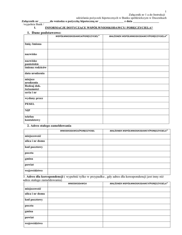 1 Załącznik nr 1 a do Instrukcji udzielania pożyczek hipotecznych w Banku spółdzielczym w Dusznikach Załącznik nr _______do wniosku o pożyczkę hipoteczną nr ________________ z dnia _________________ /wypełnia Bank / I. INFORMACJE DOTYCZĄCE WSPÓŁWNIOSKODAWCY/ PORĘCZYCIELA* 1. Dane podstawowe: WSPÓŁWNIOSKODAWCA/PORĘCZYCIEL* MAŁŻONEK WSPÓŁWNIOSKODAWCY/PORĘCZYCIELA* Imię /imiona nazwisko nazwisko panieńskie imiona rodziców data urodzenia miejsce urodzenia Rodzaj dok. tożsamości seria i nr wydany przez PESEL NIP telefon kontaktowy 2. Adres stałego zameldowania WNIOSKODAWCA/PORĘCZYCIEL MAŁŻONEK WSPÓŁWNIOSKODAWCY/PORĘCZYCIELA* miejscowość ulica i nr domu kod pocztowy poczta gmina powiat województwo 3. Adres dla korespondencji ( wypełnić tylko w przypadku , gdy adres dla korespondencji jest inny niż adres stałego zameldowania) WNIOSKODAWCA miejscowość ulica i nr domu kod pocztowy poczta gmina powiat województwo MAŁŻONEK WSPÓŁWNIOSKODAWCY/PORĘCZYCIELA* 2 II. INFORMACJA O SYTUACJI MAJĄTKOWEJ I RODZINNEJ: Współwnioskodawca/ Poręczyciel* a) stan cywilny panna/kawaler mężatka/żonaty wdowa/wdowiec rozwiedziony/a separacja b) rozdzielność tak/nie)* c) liczba członków rodziny __________ w tym na utrzymaniu ___________ d) Status obecnie zajmowanego mieszkania : Współwnioskodawca/Poręczyciel* • Własny dom/ mieszkanie* o powierzchni Małżonek współwnioskodawcy/Poręczyciela* • _____________m2 • Najmowane od : spółdzielni mieszkaniowej/ Własny dom/ mieszkanie* o powierzchni _______m2 • Gminy/osoby fizycznej/osoby prawnej* Najmowane od : spółdzielni mieszkaniowej/ Gminy/osoby fizycznej/osoby prawnej* • z rodziną * • z rodziną * • Inne ______________________________* • Inne ______________________________* ______________________________________ _______________________________________ e) Składniki majątku- poza wymienionymi w pkt. d) Współwnioskodawca/Poręczyciel* Małżonek współwnioskodawcy/Poręczyciela* 1. Nieruchomości (działka, dom , mieszkanie ) , wymienić i podać adres, wartość , powierzchnię ________________________________________ 1. Nieruchomości (działka, dom , mieszkanie ) , wymienić i podać adres, wartość , powierzchnię ________________________________________ ________________________________________ ________________________________________ ________________________________________ ________________________________________ ________________________________________ ________________________________________ 2. Grunty rolne o powierzchni ____________ ha 2. Grunty rolne o powierzchni ____________ ha położone w ____________________________ położone w ____________________________ ________________________________________ ________________________________________ ________________________________________ ________________________________________ własność , współwłasność , dzierżawa, inny tytuł* 3. Samochody ( marka, rok produkcji, wartość) własność , współwłasność , dzierżawa, inny tytuł* 3. Samochody ( marka, rok produkcji, wartość) ________________________________________ ________________________________________ ________________________________________ ________________________________________ 3 Współwnioskodawca/Poręczyciel* Małżonek współwnioskodawcy/Poręczyciela* 4.Rachunki bankowe ( podać bank, rodzaj rachunku : 4.Rachunki bankowe (podać bank, rodzaj rachunku: ROR, bieżący, lokata terminowa, kwotę) ROR, bieżący, lokata terminowa, kwotę) _________________________________________ _________________________________________ _________________________________________ _________________________________________ _________________________________________ _________________________________________ 5.Udziały, akcje w spółkach (nazwa spółki, wielkość 5.Udziały, akcje w spółkach (nazwa spółki, udziałów, ilość akcji) wielkość udziałów, ilość akcji) _________________________________________ _________________________________________ ________________________________________ ________________________________________ 6. Posiadane polisy na życie ( nazwa towarzystwa ubezpieczeniowego, suma ubezpieczenia) _______________________________________ _______________________________________ 6. Posiadane polisy na życie ( nazwa towarzystwa ubezpieczeniowego, suma ubezpieczenia) _______________________________________ _______________________________________ III. INFORMACJA O SYTUACJI ZAWODOWEJ I OSIĄGANYCH DOCHODACH Współwnioskodawca/Poręczyciel* Małżonek współwnioskodawcy/Poręczyciela* 1.Nazwa i adres pracodawcy______________________ 1.Nazwa i adres pracodawcy________________ ____________________________________________ _____________________________________ _____________________________________________ _______________________________________ Stanowisko ___________________________________ Stanowisko _____________________________ Staż pracy____________________________________ Staż pracy_______________________________ Nr telefonu ___________________________ Nr telefonu ________________________ 2.Dochód miesięczny netto ______________________ 2.Dochód miesięczny netto_________________ ___________________________________________ _____________________________________ 3.Prowadzona działalność gospodarcza ( nazwa , rodzaj i forma działalności) ___________________________________________ 3.Prowadzona działalność gospodarcza ( nazwa , rodzaj i forma działalności) _____________________________________ ___________________________________________ _____________________________________ ___________________________________________ _______________________________________ 4.Okres prowadzonej działalności ________________ 4.Okres prowadzonej działalności ____________ 5. .Dochód miesięczny netto z prowadzonej 5. .Dochód miesięczny netto z prowadzonej działalności _______________________________ działalności _____________________________ ___________