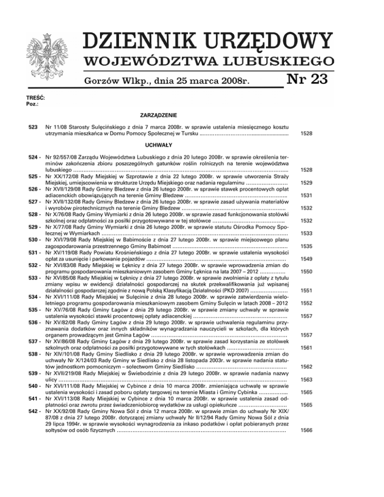 Gorzów Wlkp., dnia 25 marca 2008r. Nr 23 TREŚĆ: Poz.: ZARZĄDZENIE 523 Nr 11/08 Starosty Sulęcińskiego z dnia 7 marca 2008r. w sprawie ustalenia miesięcznego kosztu utrzymania mieszkańca w Domu Pomocy Społecznej w Tursku ...………………………......................... 1528 UCHWAŁY 524 - Nr 92/557/08 Zarządu Województwa Lubuskiego z dnia 20 lutego 2008r. w sprawie określenia terminów zakończenia zbioru poszczególnych gatunków roślin rolniczych na terenie województwa lubuskiego ………………………………….………………………………………………………………………... 525 - Nr XX/172/08 Rady Miejskiej w Szprotawie z dnia 22 lutego 2008r. w sprawie utworzenia Straży Miejskiej, umiejscowienia w strukturze Urzędu Miejskiego oraz nadania regulaminu …………………… 526 - Nr XVII/129/08 Rady Gminy Bledzew z dnia 26 lutego 2008r. w sprawie stawek procentowych opłat adiacenckich obowiązujących na terenie Gminy Bledzew ………………………………………………….. 527 - Nr XVII/132/08 Rady Gminy Bledzew z dnia 26 lutego 2008r. w sprawie zasad używania materiałów i wyrobów pirotechnicznych na terenie Gminy Bledzew ……….………………………………………….. 528 - Nr X/76/08 Rady Gminy Wymiarki z dnia 26 lutego 2008r. w sprawie zasad funkcjonowania stołówki szkolnej oraz odpłatności za posiłki przygotowywane w tej stołówce …………….…………………….. 529 - Nr X/77/08 Rady Gminy Wymiarki z dnia 26 lutego 2008r. w sprawie statutu Ośrodka Pomocy Społecznej w Wymiarkach …………….………………………………………………………………………………. 530 - Nr XVI/79/08 Rady Miejskiej w Babimoście z dnia 27 lutego 2008r. w sprawie miejscowego planu zagospodarowania przestrzennego Gminy Babimost ……………………………………………………….… 531 - Nr XV/119/08 Rady Powiatu Krośnieńskiego z dnia 27 lutego 2008r. w sprawie ustalenia wysokości opłat za usunięcie i parkowanie pojazdów ……………………………………………………………………… 532 - Nr XVI/83/08 Rady Miejskiej w Łęknicy z dnia 27 lutego 2008r. w sprawie wprowadzenia zmian do programu gospodarowania mieszkaniowym zasobem Gminy Łęknica na lata 2007 – 2012 …………… 533 - Nr XVI/85/08 Rady Miejskiej w Łęknicy z dnia 27 lutego 2008r. w sprawie zwolnienia z opłaty z tytułu zmiany wpisu w ewidencji działalności gospodarczej na skutek przekwalifikowania już wpisanej działalności gospodarczej zgodnie z nową Polską Klasyfikacją Działalności (PKD 2007) …….…………… 534 - Nr XVI/111/08 Rady Miejskiej w Sulęcinie z dnia 28 lutego 2008r. w sprawie zatwierdzenia wieloletniego programu gospodarowania mieszkaniowym zasobem Gminy Sulęcin w latach 2008 – 2012 535 - Nr XV/76/08 Rady Gminy Łagów z dnia 29 lutego 2008r. w sprawie zmiany uchwały w sprawie ustalenia wysokości stawki procentowej opłaty adiacenckiej ……………………………………………… 536 - Nr XV/82/08 Rady Gminy Łagów z dnia 29 lutego 2008r. w sprawie uchwalenia regulaminu przyznawania dodatków oraz innych składników wynagradzania nauczycieli w szkołach, dla których organem prowadzącym jest Gmina Łagów …………………………………………………………………… 537 - Nr XV/86/08 Rady Gminy Łagów z dnia 29 lutego 2008r. w sprawie zasad korzystania ze stołówek szkolnych oraz odpłatności za posiłki przygotowywane w tych stołówkach …………………………… 538 - Nr XIV/101/08 Rady Gminy Siedlisko z dnia 29 lutego 2008r. w sprawie wprowadzenia zmian do uchwały Nr X/124/03 Rady Gminy w Siedlisko z dnia 28 listopada 2003r. w sprawie nadania statutów jednostkom pomocniczym – sołectwom Gminy Siedlisko ……………………………………………. 539 - Nr XVII/219/08 Rady Miejskiej w Świebodzinie z dnia 29 lutego 2008r. w sprawie nadania nazwy ulicy ……………………………………………………………….…………………………………………………. 540 - Nr XVI/111/08 Rady Miejskiej w Cybince z dnia 10 marca 2008r. zmieniająca uchwałę w sprawie ustalenia wysokości i zasad poboru opłaty targowej na terenie Miasta i Gminy Cybinka …………….. 541 - Nr XVI/113/08 Rady Miejskiej w Cybince z dnia 10 marca 2008r. w sprawie ustalenia zasad odpłatności oraz zwrotu przez świadczeniobiorcę wydatków za usługi opiekuńcze ………………………. 542 - Nr XX/92/08 Rady Gminy Nowa Sól z dnia 12 marca 2008r. w sprawie zmian do uchwały Nr XIX/ 87/08 z dnia 27 lutego 2008r. dotyczącej zmiany uchwały Nr II/12/94 Rady Gminy Nowa Sól z dnia 29 lipca 1994r. w sprawie wysokości wynagrodzenia za inkaso podatków i opłat pobieranych przez sołtysów od osób fizycznych ……………………………………………………………………………………. 1528 1529 1531 1532 1532 1533 1535 1549 1550 1551 1552 1557 1557 1561 1562 1563 1565 1565 1566 OBWIESZCZENIA 543 - Komisarza Wyborczego w Zielonej Górze z dnia 10 marca 2008r. o wynikach wyborów uzupełniających do Rady Miejskiej w Małomicach przeprowadzonych w dniu 9 marca 2008r. ………......... 544 - Nr 2/08 Prezydenta Miasta Zielona Góra z dnia 10 marca 2008r. w sprawie operatu opisowo – kartograficznego modernizacji ewidencji gruntów i założenia ewidencji budynków na obszarze miasta Zielona Góra …..………………………………………………………………………………………………....... 1567 1567 SPRAWOZDANIE 545 - z działalności Komisji Bezpieczeństwa i Porządku za rok 2007 ………………………………………....... 1568 ======================================================================================== 523 ZARZĄDZENIE NR 11/08 STAROSTY SULĘCIŃSKIEGO z dnia 7 marca 2008r. w sprawie ustalenia miesięcznego kosztu utrzyma