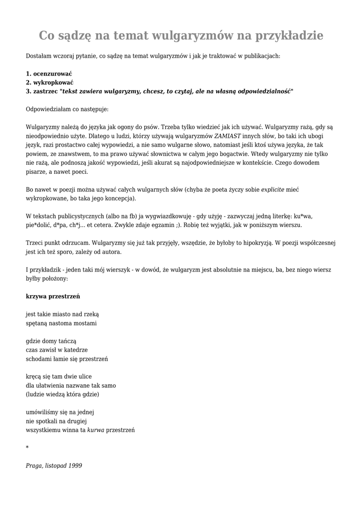 Co sądzę na temat wulgaryzmów na przykładzie Dostałam wczoraj pytanie, co sądzę na temat wulgaryzmów i jak je traktować w publikacjach: 1. ocenzurować 2. wykropkować 3. zastrzec "tekst zawiera wulgaryzmy, chcesz, to czytaj, ale na własną odpowiedzialność" Odpowiedziałam co następuje: Wulgaryzmy należą do języka jak ogony do psów. Trzeba tylko wiedzieć jak ich używać. Wulgaryzmy rażą, gdy są nieodpowiednio użyte. Dlatego u ludzi, którzy używają wulgaryzmów ZAMIAST innych słów, bo taki ich ubogi język, razi prostactwo całej wypowiedzi, a nie samo wulgarne słowo, natomiast jeśli ktoś używa języka, że tak powiem, ze znawstwem, to ma prawo używać słownictwa w całym jego bogactwie. Wtedy wulgaryzmy nie tylko nie rażą, ale podnoszą jakość wypowiedzi, jeśli akurat są najodpowiedniejsze w kontekście. Czego dowodem pisarze, a nawet poeci. Bo nawet w poezji można używać całych wulgarnych słów (chyba że poeta życzy sobie explicite mieć wykropkowane, bo taka jego koncepcja). W tekstach publicystycznych (albo na fb) ja wygwiazdkowuję - gdy użyję - zazwyczaj jedną literkę: ku*wa, pie*dolić, d*pa, ch*j... et cetera. Zwykle zdaje egzamin ;). Robię też wyjątki, jak w poniższym wierszu. Trzeci punkt odrzucam. Wulgaryzmy się już tak przyjęły, wszędzie, że byłoby to hipokryzją. W poezji współczesnej jest ich też sporo, zależy od autora. I przykładzik - jeden taki mój wierszyk - w dowód, że wulgaryzm jest absolutnie na miejscu, ba, bez niego wiersz byłby położony: krzywa przestrzeń jest takie miasto nad rzeką spętaną nastoma mostami gdzie domy tańczą czas zawisł w katedrze schodami łamie się przestrzeń kręcą się tam dwie ulice dla ułatwienia nazwane tak samo (ludzie wiedzą która gdzie) umówiliśmy się na jednej nie spotkali na drugiej wszystkiemu winna ta kurwa przestrzeń * Praga, listopad 1999