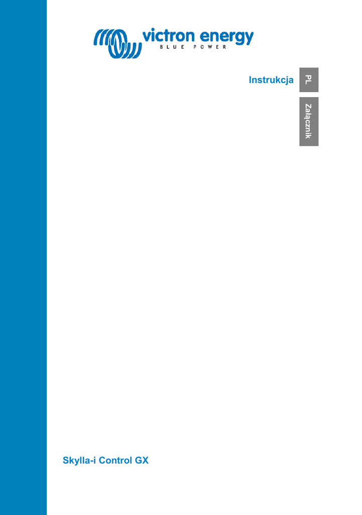 PL Instrukcja Załącznik Skylla-i Control GX PL 1. Informacje ogólne Obsługa Po włączeniu zasilania magistrali na panelu Skylla-i na krótko włączają się wszystkie symbole. Następnie wyświetlany jest numer wersji oprogramowania, po czym wyświetlone zostaje wskazanie stanu podłączonej ładowarki Skylla-i. Aby ograniczyć pobór mocy, wyłączenie zasilania ładowarki Skylla-i (tryb czuwania) powoduje wyłączenie panelu (gasną wszystkie kontrolki). Kiedy ładowarka Skylla-i działa, aktualny stan naładowania jest wskazywany przed diody LED stanu. W poniższej tabeli przedstawiono możliwe wskazania za pomocą diod LED podczas normalnego ładowania. Stan Diody LED Bulk (ładowanie prądem maksymalnym) Tryb ochronny Absorption (ładowanie absorpcyjne) Automatic equalization (ładowanie z automatycznym wyrównywaniem) Float/storage (ładowanie płynne/faza magazynowania) Manual equalization (ładowanie z ręcznym wyrównywaniem) Power supply mode (tryb zasilania) Alarm* świeci stale miga Bulk Absorption Float Alarm wył. * Kiedy świeci się dioda LED alarmu, na wyświetlaczu jest widoczny kod błędu. Opis ogólny kodów błędów — patrz załącznik C. Podczas normalnego działania ładowarki można przełączać za pomocą pokrętła następujące parametry: prąd ładowania, napięcie akumulatora, natężenie prądu wejściowego, wartość graniczna natężenia prądu wejściowego. Parametr aktywny jest wskazywany niebieską diodą LED w strefie stanu. Parametry są wyświetlane na wyświetlaczu w jednostkach SI (amperach lub woltach) z jedną cyfrą dziesiętną. W przypadku natężenia prądu ładowarki równego lub wyższego niż 100 A cyfra dziesiętna znika. Podczas regulacji napięcia lub natężenia prądu za pomocą potencjometrów panelu Skylla-i na wyświetlaczu podawana jest ustawiona wartość (migająca). Załącznik Panel Skylla-i to zdalny panel przeznaczony do współpracy z ładowarkami Skylla-i. Ładowarki Skylla-i wykorzystują magistralę VE.CAN. Procedura podłączania panelu Skylla-i do ładowarki Skylla-i jest prosta. Połączyć oba urządzenia za pomocą zwykłego przewodu UTP (skrętki nieekranowanej) wyposażonego w dwa złącza RJ45. Upewnić się, że na obu końcówkach znajdują się terminatory RJ45. Panel Skylla-i jest dostarczany z dwoma terminatorami RJ45. Zarówno ładowarka, jak i panel Skylla-i są wyposażone w dwa połączone wewnętrznie gniazda RJ45 umożliwiające podłączenie przewodu. 1.1 Włączanie i wyłączanie ładowarki Ładowarka Skylla-i jest włączana i wyłączana poprzez krótkie naciśnięcie przycisku on|off (wł.|wył.). Należy pamiętać, że główny włącznik zasilania ładowarki jest nadrzędny. Jeżeli jest on wyłączony w ładowarce, ładowarki nie można włączyć z panelu. 1.2. Ustawianie wartości granicznej natężenia prądu wejściowego ładowarki Wartość graniczną natężenia prądu wejściowego można zmieniać poprzez krótkie naciskanie i zwalnianie pokrętła. Jeżeli parametr ten nie był aktualnie aktywny, naciśnięcie przycisku powoduje automatyczne przełączenie na ten parametr. Następnie na wyświetlaczu wyświetlana jest aktualna wartość graniczna natężenia prądu wejściowego, która miga. Aby zmienić wartość graniczną natężenia prądu wejściowego, obrócić pokrętło. Aby potwierdzić nową wartość, poczekać kilka sekund lub na krótko nacisnąć i zwolnić pokrętło. 1.3 Jasność diod LED Dla zapewnienia wygody jasność diod LED jest dostosowywana automatycznie za pomocą czujnika światła. Jeżeli poziom oświetlenia otoczenia obniża się, diody LED stają się mniej jasne. Jest do bardziej przyjazne dla oczu i zmniejsza zużycie energii. 1.4 Wiele paneli Skylla-i i paneli sterowania w jednej sieci VE.Can Do jednej ładowarki lub do zestawu zsynchronizowanych połączonych równolegle ładowarek można podłączyć kilka paneli sterowania Skylla-i. Nie jest konieczna żadna konfiguracja instalacji poza sterownikiem. Wystarczy podłączyć wszystkie ładowarki Skylla-i, panel sterowania i założyć wszystkie terminatory. Ustawienia należy zmienić jedynie w instalacjach, w których wiele ładowarek Skylla-i jest podłączonych do tej samej sieci VE.Can podczas ładowania różnych zestawów akumulatorów w celu uniemożliwienia ich synchronizacji. Wszystkie ładowarki Skylla-i i panele sterowania Skylla-i rozpoznają się nawzajem na podstawie numerów urządzeń. Domyślnym numerem urządzenia dla paneli sterowania i ładowarek Skylla-i jest zero. Aby zmienić numer urządzenia, należy użyć narzędzia sieciowego NMEA2000 np. firmy Actisense lub Maretron. Załącznik Lista kodów błędów i ostrzeżeń — patrz najnowsza wersja instrukcji panelu Skylla-i. Należy pamiętać, że powyższa funkcja jest dostępna w ładowarkach Skylla-i i panelach sterowania Skylla-i z oprogramowaniem układowym w wersji od 2.00. PL Aby ręcznie wyzerować numer urządzenia w panelu sterowania Skylla-i, na cztery sekundy nacisnąć przycisk z tyłu urządzenia. Po upływie czterech sekund panel uruchamia się ponownie (wszystkie diody LED włączają się na chwilę), a numer urządzenia zostaje ustawiony na zero. PL Załącznik A — Rozwiązywanie problemów Załącznik PL Jeżeli nie jest możliwe nawiązanie połączenia z ładowarką Skylla-i, choć okablowanie jest na pewno prawidłowe i terminatory sieci VE.Can są założone, należy najpierw sprawdzić sekwencję włączania zasilania, podłączając panel (zgodnie z sekwencją włączania zasilania). W ten sposób można sprawdzić, czy zasilanie magistrali jest włączone. Jeżeli połączenie zostanie utracone podczas pracy (np. zerwanie lub odłączenie przewodu), miga czerwona dioda alarmowa, a na wyświetlaczu pojawia się komunikat „NC” oznaczający, że panel nie odbiera danych z ładowarki. Ładowarka zachowuje ustawienia wartości granicznej natężenia prądu wejściowego, chyba że zostanie 