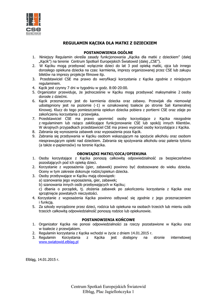 REGULAMIN KĄCIKA DLA MATKI Z DZIECKIEM 1. 2. 3. 4. 5. 6. 7. 8. 9. POSTANOWIENIA OGÓLNE Niniejszy Regulamin określa zasady funkcjonowania „Kącika dla matki z dzieckiem” (dalej „Kącik”) na terenie Centrum Spotkań Europejskich Światowid (dalej „CSE”). W Kąciku mogą przebywać wyłącznie dzieci do lat 3 pod opieką matki, ojca lub innego dorosłego opiekuna dziecka na czas: karmienia, imprezy organizowanej przez CSE lub zakupu biletów na imprezy projekcje filmowe itp. Przedstawiciel CSE ma prawo do weryfikacji korzystania z Kącika zgodnie z niniejszym regulaminem. Kącik jest czynny 7 dni w tygodniu w godz. 8:00-20:00. Organizator przewiduje, że jednocześnie w Kąciku mogą przebywać maksymalnie 2 osoby dorosłe z dziećmi. Kącik przeznaczony jest do karmienia dziecka oraz zabawy. Przewijak dla niemowląt udostępniony jest na poziomie (-1) w oznakowanej toalecie po stronie Sali Kameralnej Kinowej. Klucz do tego pomieszczenia opiekun dziecka pobiera z portierni CSE oraz zdaje po zakończeniu korzystania z przewijaka. Przedstawiciel CSE ma prawo upomnieć osoby korzystające z Kącika niezgodnie z regulaminem lub rażąco zakłócające funkcjonowanie CSE lub spokój innych Klientów. W skrajnych przypadkach przedstawiciel CSE ma prawo wyprosić osoby korzystające z Kącika. Zabrania się wynoszenia zabawek oraz wyposażenia poza Kącik. Zabrania się przebywania w Kąciku osobom wskazującym na spożycie alkoholu oraz osobom niesprawującym opieki nad dzieckiem. Zabrania się spożywania alkoholu oraz palenia tytoniu (a także e-papierosów) na terenie Kącika. OBOWIĄZKI MATKI/OJCA/OPIEKUNA 1. Osoby korzystające z Kącika ponoszą całkowitą odpowiedzialność za bezpieczeństwo pozostających pod ich opieką dzieci. 2. Korzystanie z wyposażenia (gier, zabawek) powinno być dostosowane do wieku dziecka. Oceny w tym zakresie dokonuje rodzic/opiekun dziecka. 3. Osoby przebywające w Kąciku mają obowiązek: a) szanowania jego wyposażenia, gier, zabawek; b) szanowania innych osób przebywających w Kąciku; c) dbania o porządek, tj. złożenia zabawek po zakończeniu korzystania z Kącika oraz sprzątnięcie powstałych nieczystości. 4. Korzystanie z wyposażenia Kącika powinno odbywać się zgodnie z jego przeznaczeniem i funkcją. 5. Za szkody wyrządzone przez dzieci, rodzica lub opiekuna na osobach trzecich lub mieniu osób trzecich całkowitą odpowiedzialność ponoszą rodzice lub opiekunowie. POSTANOWIENIA KOŃCOWE 1. Organizator Kącika nie ponosi odpowiedzialności za rzeczy pozostawione w Kąciku oraz w toalecie z przewijakiem. 2. Regulamin korzystania z Kącika wchodzi w życie z dniem 14.01.2015 r. 3. Regulamin Korzystania z Kącika jest dostępny na stronie internetowej www.swiatowid.elblag.pl Elbląg, 14.01.2015 r. Centrum Spotkań Europejskich Światowid Elbląg, Plac Jagiellończyka 1