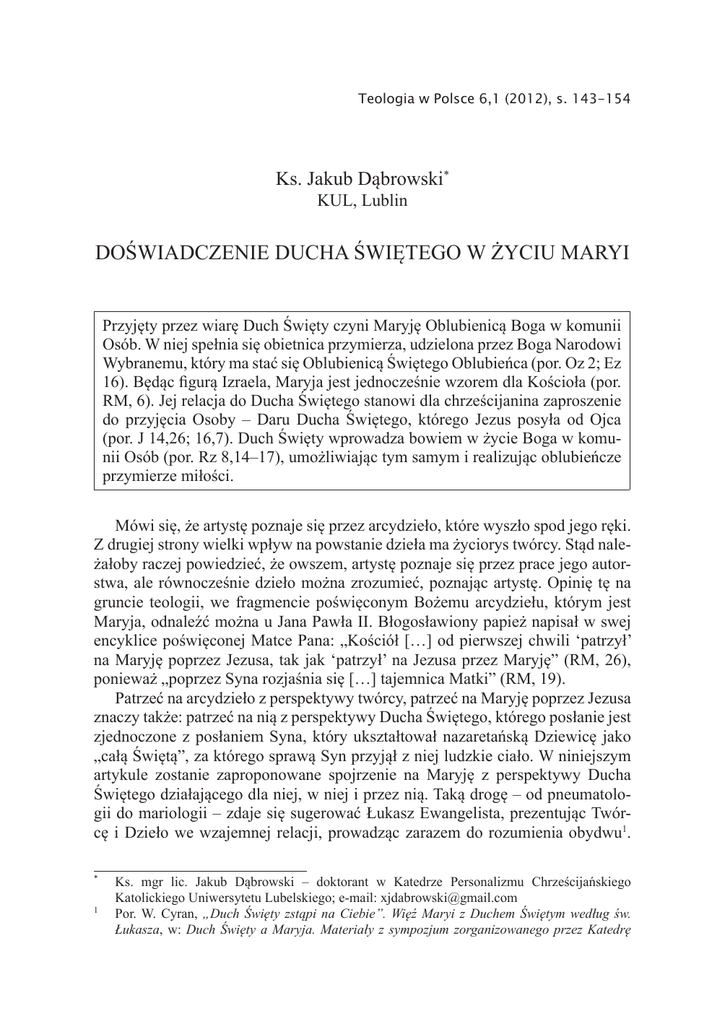 Teologia w Polsce 6,1 (2012), s. 143-154 Ks. Jakub Dąbrowski* KUL, Lublin DOŚWIADCZENIE DUCHA ŚWIĘTEGO W ŻYCIU MARYI Przyjęty przez wiarę Duch Święty czyni Maryję Oblubienicą Boga w komunii Osób. W niej spełnia się obietnica przymierza, udzielona przez Boga Narodowi Wybranemu, który ma stać się Oblubienicą Świętego Oblubieńca (por. Oz 2; Ez 16). Będąc figurą Izraela, Maryja jest jednocześnie wzorem dla Kościoła (por. RM, 6). Jej relacja do Ducha Świętego stanowi dla chrześcijanina zaproszenie do przyjęcia Osoby – Daru Ducha Świętego, którego Jezus posyła od Ojca (por. J 14,26; 16,7). Duch Święty wprowadza bowiem w życie Boga w komunii Osób (por. Rz 8,14–17), umożliwiając tym samym i realizując oblubieńcze przymierze miłości. Mówi się, że artystę poznaje się przez arcydzieło, które wyszło spod jego ręki. Z drugiej strony wielki wpływ na powstanie dzieła ma życiorys twórcy. Stąd należałoby raczej powiedzieć, że owszem, artystę poznaje się przez prace jego autorstwa, ale równocześnie dzieło można zrozumieć, poznając artystę. Opinię tę na gruncie teologii, we fragmencie poświęconym Bożemu arcydziełu, którym jest Maryja, odnaleźć można u Jana Pawła II. Błogosławiony papież napisał w swej encyklice poświęconej Matce Pana: „Kościół […] od pierwszej chwili ‘patrzył’ na Maryję poprzez Jezusa, tak jak ‘patrzył’ na Jezusa przez Maryję” (RM, 26), ponieważ „poprzez Syna rozjaśnia się […] tajemnica Matki” (RM, 19). Patrzeć na arcydzieło z perspektywy twórcy, patrzeć na Maryję poprzez Jezusa znaczy także: patrzeć na nią z perspektywy Ducha Świętego, którego posłanie jest zjednoczone z posłaniem Syna, który ukształtował nazaretańską Dziewicę jako „całą Świętą”, za którego sprawą Syn przyjął z niej ludzkie ciało. W niniejszym artykule zostanie zaproponowane spojrzenie na Maryję z perspektywy Ducha Świętego działającego dla niej, w niej i przez nią. Taką drogę – od pneumatologii do mariologii – zdaje się sugerować Łukasz Ewangelista, prezentując Twórcę i Dzieło we wzajemnej relacji, prowadząc zarazem do rozumienia obydwu1. Ks. mgr lic. Jakub Dąbrowski – doktorant w Katedrze Personalizmu Chrześcijańskiego Katolickiego Uniwersytetu Lubelskiego; e-mail: [email protected] 1 Por. W. Cyran, „Duch Święty zstąpi na Ciebie”. Więź Maryi z Duchem Świętym według św. Łukasza, w: Duch Święty a Maryja. Materiały z sympozjum zorganizowanego przez Katedrę * Ks. Jakub Dąbrowski Zasadniczym celem niniejszego tekstu będzie danie impulsu do poznawania Ducha Świętego w Jego więzi z Maryją. Jako że Maryja jest wciąż obecna w życiu Kościoła w sposób czynny i wzorczy (por. RM, 1), próba zgłębienia tajemnicy jej osoby z perspektywy jej więzi z Duchem Świętym pozwoli dostrzec możliwości otwierające się przed każdym wierzącym, który zdecyduje się ją naśladować i prosić o towarzyszenie w pielgrzymce wiary. Pielgrzymka wiary, choć realizowana przez każdego człowieka osobiście2, nawiązuje do wielkiego pielgrzymowania Izraela ku Ziemi Obiecanej, opisanego i reinterpretowanego na kartach Starego Testamentu. Kategorią ściśle związaną z dziejami tej wędrówki jest rzeczywistość przymierza zawartego między Bogiem a Narodem Wybranym, zerwanego przez ten ostatni, zapowiedzianego przez Boga jako trwałe, mające być zrealizowane przez Niego w nowy sposób w przyszłości. Dla Ewangelisty Łukasza, którego dzieło stanowić będzie niejako bazę dla poniższego tekstu, Maryja jest figurą Izraela i wzorem Ludu Bożego3, który w niej osiąga swoje spełnienie i dociera do kresu swej wędrówki. Dlatego i w jej życiu kategoria przymierza (szczególnej więzi z Bogiem) zajmuje ważne miejsce. Choć „pielgrzymowanie przez wiarę nie jest już więcej udziałem Bogarodzicy”, to jednak „w tym eschatologicznym spełnieniu Maryja nie przestaje być ‘Gwiazdą Przewodnią’ (Maris Stella) dla wszystkich, którzy jeszcze pielgrzymują” (RM, 6). W pierwszym paragrafie artykułu Maryja zostanie ukazana jako figura Izraela, w której, dla której i przez którą spełniają się starotestamentalne obietnice, w tym zapowiedź wylania Ducha Świętego. Szczególnym zainteresowaniem – już w drugim paragrafie – objęta zostanie realizacja przez Boga zapowiedzi trwałego przymierza i związana z nią postać Oblubienicy, którą staje się Maryja dzięki relacji z Duchem Świętym. W końcu w paragrafie trzecim omówione zostaną owoce głębokiej więzi Maryi z Duchem. Całość zostanie zamknięta wnioskami o charakterze praktycznym, pomyślanymi jako wskazówki dla osobistego życia duchowego czy posługi w Kościele. Maryja – figura Izraela (obietnica przymierza) Na rozumienie doświadczenia Ducha Świętego przez Maryję istotne światło rzuca dialog nazaretańskiej Dziewicy z Gabrielem (por. Łk 1,26–38). Rozpoczyna się on od słów Bożego posłańca: „Raduj się, napełniona łaską, Pan z Tobą”4 Mariologii KUL oraz Oddział PTT w Częstochowie. Częstochowa, 22–23 maja 1998 roku, red. S.C. Napiórkowski, T. Siudy, K. Kowalik, Częstochowa 1999, s. 11. 2 Jan Paweł II napisał, że oprócz wymiaru ponadindywidualnego „pielgrzymowanie wiary wskazuje na dzieje wewnętrzne […], na ‘dzieje dusz’” (RM, nr 6). 3 Por. W. Cyran, Duch Święty zstąpi na Ciebie, s. 26. 4 Tłumaczenie polskie: „Bądź pozdrowiona, pełna łaski, Pan z Tobą”, nie jest w stanie oddać – jak to dalej zostanie ukazane – głębi greckiego oryginału: Chaire kecharitōmenē, ho Kyrios meta sou. 144 TwP 6,1 (2012) Doświadczenie Ducha Świętego w życiu Maryi (Łk 1,28). Pozdrowienie Maryi przez anioła, które w zasadzie jest wezwaniem do radości (greckie chaire), odpowiada wezwaniu, jakie w So 3,14 prorok kieruje do Izraela: „Raduj się […], Córko Syjonu”5. Podobieństwo obydwu tekstów,