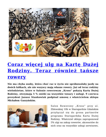 Coraz więcej ulg na Kartę Dużej Rodziny. Teraz również tańsze rowery Nie ma chyba osoby, która choć raz w życiu nie spróbowałaby jazdy na dwóch kółkach, ale nie wszyscy mają własne rowery. Już od teraz rodziny wielodzietne, które w Salonie rowerowym „Kross” pokażą Kartę Dużej Rodziny, otrzymają 5 % zniżki na wszystkie towary i usługi. 9 czerwca prezydent Janusz Stankowiak podpisał umowę z właścicielem sklepu Michałem Gaszyńskim. Salon Rowerowy „Kross” przy ul. Zblewskiej 10b w Starogardzie Gdańskim przyłączył się do grona partnerów programu Starogardzka Karta Dużej Rodziny. Właściciel sklepu zaproponował 5% ulgi na zakup rowerów, akcesoriów do nich oraz na wszystkie usługi serwisowe, jakie świadczy Salon. Z rabatu mogą korzystać nie tylko starogardzianie, którzy mają Kartę Dużej Rodziny, ale również rodziny wielodzietne z całego powiatu –zadeklarował podczas spotkania z prezydentem właściciel sklepu. – Bardzo się cieszę, że mogę pomóc mieszkańcom – powiedział Michał Gaszyński. Rower to idealny sposób na aktywne i ciekawe spędzanie wolnego czasu oraz na uwolnienie się od korków w mieście. Jazda na rowerze kojarzy się z niczym nie skrępowaną wolnością podróżowania i eksplorowania natury. Byłoby wspaniale, gdyby jeszcze więcej ludzi przesiadło się z aut na rowery. Życzyłbym tego i miastu chociażby ze względu na ekologię, jak i sobie z wiadomych powodów – dodał z uśmiechem. Przypominamy, że Salon Rowerowy „Kross” to już jedenasty partner programu starogardzkiej KDR. Wszystkie informacje na temat oferowanych ulg i rabatów znajdziecie na naszej stronie internetowej w zakładce „dużym rodzinom” http://starogard.pl/karta-duzej-rodziny/ulgi-dla-rodzin-wielodzietnych/
