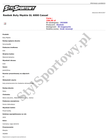 Informacje o produkcie Utworzono 08-03-2017 Reebok Buty Męskie GL 6000 Casual Cena : 199,99 zł Nr katalogowy : V62600 Producent : Reebok Dostępność : W magazynie Średnia ocena : brak recenzji Produkt: pl Buty Męskie Rodzaj zapięcia obuwia: y. Sznurowadła Podeszwa środkowa: Wnętrze butów: Materiał tekstylny Wysokość obcasa: brak Sezon: Jesień/Zima 42 Wskazówki użycia: lS p Rozmiar prezentowany na zdjęciach: buty przeznaczone do chodzenia rekreacyjnego Pełne Cholewka: St y Rodzaj obuwia: or to w EVA Skóra naturalna , Materiał syntetyczny , Zamsz Podeszwa zewnętrzna: Guma niebrudząca Wysokość butów: Przed kostkę Kolekcja zaprojektowana na rok: 2015 Kolor: Czerwony i jego odcienie Przeznaczenie: Klasyka V62600 Wygenerowano w programie www.oscGold.com Dostępne opcje Reebok Buty Męskie GL 6000 Casual St y lS p or to w y. pl Rozmiar: 41, 42, 43, 44, 45, 45.5, 47.