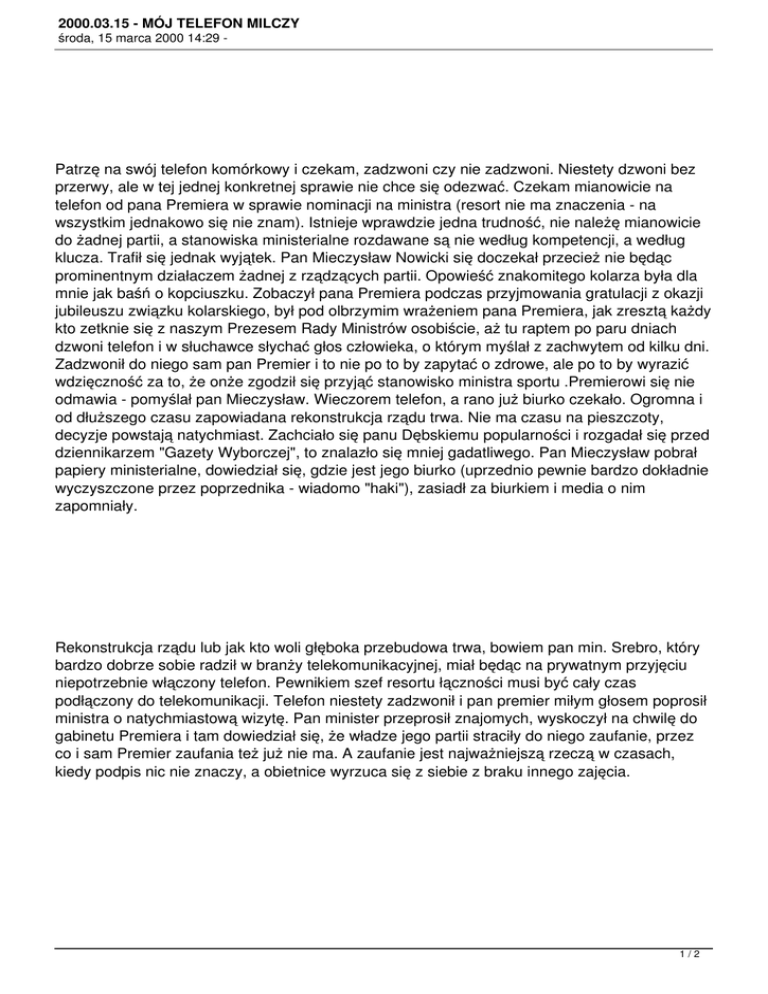 2000.03.15 - MÓJ TELEFON MILCZY środa, 15 marca 2000 14:29 - Patrzę na swój telefon komórkowy i czekam, zadzwoni czy nie zadzwoni. Niestety dzwoni bez przerwy, ale w tej jednej konkretnej sprawie nie chce się odezwać. Czekam mianowicie na telefon od pana Premiera w sprawie nominacji na ministra (resort nie ma znaczenia - na wszystkim jednakowo się nie znam). Istnieje wprawdzie jedna trudność, nie należę mianowicie do żadnej partii, a stanowiska ministerialne rozdawane są nie według kompetencji, a według klucza. Trafił się jednak wyjątek. Pan Mieczysław Nowicki się doczekał przecież nie będąc prominentnym działaczem żadnej z rządzących partii. Opowieść znakomitego kolarza była dla mnie jak baśń o kopciuszku. Zobaczył pana Premiera podczas przyjmowania gratulacji z okazji jubileuszu związku kolarskiego, był pod olbrzymim wrażeniem pana Premiera, jak zresztą każdy kto zetknie się z naszym Prezesem Rady Ministrów osobiście, aż tu raptem po paru dniach dzwoni telefon i w słuchawce słychać głos człowieka, o którym myślał z zachwytem od kilku dni. Zadzwonił do niego sam pan Premier i to nie po to by zapytać o zdrowe, ale po to by wyrazić wdzięczność za to, że onże zgodził się przyjąć stanowisko ministra sportu .Premierowi się nie odmawia - pomyślał pan Mieczysław. Wieczorem telefon, a rano już biurko czekało. Ogromna i od dłuższego czasu zapowiadana rekonstrukcja rządu trwa. Nie ma czasu na pieszczoty, decyzje powstają natychmiast. Zachciało się panu Dębskiemu popularności i rozgadał się przed dziennikarzem "Gazety Wyborczej", to znalazło się mniej gadatliwego. Pan Mieczysław pobrał papiery ministerialne, dowiedział się, gdzie jest jego biurko (uprzednio pewnie bardzo dokładnie wyczyszczone przez poprzednika - wiadomo "haki"), zasiadł za biurkiem i media o nim zapomniały. Rekonstrukcja rządu lub jak kto woli głęboka przebudowa trwa, bowiem pan min. Srebro, który bardzo dobrze sobie radził w branży telekomunikacyjnej, miał będąc na prywatnym przyjęciu niepotrzebnie włączony telefon. Pewnikiem szef resortu łączności musi być cały czas podłączony do telekomunikacji. Telefon niestety zadzwonił i pan premier miłym głosem poprosił ministra o natychmiastową wizytę. Pan minister przeprosił znajomych, wyskoczył na chwilę do gabinetu Premiera i tam dowiedział się, że władze jego partii straciły do niego zaufanie, przez co i sam Premier zaufania też już nie ma. A zaufanie jest najważniejszą rzeczą w czasach, kiedy podpis nic nie znaczy, a obietnice wyrzuca się z siebie z braku innego zajęcia. 1/2 2000.03.15 - MÓJ TELEFON MILCZY środa, 15 marca 2000 14:29 - Okazało się potem, że pan min. Srebro sam sobie był winien, bo poprzez sukcesy swego resortu "stał się za bardzo medialny". Co prawda to prawda. Telefonia się rozwija, coraz więcej automatów i usług telefonicznych. Komórkowca ma już niemal każdy. Zwykły śmiertelnik myśli sobie, że to jest zasługa jakiegoś łącznościowego gwiazdora, a przecież partia, która go na to stanowisko wysłała też powinna coś z tej popularności mieć. Wystawiła zatem partia innego kandydata, który z łącznością ma styczność poprzez telefon od wielu lat i mamy nadzieję, że ów nie będzie kreował się na superstara, tylko skromnie spuści zawsze oczy mówiąc: to nie ja, to my. Stojąc na schodach samolotu powołał pan premier jeszcze jednego ministra, ale minister kultury wiedział już wcześniej o swojej kandydaturze, bo ze zrozumiałych względów ministra szukano. Uważać jednak musi, żeby i on nie stracił zaufania kierownictwa swojej partii. Jako minister od występowania sam pewnie często będzie publicznie się pokazywał i może się zdarzyć, że w którymś tygodniu w "Wiadomościach" pokażą namaszczonego dopiero co ministra, a szefa partii nie. To się może powtórzyć wielokrotnie i już utrata zaufania wisi na włosku. Radzę zatem panu ministrowi, a jest to w końcu mój resort, żeby starał się jak najrzadziej pokazywać w mediach, podejmował jak najmniej decyzji merytorycznych, bo o niemożliwość podejmowania decyzji finansowych zadbał już minister finansów. Do kilku panów już telefon zadzwonił. Może zadzwoni w końcu i do mnie. 2/2