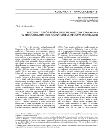 KOMUNIKATY – ANNOUNCEMENTS Acta Militaria Mediaevalia I Sztuka wojenna na pograniczu polsko-rusko-słowackim w średniowieczu Kraków – Sanok 2005, s. 165-169 Piotr N. Kotowicz NIEZNANY TOPÓR PÓŹNOŚREDNIOWIECZNY Z RADYMNA W ZBIORACH ARCHEOLOGICZNYCH MUZEUM W JAROSŁAWIU W 1983 r. do zbiorów archeologicznych Muzeum w Jarosławiu trafił znaleziony przypadkowo w Radymnie, pow. Jarosław, okazały późnośredniowieczny topór (nr inw. MJ A451)1. Okaz ten posiada bardzo długą i smukłą szyjkę, przechodzącą w asymetryczne, lekko opuszczone ostrze z niewielką brodą. Na ostrzu widoczne są ślady nakuwania nakładki z innego rodzaju metalu. Osada prostokątna w rzucie bocznym, nieco skorodowana, wewnątrz otworu zachowane nikłe ślady toporzyska (ryc. 1, fot. 1-2). Wymiary: dł. całk. – 33,5 cm; szer. ostrza – 15,0 cm; najmn. szer. szyjki – 2,6 cm; szer. osady – 4,4 cm; średn. osady – 3,2 cm x 5,1 cm; wys. osady – 7,1 cm; waga – 1,88 kg. Analizowany okaz został znaleziony na terenie żwirowni w Radymnie, miejsca znanego z dużej ilości znalezisk militariów i narzędzi średniowiecznych, przechowywanych głównie w Muzeum Narodowym Ziemi Przemyskiej w Przemyślu. Pierwotnie kolekcja ta, licząca 34 zabytki, została opublikowana przez A. Koperskiego (Koperski 1975; 1980); analizę metaloznawczą wybranych zabytków przeprowadził J. Piaskowski (Piaskowski 1981). Jeden z mieczy, znajdujący się w zbiorach Muzeum Okręgowego w Rzeszowie, opublikowała A. Gruszczyńska (Gruszczyńska 1979). Broń obuchowa (czekan, topory i buława brązowa) z tego stanowiska, poszerzona o jeden egzemplarz ze zbiorów prywatnych, znalazła się następnie w monografii tej kategorii uzbrojenia autorstwa M. Głoska (Głosek 1996). Pełną analizę militariów znalezionych na terenie żwirowni w Radymnie, wraz z zabytkami w zbiorach prywatnych kolekcjonerów, przeprowadził P. A. Nowakowski (Nowakowski 1998). W żadnym z tych opracowań nie uwzględniono jednak publikowanego tutaj zabytku2. Podstawową pozycją omawiającą topory późnośredniowieczne jest monografia tej kategorii zabytków autorstwa M. Głoska (Głosek 1996). Przystępując do analizy typologicznej egzemplarza z Radymna, napotkano od razu na pewne trudności interpretacyjne. Wiąże się to z nie do końca jasnymi podstawami, zastosowanymi we wspomnianej pracy, wyróżniania konkretnych typów interesującej nas formy uzbrojenia. Powoduje to, że niektóre z analizowanych w niej okazów równie dobrze mogłyby zostać przyporządkowane do innych typów. Podobnie było w trakcie poszukiwań analogii do okazu z Radymna, do którego brak, ze względu na rozmiary, odpowiednika w opublikowanym materiale. Znacznie krótsze i mniejsze, ale posiadające zbliżone proporcje3, są niektóre topory zaliczone do dwóch różnych typów – VIII i IX. Oba te typy posiadają wydzieloną osadę, w rzucie bocznym z reguły prostokątną, i dość krótką szyjkę. Różni je głównie samo żeleźce, które w typie VIII jest wąskie i długie, rzadko przekraczające długość osady, natomiast w typie IX szerokie i zakończone ukształtowaną kończasto brodą (Głosek 1996, 38, 41; por. też Ławrynowicz, 1 Za możliwość opublikowania zabytku, a także wszechstronną pomoc autor składa serdeczne podziękowania Pani mgr Joannie Kociubie z Muzeum w Jarosławiu. 2 Niestety, jest to spowodowane brakiem kwerendy w sąsiednich placówkach muzealnych. Za przykład służyć może też inny zabytek z Radymna – wczesnośredniowieczny miecz typu X, którego lokalizacji ustalić nie mógł P. A. Nowakowski (Nowakowski 1998, 11). Jest to o tyle dziwne, że miecz ten, przechowywany w zbiorach Muzeum Okręgowego w Rzeszowie (nr inw. 1295/MRP), był, jak wspomniano, przedmiotem oddzielnej publikacji (Gruszczyńska 1979; por. też Kotowicz 2004, 36, nr kat. 125, fot. 27). 3 Punktem wyjściowym do określania proporcji topora wydaje się być stosunek jego długości całkowitej do szerokości ostrza, co przy zbliżonej formie może mieć znaczenie w określaniu typologii. 166 Piotr N. Kotowicz Ryc. 1. Późnośredniowieczny topór z Radymna, pow. Jarosław. Rys. P. N. Kotowicz. Fig. 1. Late mediaeval axe from Radymno, Jarosław distr. Drawned by P. N. Kotowicz. Strzyż 2003, 262). Jak widzimy, decydujące znaczenie ma tutaj samo żeleźce, które w omawianym okazie jest znacznej długości, jednak jego szerokość znacznie przekracza długość osady. Podobne topory, zaliczone przez M. Głoska do typu VIII, pochodzą z Krakowa-Zwierzyńca, pow. Kraków, oraz ze Smolic, pow. Oświęcim, i datowane są na XIII-XV (?) oraz XIV-XVI (?) w. (Głosek 1996, nr kat. 39 i 100, tabl. XIII: A, H). Podobieństwo do topora z Radymna wykazuje również, zaliczony do tego typu, egzemplarz pochodzący z Muchowa, pow. Jawor (Firszt 2001, 277, ryc. 25)4. Zwłaszcza pierwszy z przytoczonych toporów, mimo mniejszych rozmiarów, kształtem i proporcjami mocno nawiązuje do analizowanego okazu. Sprawa byłaby prosta, gdyby nie fakt, że analogiczne ukształtowanie i proporcje wykazuje również jeden z toporów z Radymna, zaliczony jednak przez M. Głoska, a za nim przez P. A. Nowakowskiego, do typu IX i datowany na XIII-XIV w. (Głosek 1996, 41, nr kat. 95, tabl. XX:H; Nowakowski 1998, 19-20, nr kat. 19, tabl. 8:3). Naszym zdaniem topór ten jednak niewiele albo wcale nie różni się od wcześniej omawianych i należałoby go przyporządkować do typu VIII wg Głoska. Jeśli jednak nasze rozumowanie jest błędne, to konieczne jest wprowadzenie dodatkowych, być może liczbowych wskaźników, pozwalających grupować interesujące nas formy uzbrojenia, zwłaszcza w obrębie typów, między którymi granice są słabo uchwytne. Pamiętamy jednak przy tym, że w przypadku tak popularnej broni, jaką był niewątpliwie topór, liczyć się należy z inwencją własną producenta broni i zbytnie uszczegóławianie wzorców typologicznych może prowadzić do tw
