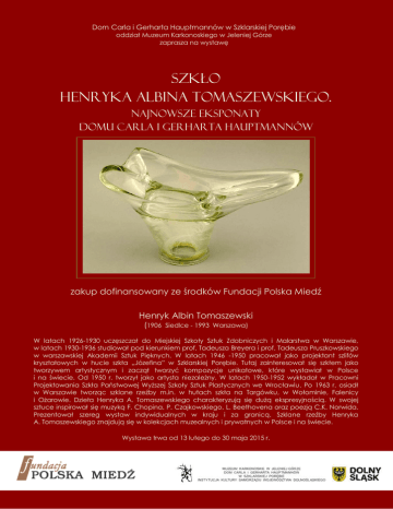 Dom Carla i Gerharta Hauptmannów w Szklarskiej Porębie oddział Muzeum Karkonoskiego w Jeleniej Górze zaprasza na wystawę wysta Szkło Henryka Albina Tomaszewskiego. Najnowsze EKSPONATY Domu Carla i Gerharta Hauptmannów zakup dofinansowany ze środków Fundacji Polska Miedź Henryk Albin Tomaszewski (1906 Siedlce - 1993 Warszawa) W latach 1926-1930 uczęszczał do Miejskiej Szkoły Sztuk Zdobniczych i Malarstwa w Warszawie, w latach 1930-1936 studiował pod kierunkiem prof. Tadeusza Breyera i prof. Tadeusza Pruszkowskiego w warszawskiej Akademii Sztuk Pięknych. W latach 1946 -1950 pracował jako projektant szlifów kryształowych w hucie szkła „Józefina” w Szklarskiej Porębie. Tutaj zainteresował się szkłem jako tworzywem artystycznym i zaczął tworzyć kompozycje unikatowe, które wystawiał w Polsce i na świecie. Od 1950 r. tworzył jako artysta niezależny. W latach 1950-1952 wykładał w Pracowni Projektowania Szkła Państwowej Wyższej Szkoły Sztuk Plastycznych we Wrocławiu. Po 1963 r. osiadł w Warszawie tworząc szklane rzeźby m.in. w hutach szkła na Targówku, w Wołominie, Falenicy i Ożarowie. Dzieła Henryka A. Tomaszewskiego charakteryzują się dużą ekspresyjnością. W swojej sztuce inspirował się muzyką F. Chopina, P. Czajkowskiego, L. Beethovena oraz poezją C.K. Norwida. Prezentował szereg wystaw indywidualnych w kraju i za granicą. Szklane rzeźby Henryka A. Tomaszewskiego znajdują się w kolekcjach muzealnych i prywatnych w Polsce i na świecie. Wystawa trwa od 13 lutego do 30 maja 2015 r.