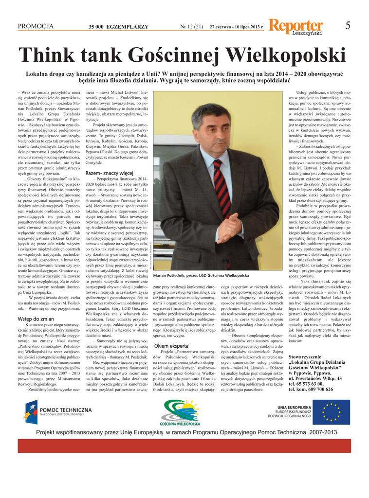 PROMOCJA Nr 12 (21) 35 000 EGZEMPLARZY 5 27 czerwca - 10 lipca 2013 r. Think tank Gościnnej Wielkopolski Lokalna droga czy kanalizacja za pieniądze z Unii? W unijnej perspektywie finansowej na lata 2014 – 2020 obowiązywać będzie inna filozofia działania. Wygrają te samorządy, które zaczną współdziałać Wstęp do zmian Kierowane przez niego stowarzyszenie realizuje projekt, który samorządy Południowej Wielkopolski przygotowuje na zmiany. Nosi nazwę: „Partnerstwo samorządów Południowej Wielkopolski na rzecz zwiększenia jakości i dostępności usług publicznych”. Zdobył unijne dofinansowanie w ramach Programu Operacyjnego Pomoc Techniczna na lata 2007 – 2013 prowadzonego przez Ministerstwo Rozwoju Regionalnego. – Zostaliśmy bardzo wysoko oce- nieni – mówi Michał Listwoń, kierownik projektu. – Znaleźliśmy się w doborowym towarzystwie, bo pozostali dotacjobiorcy to duże ośrodki miejskie, obszary metropolitarne, instytucje. Projekt skierowany jest do samorządów współtworzących stowarzyszenie. To gminy: Czempiń, Dolsk, Jutrosin, Kobylin, Kościan, Krobia, Krzywiń, Miejska Górka, Pakosław, Pępowo i Piaski. Do tego grona dołączyły jeszcze miasto Kościan i Powiat Gostyński. Razem- znaczy więcej – Perspektywa finansowa 20142020 będzie niosła ze sobą nie tylko nowe priorytety – mówi M. Listwoń. – Stworzone zostaną nowe instrumenty działania. Pierwszy to rozwój kierowany przez społeczności lokalne, drugi to zintegrowane inwestycje terytorialne. Takie inwestycje rozwiązują problem np. komunikacyjny, środowiskowy, społeczny czy inny widziany z szerszej perspektywy, nie tylko jednej gminy. Zakładają partnerstwo skupione na wspólnym celu, bo tylko tak realizowane inwestycje czy działania gwarantują uzyskanie odpowiedniej stopy zwrotu z wyłożonych przez Unię pieniędzy, a mieszkańcom satysfakcję. Z kolei rozwój kierowany przez społeczność lokalną to przede wszystkim wzmocnienie partycypacji obywatelskiej i podmiotowości różnych uczestników życia społecznego i gospodarczego. Jest to więc nowa rozbudowana odsłona programu Leader, który LGD Gościnna Wielkopolska zna z własnych doświadczeń. Teraz jednakże przychodzi nowy etap, zakładający o wiele większe środki i włączenie w obszar działania miast. – Samorządy nie są jedyną wyrocznią w sprawach rozwoju i muszą nauczyć się słuchać tych, na rzecz których działają – tłumaczy M. Poślednik. Bez wątpienia kluczowym pojęciem nowej perspektywy finansowej stanie się partnerstwo rozumiane na kilka sposobów. Jako działanie między poszczególnymi samorządami (na przykład partnerstwo zawią- fot. Archiwum A. Poniatowski – Wraz ze zmianą priorytetów musi się zmienić podejście do pozyskiwania unijnych dotacji – uprzedza Marian Poślednik, prezes Stowarzyszenia „Lokalna Grupa Działania Gościnna Wielkopolska” w Pępowie. – Skończył się bowiem czas dotowania przedsięwzięć podejmowanych przez pojedyncze samorządy. Nadchodzi za to czas tak zwanych obszarów funkcjonalnych. Liczyć się będzie partnerstwo i projekty nakierowane na rozwój lokalnej społeczności, ale rozumianej szeroko, nie tylko przez pryzmat granic administracyjnych gminy czy powiatu. „Obszary funkcjonalne” to kluczowe pojęcie dla przyszłej perspektywy finansowej. Obecnie, potrzeby społeczności lokalnych definiowane są przez pryzmat najmniejszych podziałów administracyjnych. Tymczasem większość problemów, jak i odpowiadających im potrzeb, ma ponadterytorialny charakter. Społeczność również trudno ująć w ryzach wyłącznie urzędniczej „logiki”. Tak naprawdę jest ona efektem kształtujących się przez całe wieki więzów i związków międzyludzkich opartych na wspólnych tradycjach, pochodzeniu, historii, gospodarce, a bywa też, że na ukształtowaniu terenu czy systemie komunikacyjnym. Granice wytyczone administracyjnie nie zawsze te związki uwzględniają. Za to zależności te w nowym rozdaniu dostrzega Unia Europejska. – W pozyskiwaniu dotacji czeka nas mała rewolucja – mówi M. Poślednik. – Warto się do niej przygotować. Marian Poślednik, prezes LGD Gościnna Wielkopolska zane przy realizacji konkretnej zintegrowanej inwestycji terytorialnej), ale też jako partnerstwo między samorządami i organizacjami społecznymi, czy nawet firmami. Promowane będą wspólne przedsięwzięcia podejmowane w ramach partnerstwa publiczno-prywatnego albo publiczno-społecznego. Kto najszybciej zda sobie z tego sprawę, ten wygra. Okiem eksperta Projekt „Partnerstwo samorządów Południowej Wielkopolski na rzecz zwiększenia jakości i dostępności usług publicznych” realizowany obecnie przez Gościnną Wielkopolskę zakłada powstanie Ośrodka Badań Lokalnych. Będzie to rodzaj think-tanku, czyli miejsca skupiają- cego ekspertów w różnych dziedzinach przygotowujących ekspertyzy, strategie, diagnozy, wskazujących sposoby rozwiązywania konkretnych problemów. Łatwo dostrzec, że zadania realizowane przez samorządy wymagają w coraz większym stopniu wiedzy eksperckiej z bardzo różnych dziedzin. – Obecnie kompletujemy ekspertów, doradców oraz autorów opracowań, a są to pracownicy naukowi z dużych ośrodków akademickich. Zajmą się analizą świadczonych na terenie naszych samorządów usług publicznych – mówi M. Listwoń. – Efektem tej analizy będzie pięć strategii sektorowych dotyczących poszczególnych sektorów usług publicznych oraz łącząca je strategia parasolowa. Usługi publiczne, o których mowa w projekcie to komunikacja, edukacja, pomoc społeczna, sprawy komunalne i kultura. Są one obecnie w większości świadczone autonomicznie przez samorządy. Nie zawsze jest to optymalne rozwiązanie, zwłaszcza w kontekście nowych wyzwań, trendów demograficznych, czy możliwości finansowych. – Zakres świadczonych usług publicznych jest obecnie ograniczony granicami