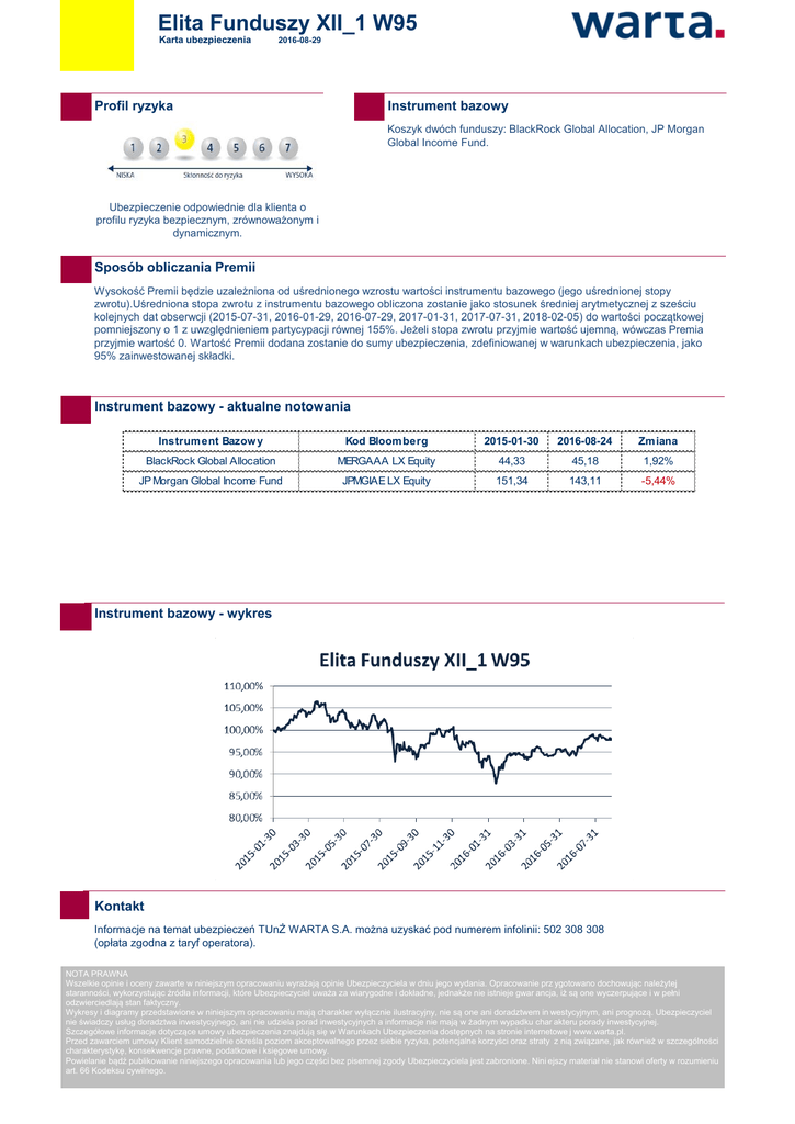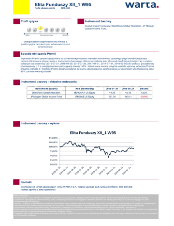 Elita Funduszy XII_1 W95 Karta ubezpieczenia 2016-08-29 Profil ryzyka Instrument bazowy Koszyk dwóch funduszy: BlackRock Global Allocation, JP Morgan Global Income Fund. Ubezpieczenie odpowiednie dla klienta o profilu ryzyka bezpiecznym, zrównoważonym i dynamicznym. Sposób obliczania Premii Wysokość Premii będzie uzależniona od uśrednionego wzrostu wartości instrumentu bazowego (jego uśrednionej stopy zwrotu).Uśredniona stopa zwrotu z instrumentu bazowego obliczona zostanie jako stosunek średniej arytmetycznej z sześciu kolejnych dat obserwcji (2015-07-31, 2016-01-29, 2016-07-29, 2017-01-31, 2017-07-31, 2018-02-05) do wartości początkowej pomniejszony o 1 z uwzględnieniem partycypacji równej 155%. Jeżeli stopa zwrotu przyjmie wartość ujemną, wówczas Premia przyjmie wartość 0. Wartość Premii dodana zostanie do sumy ubezpieczenia, zdefiniowanej w warunkach ubezpieczenia, jako 95% zainwestowanej składki. Instrument bazowy - aktualne notowania Instrument Bazow y Kod Bloomberg 2015-01-30 2016-08-24 Zmiana BlackRock Global Allocation MERGAAA LX Equity 44,33 45,18 1,92% JP Morgan Global Income Fund JPMGIAE LX Equity 151,34 143,11 -5,44% Instrument bazowy - wykres Kontakt Informacje na temat ubezpieczeń TUnŻ WARTA S.A. można uzyskać pod numerem infolinii: 502 308 308 (opłata zgodna z taryf operatora). NOTA PRAWNA Wszelkie opinie i oceny zawarte w niniejszym opracowaniu wyrażają opinie Ubezpieczyciela w dniu jego wydania. Opracowanie prz ygotowano dochowując należytej staranności, wykorzystując źródła informacji, które Ubezpieczyciel uważa za wiarygodne i dokładne, jednakże nie istnieje gwar ancja, iż są one wyczerpujące i w pełni odzwierciedlają stan faktyczny. Wykresy i diagramy przedstawione w niniejszym opracowaniu mają charakter wyłącznie ilustracyjny, nie są one ani doradztwem in westycyjnym, ani prognozą. Ubezpieczyciel nie świadczy usług doradztwa inwestycyjnego, ani nie udziela porad inwestycyjnych a informacje nie mają w żadnym wypadku char akteru porady inwestycyjnej. Szczegółowe informacje dotyczące umowy ubezpieczenia znajdują się w Warunkach Ubezpieczenia dostępnych na stronie internetowe j www.warta.pl. Przed zawarciem umowy Klient samodzielnie określa poziom akceptowalnego przez siebie ryzyka, potencjalne korzyści oraz straty z nią związane, jak również w szczególności charakterystykę, konsekwencje prawne, podatkowe i księgowe umowy. Powielanie bądź publikowanie niniejszego opracowania lub jego części bez pisemnej zgody Ubezpieczyciela jest zabronione. Nini ejszy materiał nie stanowi oferty w rozumieniu art. 66 Kodeksu cywilnego.
