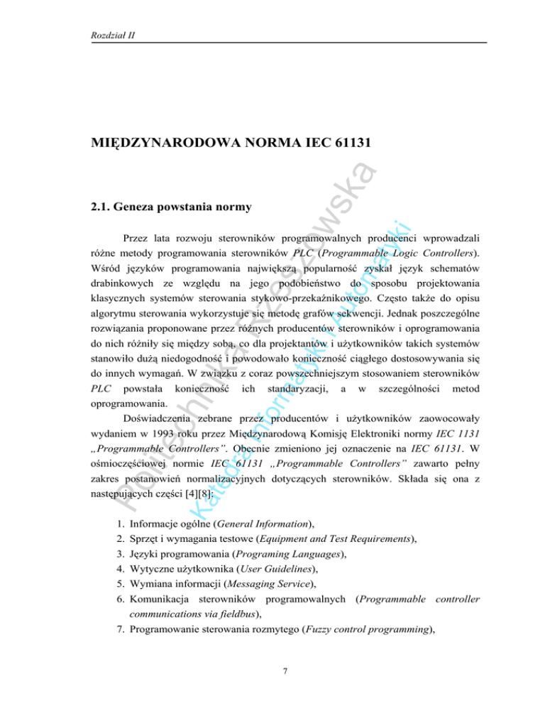 Rozdział II MIĘDZYNARODOWA NORMA IEC 61131 2.1. Geneza powstania normy Przez lata rozwoju sterowników programowalnych producenci wprowadzali różne metody programowania sterowników PLC (Programmable Logic Controllers). Wśród języków programowania największą popularność zyskał język schematów drabinkowych ze względu na jego podobieństwo do sposobu projektowania klasycznych systemów sterowania stykowo-przekaźnikowego. Często także do opisu algorytmu sterowania wykorzystuje się metodę grafów sekwencji. Jednak poszczególne rozwiązania proponowane przez różnych producentów sterowników i oprogramowania do nich różniły się między sobą, co dla projektantów i użytkowników takich systemów stanowiło dużą niedogodność i powodowało konieczność ciągłego dostosowywania się do innych wymagań. W związku z coraz powszechniejszym stosowaniem sterowników PLC powstała konieczność ich standaryzacji, a w szczególności metod oprogramowania. Doświadczenia zebrane przez producentów i użytkowników zaowocowały wydaniem w 1993 roku przez Międzynarodową Komisję Elektroniki normy IEC 1131 „Programmable Controllers”. Obecnie zmieniono jej oznaczenie na IEC 61131. W ośmioczęściowej normie IEC 61131 „Programmable Controllers” zawarto pełny zakres postanowień normalizacyjnych dotyczących sterowników. Składa się ona z następujących części [4][8]: 1. 2. 3. 4. 5. 6. Informacje ogólne (General Information), Sprzęt i wymagania testowe (Equipment and Test Requirements), Języki programowania (Programing Languages), Wytyczne użytkownika (User Guidelines), Wymiana informacji (Messaging Service), Komunikacja sterowników programowalnych (Programmable controller communications via fieldbus), 7. Programowanie sterowania rozmytego (Fuzzy control programming), 7 Rozdział II. Międzynarodowa norma IEC ... – geneza powstania normy. 8. Wytyczne dla aplikacji i implementacji programów sterowników programowalnych (Guidelines for the application and implementation of languages for programmable controlers). W pierwszych dwóch częściach normy, zawarte są postanowienia ogólne, w tym definicje głównych elementów sterownika oraz wymagania i badania sterowników. Warto w tym miejscu przytoczyć definicję sterownika programowalnego oraz systemu sterownika programowalnego. Według pierwszej części normy IEC 61131, brzmią one następująco: Definicja 2.1 Sterownik programowalny (PC) Cyfrowy system elektroniczny przeznaczony, do stosowania w środowisku przemysłowym, który posługuje się pamięcią programowalną, do wewnętrznego przechowywania zorientowanych na użytkownika instrukcji do implementowania specyficznych funkcji: logicznych, sekwencyjnych, taktujących, zliczających i arytmetycznych w celu sterowania przez cyfrowe lub analogowe wejścia i wyjścia, szeroką gamą maszyn i procesów. Zarówno PC, jak i związane z nim urządzenia peryferyjne są przeznaczone do łatwego połączenia w przemysłowy system sterowania i w prosty sposób spełniają funkcje przewidywane dla nich [1]. Definicja 2.2 System sterownika programowalnego (system PC) Konfiguracja zestawiana przez użytkownika, składająca się ze sterownika programowalnego i związanych z nim urządzeń peryferyjnych, która jest niezbędna do przewidywanego zautomatyzowanego systemu. Składa się ona z jednostek wzajemnie połączonych, za pomocą kabli i łączówek w instalacji stałej, a za pomocą kabli lub innych środków w przypadku przenośnych i niestacjonarnych urządzeń peryferyjnych (Rys. 2.1) [1]. 8 Rozdział II. Międzynarodowa norma IEC ... – geneza powstania normy. Rys.2.1. System sterownika programowalnego (system PLC) Należy zwrócić uwagę na rozbieżność w oznaczeniu sterownika. W literaturze oznacza się go jako PLC natomiast w normie PC. W niniejszym opracowaniu korzysta się z oznaczenia bardziej popularnego czyli PLC. Część trzecia normy, dotyczy języków programowania i stanowi jej najważniejszą część. Przede wszystkim dzięki niej ujednolicono koncepcję programowania PLC tak, aby w oparciu o wprowadzone zasady, użytkownik był w stanie programować bez większych trudności różne systemy PLC [4]. Czwarta część Wytyczne dla użytkownika jest poddana ankietyzacji powszechnej. Pozostałe części (5,6,7 i 8) są dopiero opracowywane [8]. 9 Rozdział II. Międzynarodowa norma IEC ... – programowanie sterowników PLC według normy 2.2. Programowanie sterowników PLC według normy Jak już wyżej wspomniano programowaniem sterowników PLC zajmuje się trzecia część normy: IEC 61131-3. Definiuje ona pojęcia podstawowe, zasady ogólne, model programowy i model komunikacyjny (wymiana danych między elementami oprogramowania) oraz podstawowe typy i struktury danych. W niniejszym rozdziale skupiono się przede wszystkim na sposobie programowania sterowników z wykorzystaniem grafu sekwencji SFC. W normie określono dwie grupy języków programowania: języki graficzne i tekstowe. Zdefiniowano je następująco: Definicja 2.3 Język graficzny Język programowania oparty na reprezentacji graficznej [1]. Definicja 2.4 Język tekstowy System składający się z prawidłowo zdefiniowanych, zwykle skończonych, zestawów znaków; reguł łączenia znaków w celu tworzenia wyrazów lub innych wyrażeń oraz specyficznego przyporządkowania znaczeń do słów lub wyrażeń [1]. W grupie języków tekstowych zdefiniowane zostały następujące języki [4]: • Język listy instrukcji IL (Instruction List), będący odpowiednikiem języka typu asembler, którego zbiór instrukcji obejmuje operacje logiczne, arytmetyczne, operacje relacji, jak również funkcje przerzutników, czasomierzy, liczników itp. A oto jego definicja: Definicja 2.5 Tekstowy język programowania, używający rozkazów w celu przedstawienia programu użytkowego systemu PC [1]. 10 Rozdział II. Międzynarodowa norma IEC ... – programowanie sterowników PLC wedłu