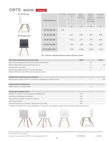 ORTE WOOD OT W 715 1N CPL / sklejka bond, keimo, nice fighter, valencia, pastel, lana aquarius, blazer, silvertex, fame, crisp, tk.powierzona skóra, remix, skóra powierzona 1 2 3 4 OT W 715 2N 657 670 687 760 OT W 715 3N 711 737 770 903 OT W 715 4N 723 749 781 929 OT W 3DH 715 * 939 1 004 1 097 1 473 Rodzaj tkaniny OT W 715 1N OT W 3DH 715 * 536 CPL - laminat, standard kolorów: biały, antracyt, czarny Warianty kolorystyczne konstrukcji KOD PLN Nogi z drewna litego jesion (kolorystyka wg próbnika Bejot) ● Nogi ze sklejki (kolorystyka wg próbnika bejot) ○ Łączniki nóg chromowane ● Łączniki nóg malowane zgodnie z paletą RAL Bejot ○ -60 # Nogi ze sklejki tylko przy domówieniach do wcześniejszych zamówień Dodatkowe wykończenia kubełków Wykończenie kubełka w okleinie naturalnej modyfikowanej: ORZECH, KLON ○ +93 Wyposażenie dodatkowe Stopki filcowe na twarde podłoże ● Oznaczenia kodów nazw Całość CPL / sklejka / okleina naturalna modyfikowana 1N Tapicerowana nakładka na siedzisko 2N Tapicerowana nakładka na siedzisko i oparcie 3N Całość tapicerowana 4N Przeszycia poziome na siedzisku i oparciu (tył oraz przód) 3D* * Model OTW 3DH 715 nie jest dostępny w tkaninach: nice, fighter, pastel, fame, tkanina i skóra powierzona Bejot zastrzega sobie prawo odmowy wykonania produktów katalogowych w powierzonych materiałach tapicerskich jeśli ich parametry techniczne i jakościowe nie pozwolą na ich zastosowanie ● STANDARD Powyższe ceny są cenami PLN NETTO - nie zawierają podatku VAT 52 ○ OPCJA