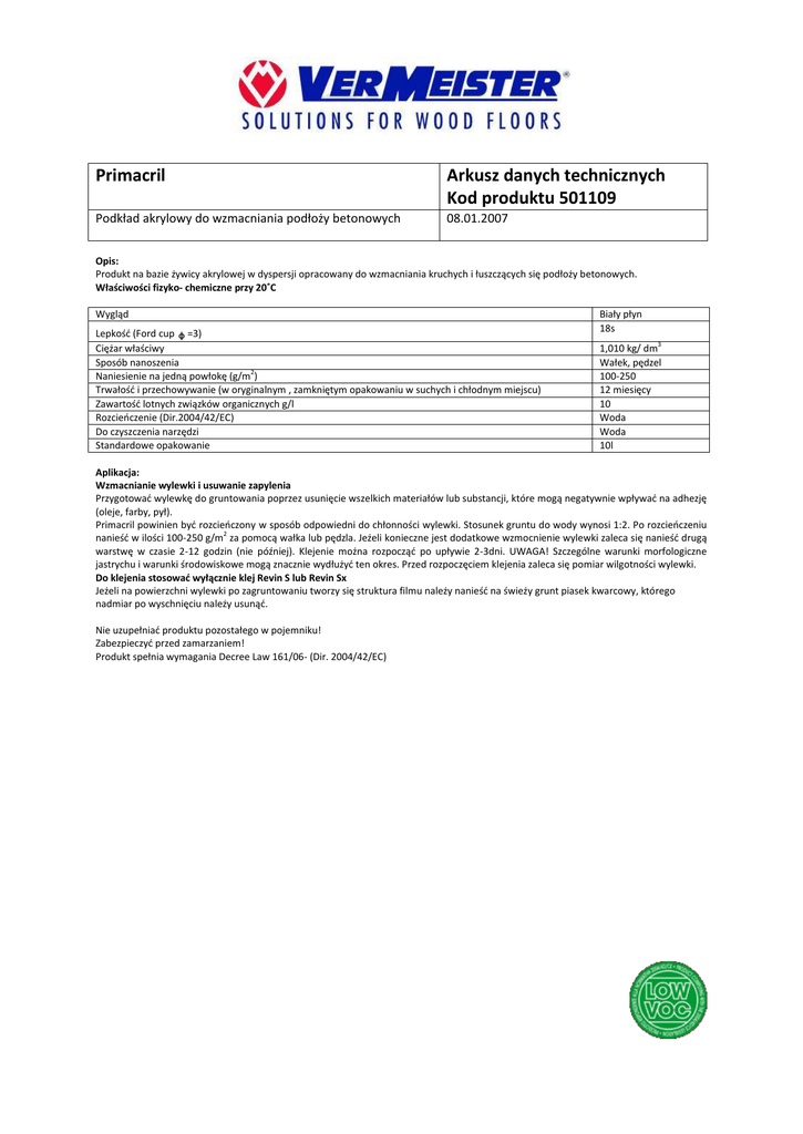 Primacril Arkusz danych technicznych Kod produktu 501109 Podkład akrylowy do wzmacniania podłoży betonowych 08.01.2007 Opis: Produkt na bazie żywicy akrylowej w dyspersji opracowany do wzmacniania kruchych i łuszczących się podłoży betonowych. Właściwości fizyko- chemiczne przy 20˚C Wygląd Lepkość (Ford cup ᵩ =3) Ciężar właściwy Sposób nanoszenia Naniesienie na jedną powłokę (g/m2) Trwałość i przechowywanie (w oryginalnym , zamkniętym opakowaniu w suchych i chłodnym miejscu) Zawartość lotnych związków organicznych g/l Rozcieńczenie (Dir.2004/42/EC) Do czyszczenia narzędzi Standardowe opakowanie Biały płyn 18s 1,010 kg/ dm3 Wałek, pędzel 100-250 12 miesięcy 10 Woda Woda 10l Aplikacja: Wzmacnianie wylewki i usuwanie zapylenia Przygotować wylewkę do gruntowania poprzez usunięcie wszelkich materiałów lub substancji, które mogą negatywnie wpływać na adhezję (oleje, farby, pył). Primacril powinien być rozcieńczony w sposób odpowiedni do chłonności wylewki. Stosunek gruntu do wody wynosi 1:2. Po rozcieńczeniu nanieść w ilości 100-250 g/m2 za pomocą wałka lub pędzla. Jeżeli konieczne jest dodatkowe wzmocnienie wylewki zaleca się nanieść drugą warstwę w czasie 2-12 godzin (nie później). Klejenie można rozpocząć po upływie 2-3dni. UWAGA! Szczególne warunki morfologiczne jastrychu i warunki środowiskowe mogą znacznie wydłużyć ten okres. Przed rozpoczęciem klejenia zaleca się pomiar wilgotności wylewki. Do klejenia stosować wyłącznie klej Revin S lub Revin Sx Jeżeli na powierzchni wylewki po zagruntowaniu tworzy się struktura filmu należy nanieść na świeży grunt piasek kwarcowy, którego nadmiar po wyschnięciu należy usunąć. Nie uzupełniać produktu pozostałego w pojemniku! Zabezpieczyć przed zamarzaniem! Produkt spełnia wymagania Decree Law 161/06- (Dir. 2004/42/EC)