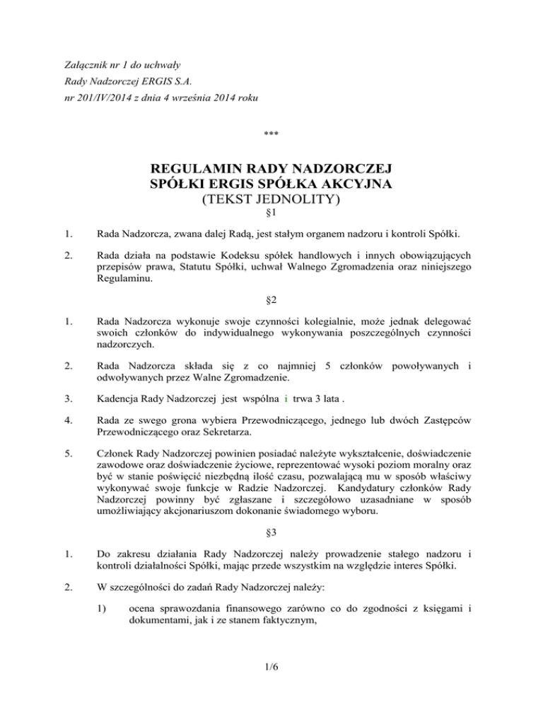 Załącznik nr 1 do uchwały Rady Nadzorczej ERGIS S.A. nr 201/IV/2014 z dnia 4 września 2014 roku *** REGULAMIN RADY NADZORCZEJ SPÓŁKI ERGIS SPÓŁKA AKCYJNA (TEKST JEDNOLITY) §1 1. Rada Nadzorcza, zwana dalej Radą, jest stałym organem nadzoru i kontroli Spółki. 2. Rada działa na podstawie Kodeksu spółek handlowych i innych obowiązujących przepisów prawa, Statutu Spółki, uchwał Walnego Zgromadzenia oraz niniejszego Regulaminu. §2 1. Rada Nadzorcza wykonuje swoje czynności kolegialnie, może jednak delegować swoich członków do indywidualnego wykonywania poszczególnych czynności nadzorczych. 2. Rada Nadzorcza składa się z co najmniej 5 członków powoływanych i odwoływanych przez Walne Zgromadzenie. 3. Kadencja Rady Nadzorczej jest wspólna i trwa 3 lata . 4. Rada ze swego grona wybiera Przewodniczącego, jednego lub dwóch Zastępców Przewodniczącego oraz Sekretarza. 5. Członek Rady Nadzorczej powinien posiadać należyte wykształcenie, doświadczenie zawodowe oraz doświadczenie życiowe, reprezentować wysoki poziom moralny oraz być w stanie poświęcić niezbędną ilość czasu, pozwalającą mu w sposób właściwy wykonywać swoje funkcje w Radzie Nadzorczej. Kandydatury członków Rady Nadzorczej powinny być zgłaszane i szczegółowo uzasadniane w sposób umożliwiający akcjonariuszom dokonanie świadomego wyboru. §3 1. Do zakresu działania Rady Nadzorczej należy prowadzenie stałego nadzoru i kontroli działalności Spółki, mając przede wszystkim na względzie interes Spółki. 2. W szczególności do zadań Rady Nadzorczej należy: 1) ocena sprawozdania finansowego zarówno co do zgodności z księgami i dokumentami, jak i ze stanem faktycznym, 1/6 2) ocena sprawozdania Zarządu z działalności Spółki oraz wniosków Zarządu dotyczących podziału zysku albo pokrycia straty, 3) składanie Walnemu Zgromadzeniu corocznego pisemnego sprawozdania z wyników czynności, o których mowa w pkt. l i 2, 4) wybór biegłego rewidenta przeprowadzającego badanie sprawozdania finansowego Spółki, 5) zatwierdzanie planów działalności gospodarczej, planów finansowych, marketingowych, jak również rozpatrywanie sprawozdań Zarządu z wykonania tych planów, 6) powoływanie i odwoływanie członków Zarządu, 7) ustalanie liczby członków Zarządu Spółki w granicach określonych w Statucie Spółki, 8) ustalanie zasad i warunków wynagradzania członków Zarządu Spółki oraz postanowień umów łączących członków Zarządu ze Spółką, z zastrzeżeniem §4 ust. 3 poniżej, 9) zawieszanie w czynnościach, z ważnych powodów, poszczególnych lub wszystkich członków Zarządu, 10) delegowanie członka lub członków Rady Nadzorczej, na okres nie dłuższy niż trzy miesiące, do czasowego wykonywania czynności członków Zarządu, którzy zostali odwołani, złożyli rezygnację albo z innych przyczyn nie mogą sprawować swoich czynności, 11) wyrażanie zgody na zaciąganie zobowiązań lub też zbywanie mienia, nieujęte w budżecie Spółki jeżeli łączna kwota tych zobowiązań lub zbywanego mienia przekracza kwotę 2.000.000 zł w ciągu roku, 12) wyrażanie zgody na tworzenie oddziałów oraz nabywanie lub obejmowanie akcji lub udziałów w spółkach handlowych, jak również przystąpienie do spółek prawa handlowego i cywilnego, 13) uchwalanie Regulaminu Rady Nadzorczej, 14) zatwierdzanie Regulaminu Zarządu, 15) zatwierdzanie Regulaminu Organizacyjnego Spółki, 16) wyrażanie zgody na nabywanie i zbywanie nieruchomości, użytkowania wieczystego lub udziału w nieruchomości. §4 1. Rada Nadzorcza określa liczbę członków Zarządu oraz ich funkcje. 2/6 2. Rada Nadzorcza reprezentuje Spółkę przy zawieraniu wszelkich umów z członkami Zarządu oraz w razie sporów z nimi. Do reprezentowania Rady w umowach z członkami Zarządu uprawniony jest Przewodniczący Rady. Rada Nadzorcza może upoważnić, w drodze uchwały, jednego lub więcej członków do dokonania takich czynności prawnych. 3. Ustalając wynagrodzenie członków Zarządu Rada Nadzorcza określa je uwzględniając rekomendację komitetu wynagrodzeń oraz jego motywacyjny charakter oraz efektywne zarządzanie Spółką. Wynagrodzenie powinno odpowiadać wielkości przedsiębiorstwa Spółki, pozostawać w rozsądnym stosunku do wyników ekonomicznych Spółki oraz wiązać się z zakresem odpowiedzialności wynikającej z pełnionej funkcji. §5 1. Rada Nadzorcza może w każdym czasie żądać od Zarządu i pracowników Spółki wszelkich sprawozdań i wyjaśnień, przeglądać księgi, dokumenty oraz sprawdzać stan majątkowy Spółki. 2. W ramach wykonywania swych ustawowych i statutowych kompetencji Rada Nadzorcza może korzystać z pomocy ekspertów, jak również zlecać na koszt Spółki opracowania, ekspertyzy oraz opinie, w tym opinie prawne. §6 Rada Nadzorcza wykonuje swoje zadania przez czynności nadzorczo-kontrolne i doradcze. §7 Rada sprawuje kontrolę nad realizacją przez Zarząd Spółki uchwał Walnych Zgromadzeń i wytycznych Rady. §8 1. Posiedzenia Rady Nadzorczej zwołuje Przewodniczący Rady, z własnej inicjatywy lub na wniosek uprawnionych, w miarę potrzeby, nie rzadziej jednak niż raz na kwartał. 2. W przypadku niemożności zwołania posiedzenia przez Przewodniczącego, posiedzenie zwołuje Zastępca Przewodniczącego lub inna osoba wskazana przez Przewodniczącego. 3. Uprawniony do złożenia wniosku o zwołanie posiedzenia Rady Nadzorczej jest każdy z członków Rady oraz Zarząd Spółki. 4. Wniosek o zwołanie posiedzenia Rady Nadzorczej powinien zostać złożony na ręce Przewodniczącego lub Zastępcy Przewodniczącego Rady i musi zawierać proponowany porządek obrad, nie wymaga jednak uzasadnienia. 5. Posiedzenie powinno zostać zwołane w terminie dwóch tygodni od dnia otrzymania wniosku, w przeciwnym wypadku wnioskodawca może zwołać je samodzielnie, podając datę, miejsce i proponowany porządek obrad. 3/6